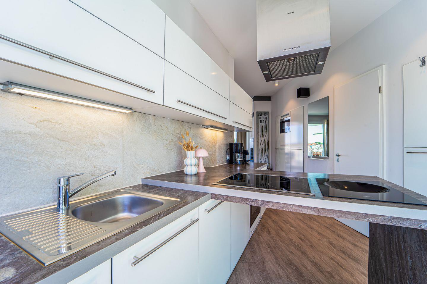 Die offene Küche ist umfassend ausgestattet: Neben einem 4-Platten-Herd findest Du ein zusätzliches Wok-Kochfeld, Backofen, Kühlschrank mit Gefrierfach, Geschirrspüler, Mikrowelle, Toaster, Wasserkocher, Kaffeemaschine und Nespresso-Maschine. Geschirr, Besteck und Kochutensilien sind selbstverständlich vorhanden.