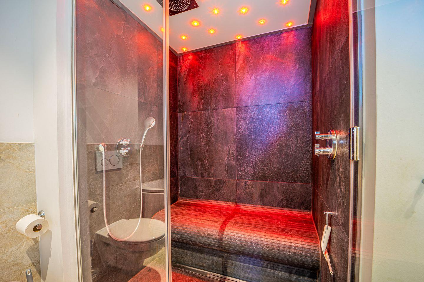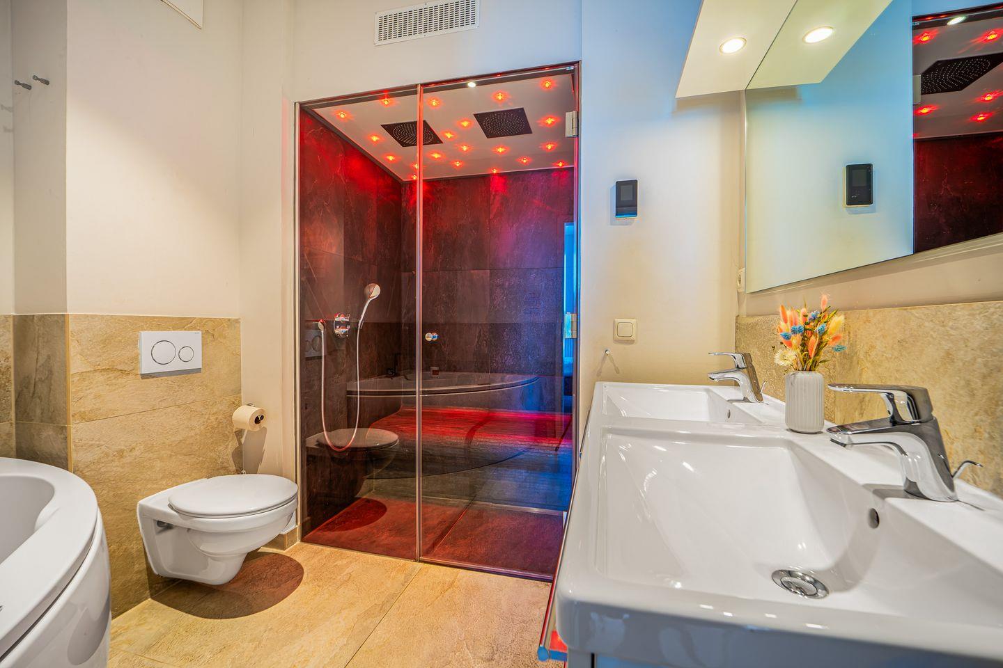 Das Badezimmer direkt am Schlafzimmer ist mit einer Whirlpoolbadewanne, einem Dampfbad mit integrierter Doppelregendusche, WC und Föhn ausgestattet – Deine private Wellnessoase.