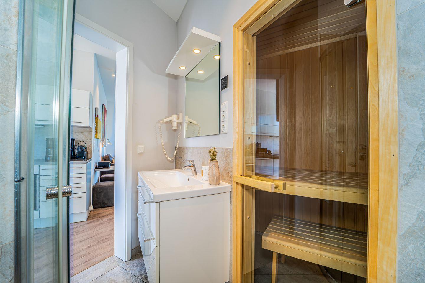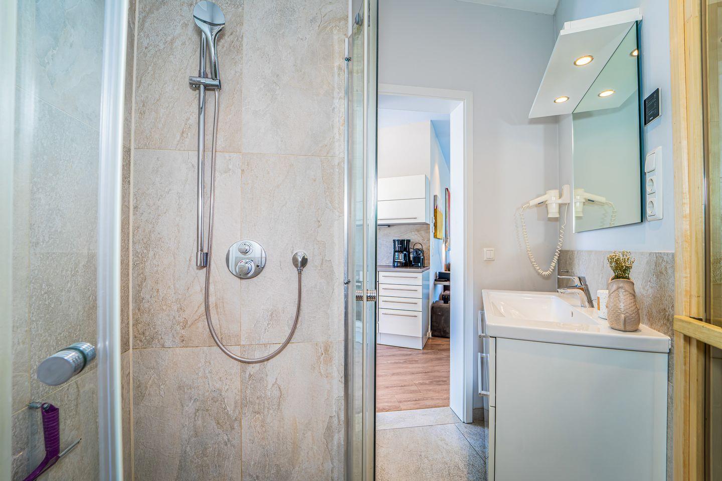 Das zweite Badezimmer verfügt über eine großzügige bodengleiche Dusche, WC, Föhn und eine eigene Sauna – perfekt, um nach einem Strandtag zu entspannen.