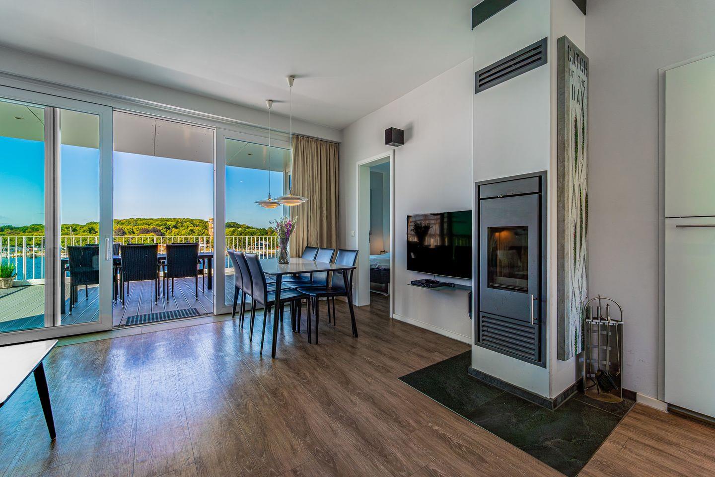 Der stilvolle Wohnbereich ist hochwertig eingerichtet mit Sofa, Sesseln, HiFi-Anlage, Blu-ray-Player und einem Flachbild-TV. Für behagliche Stunden sorgt der Kaminofen, der den Raum in warmes Licht taucht. Das Sofa lässt sich bei Bedarf zu zwei weiteren Schlafplätzen umbauen.