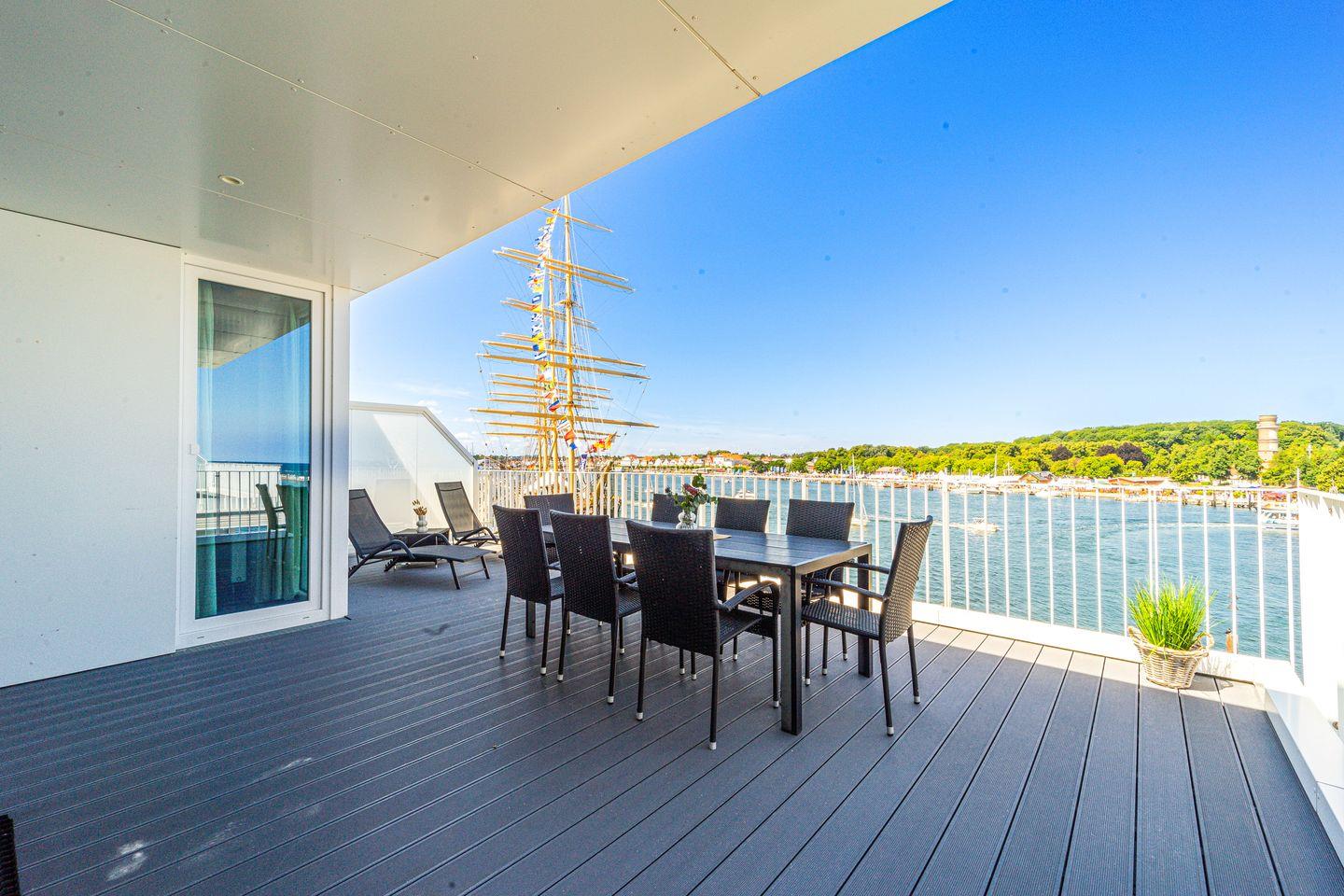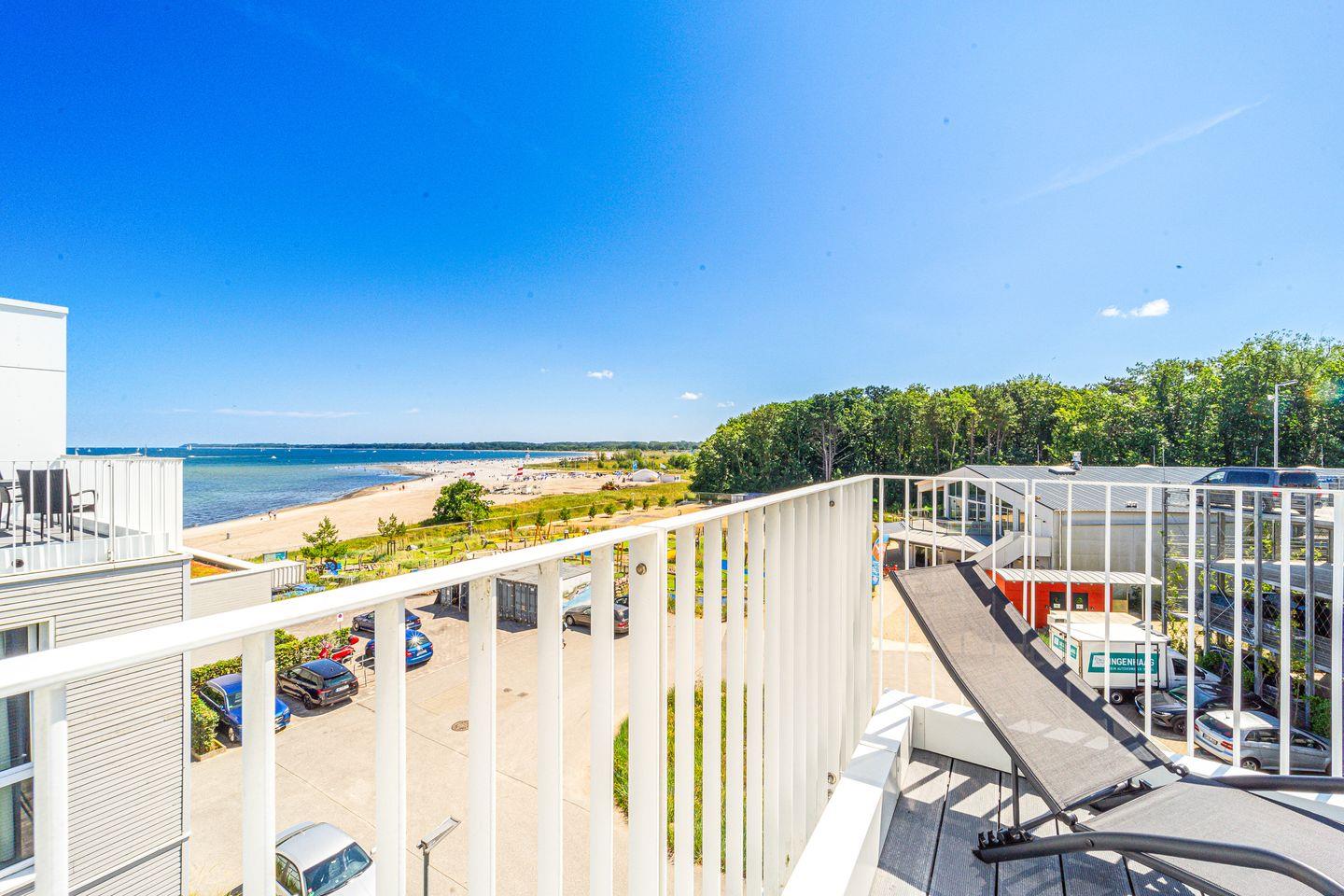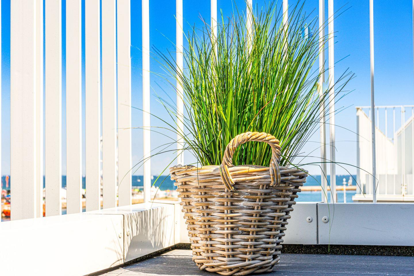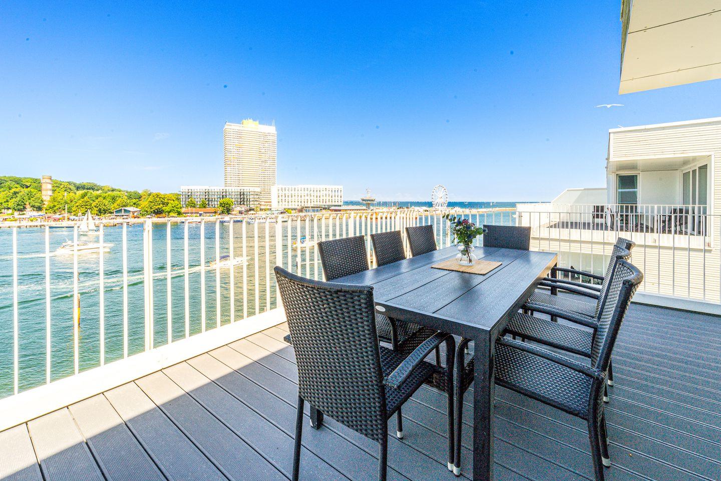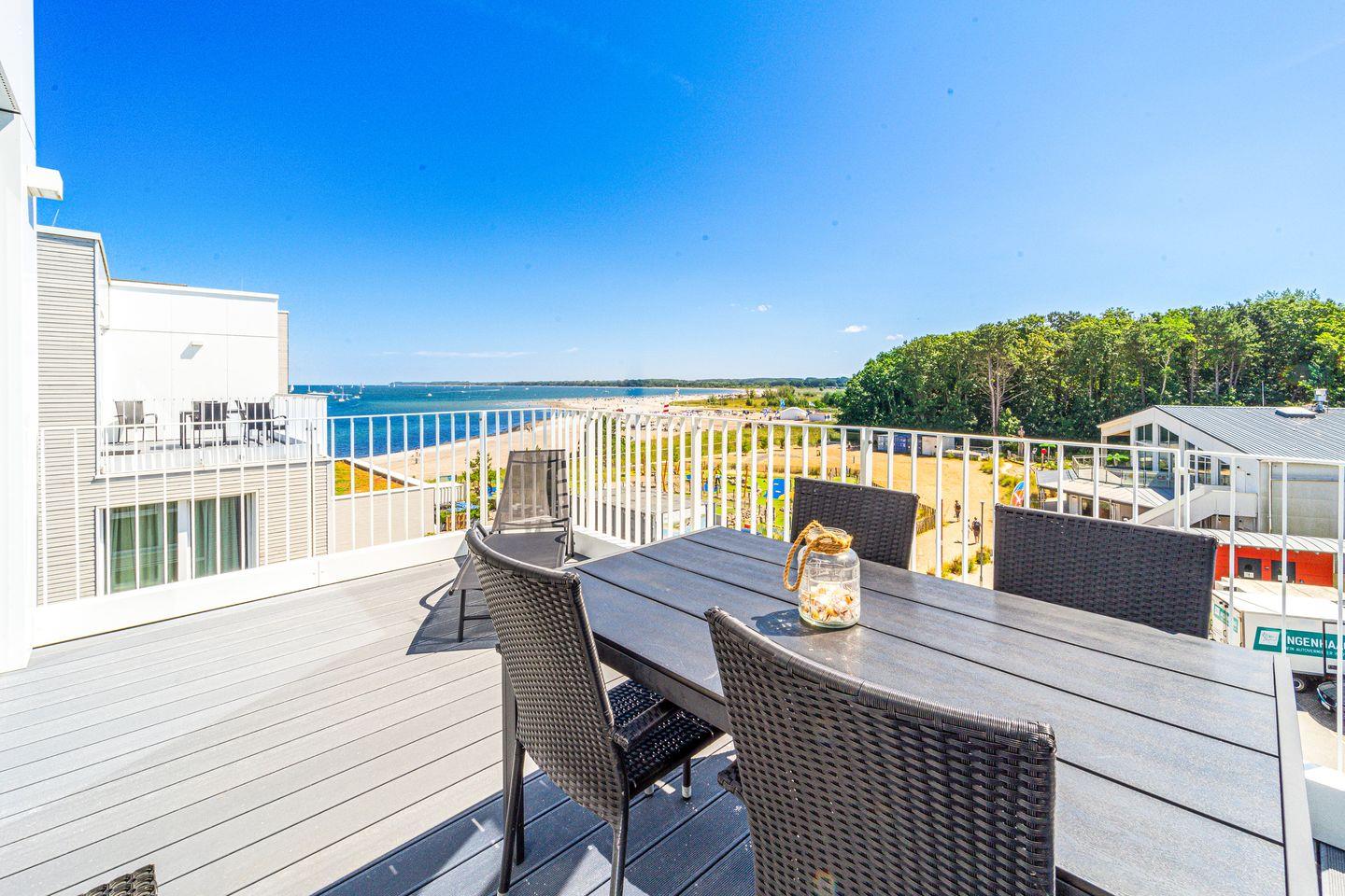 Die Dachterrassen sind nach zwei Seiten ausgerichtet, sodass Du sowohl den Strand als auch den Segelhafen mit der Travemündung überblickst. Das Museumsschiff „Passat“ und die vorbeiziehenden Fähren bieten ein faszinierendes Panorama. Mit Sonnenliegen und Gartenmöbeln ausgestattet, sind die Terrassen der perfekte Ort, um Sonne zu tanken und Deinen Urlaubstag entspannt draußen zu verbringen.
