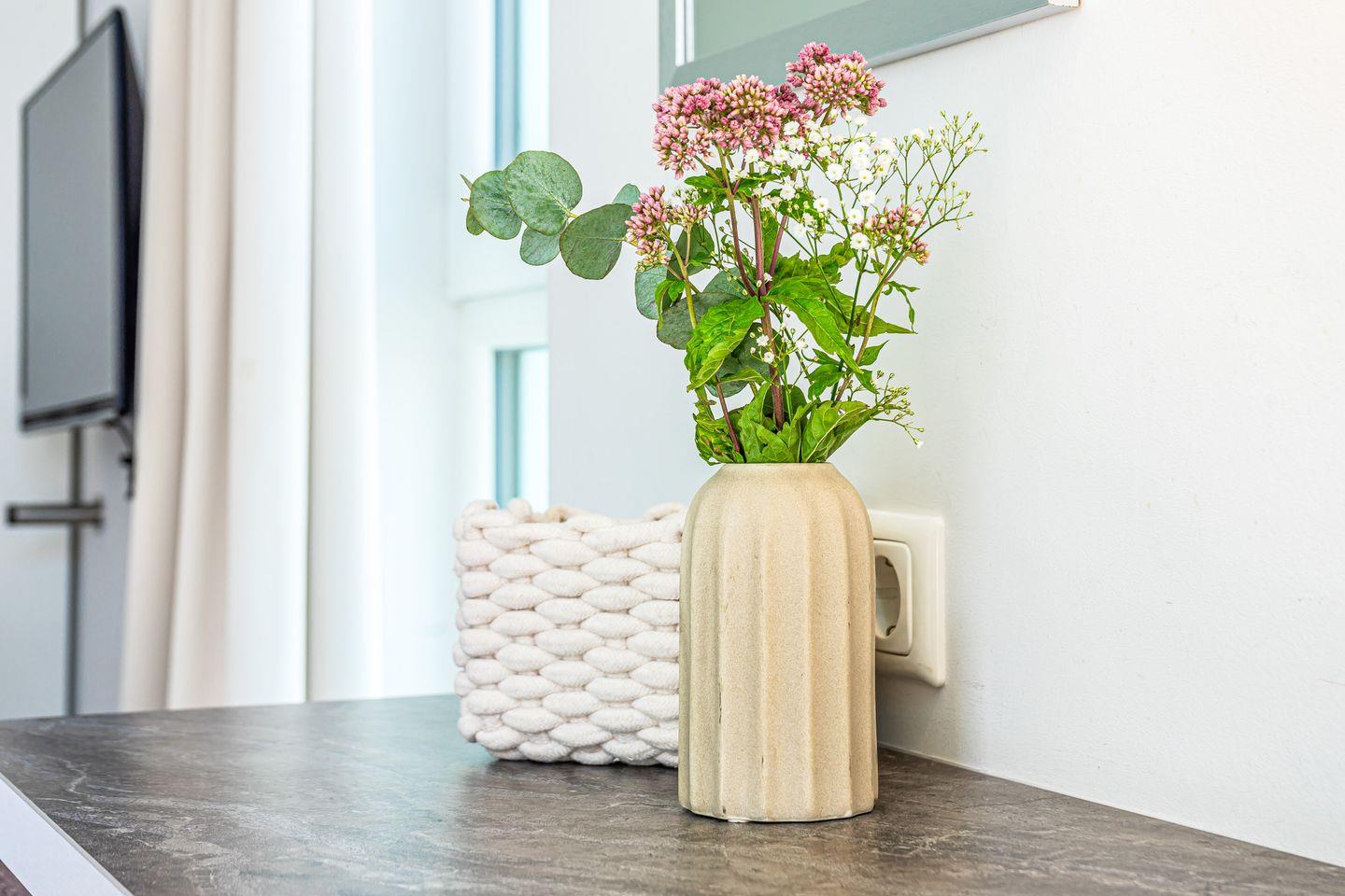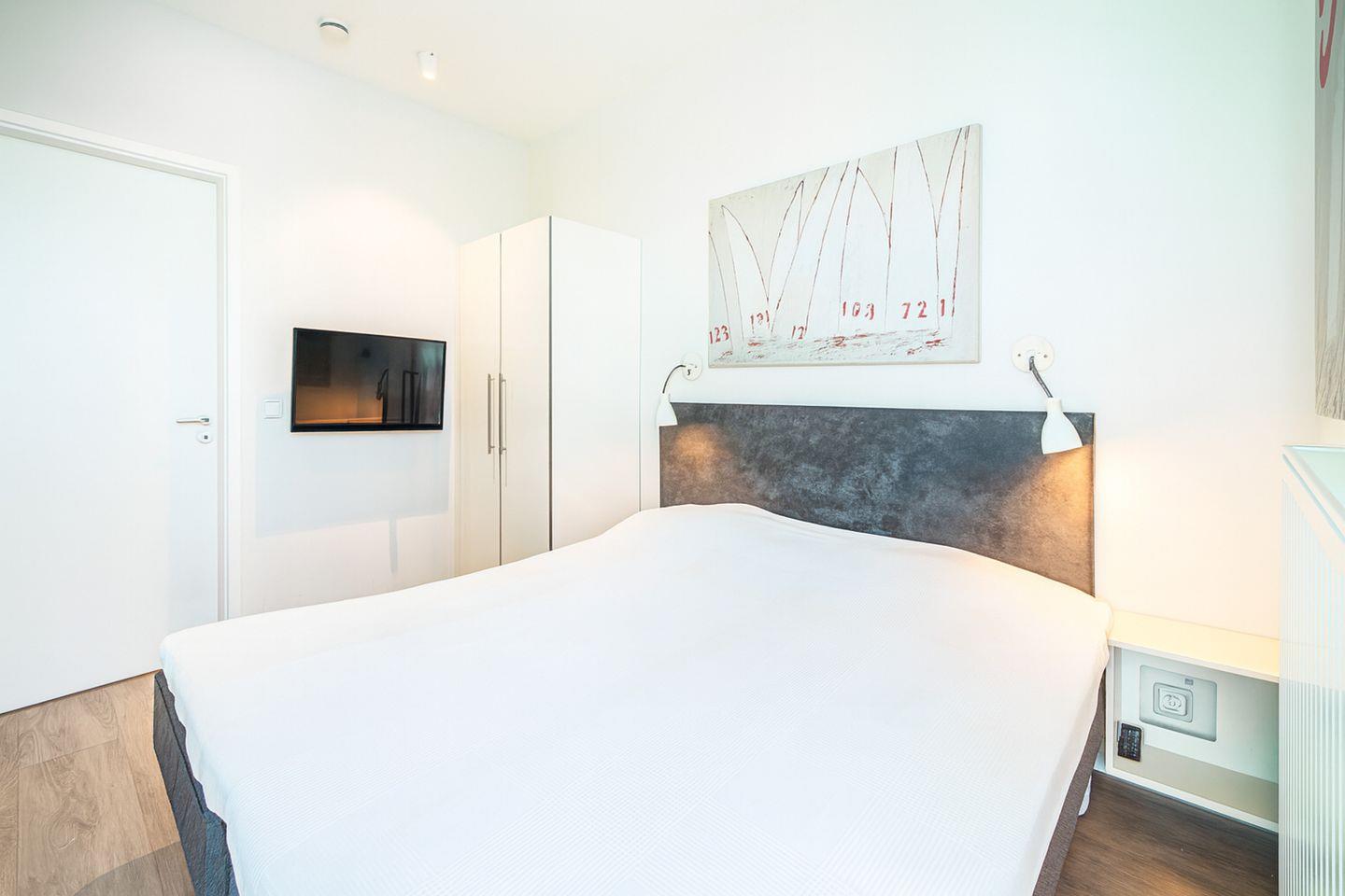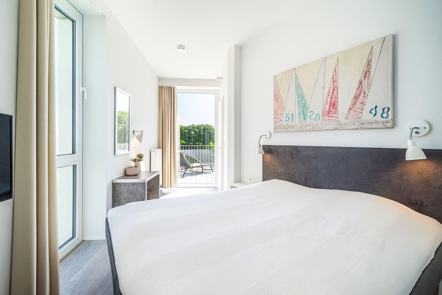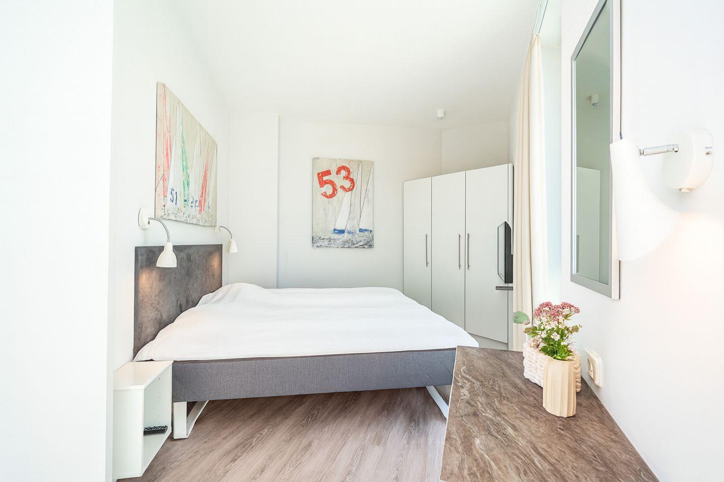 Die beiden Schlafzimmer bieten Dir erholsamen Schlaf und viel Stauraum. Eines der Schlafzimmer verfügt über eine eigene Tür zu einer Dachterrasse, sodass Du direkt vom Bett aus ins Freie treten und die Meeresluft genießen kannst.