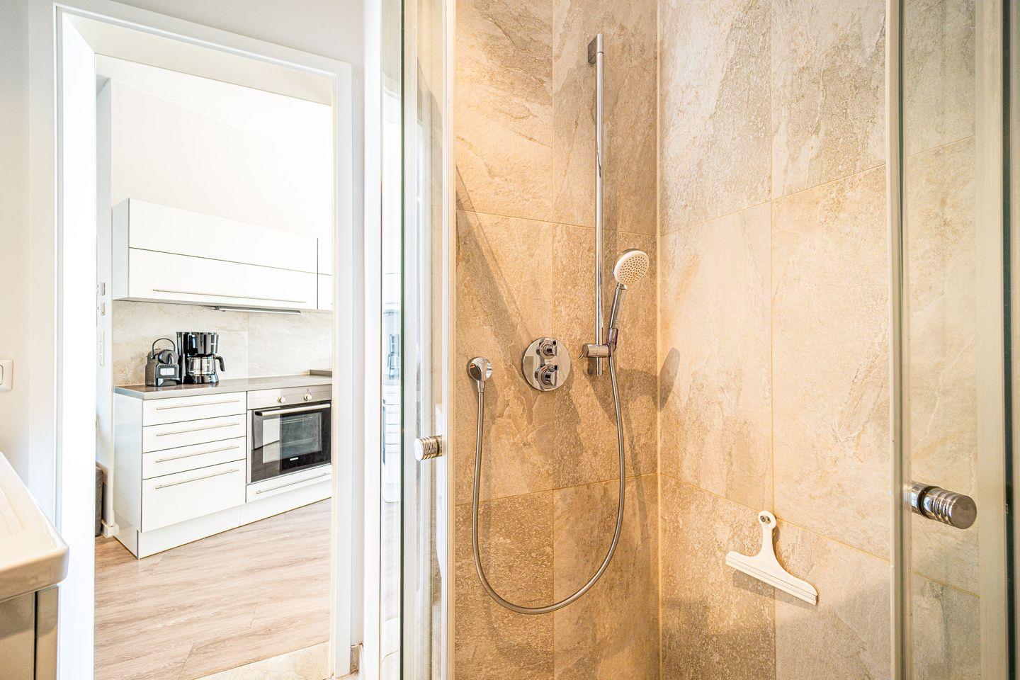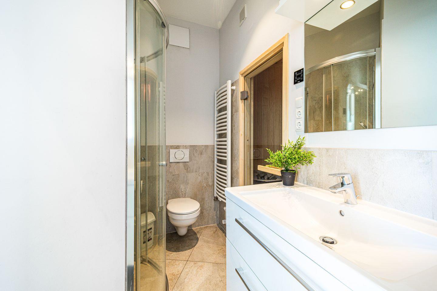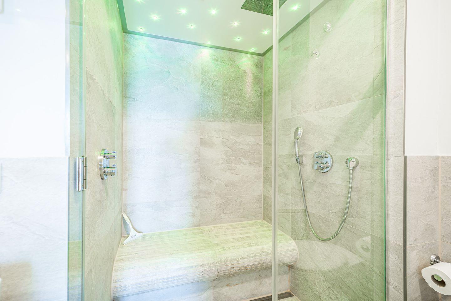 Das zweite Badezimmer ist mit bodengleicher Dusche, WC, Föhn und einer Sauna ausgestattet – perfekt zum Entspannen nach einem Tag am Strand.