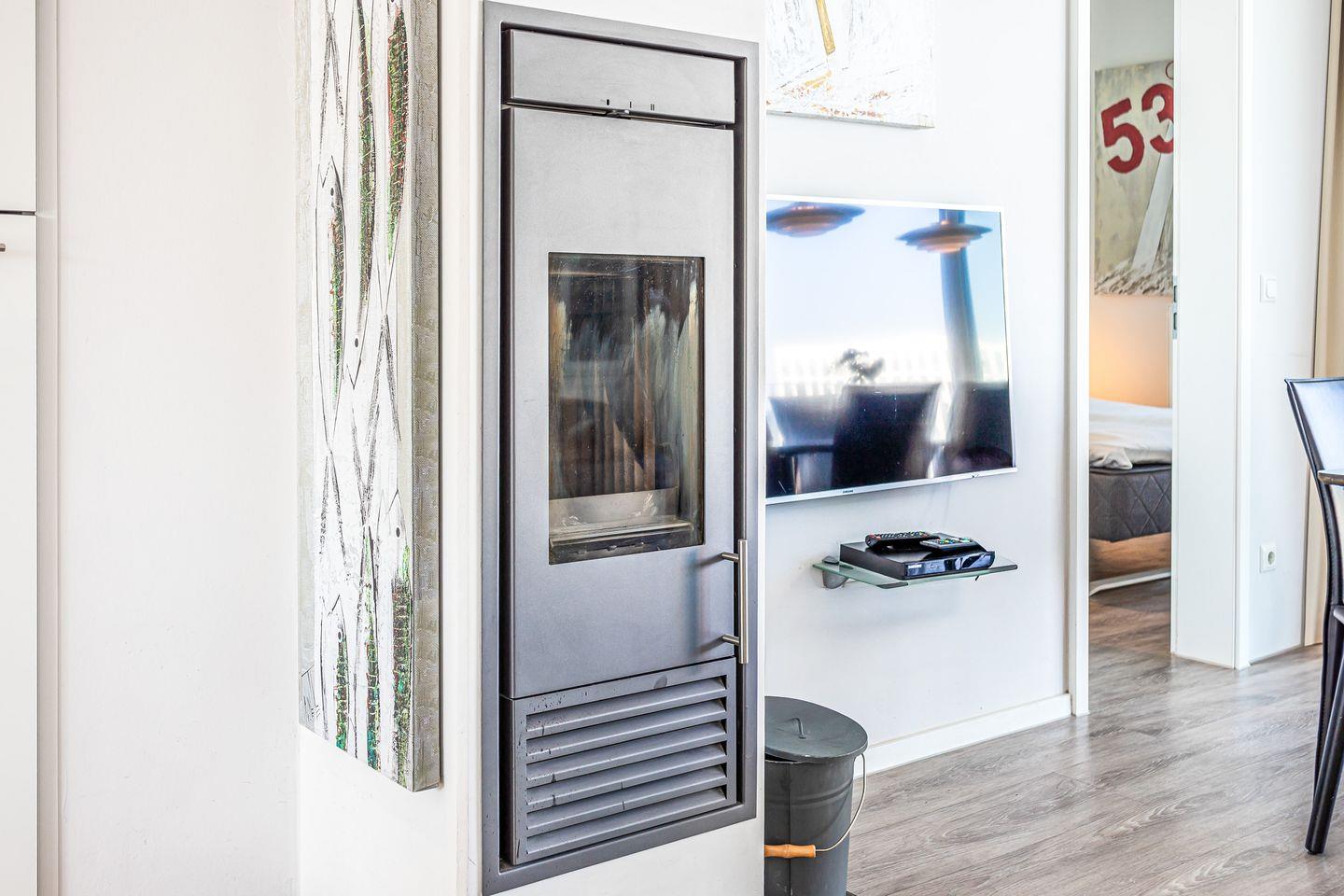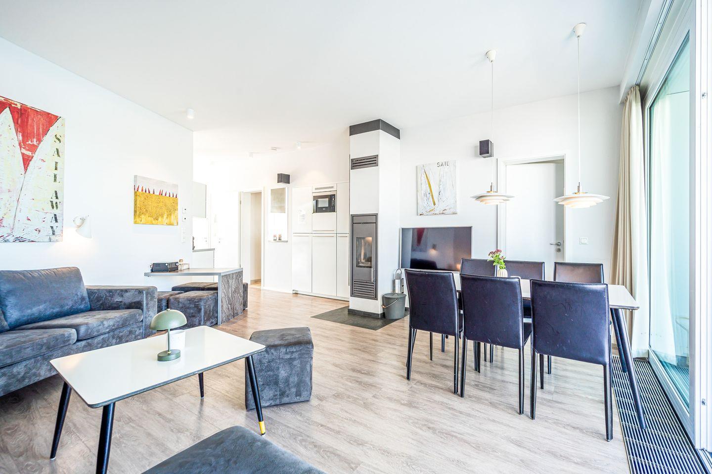 Im Wohnbereich erwartet Dich eine stilvolle Einrichtung mit Sofa, Sesseln, HiFi-Anlage, Blu-ray-Player und zwei Flachbild-TVs. Für behagliche Abende sorgt der Kaminofen, der mit seinem warmen Schein für eine besonders gemütliche Atmosphäre sorgt. Das Sofa kann zudem zu zwei weiteren Schlafplätzen umgebaut werden.