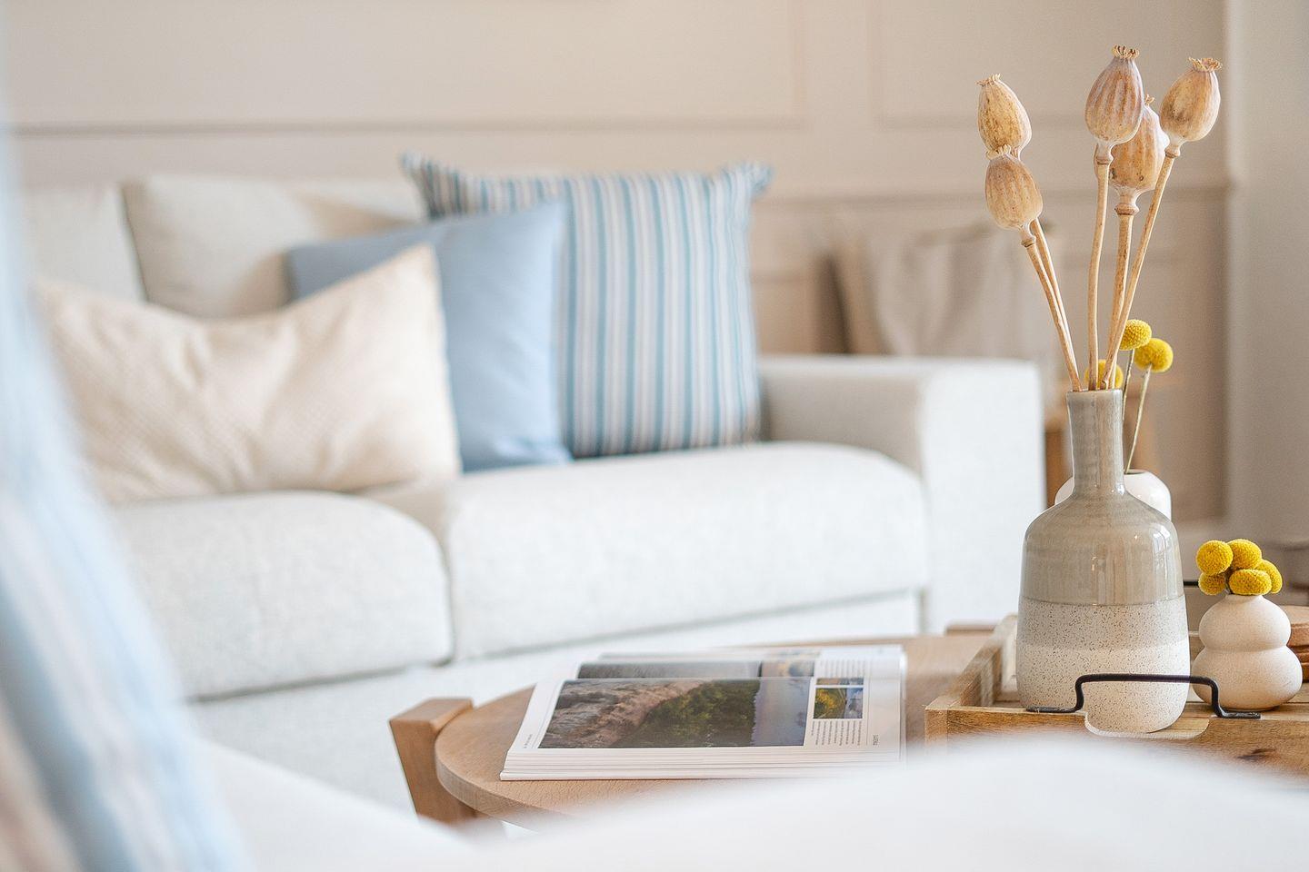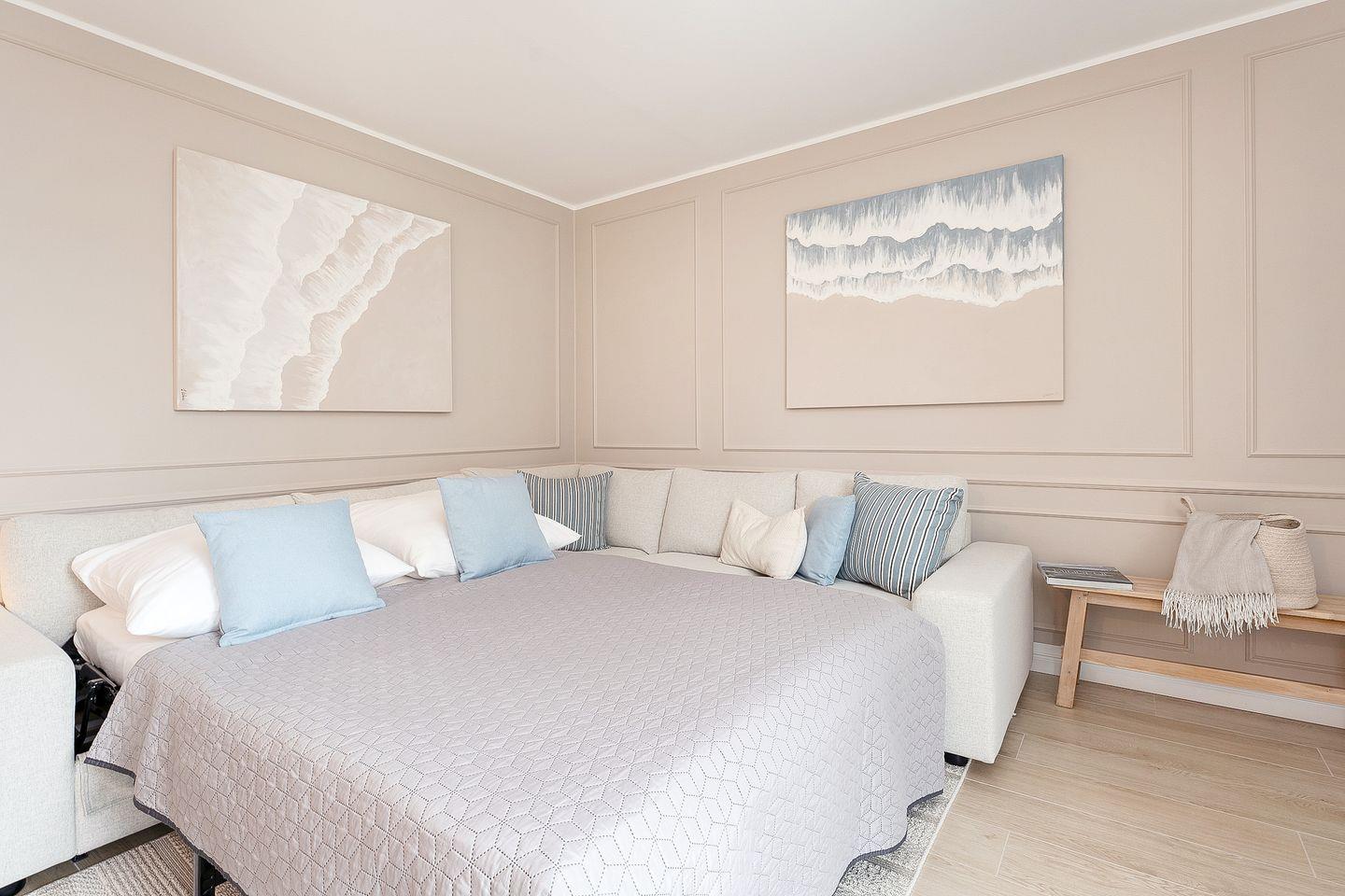 Das helle Wohnzimmer lädt mit seiner gemütlichen Sitzecke und einem hochwertigen Flachbild-TV zu entspannten Abenden ein. Ein bequemes Schlafsofa (ca. 140 x 200 cm) bietet zwei zusätzliche Schlafmöglichkeiten.