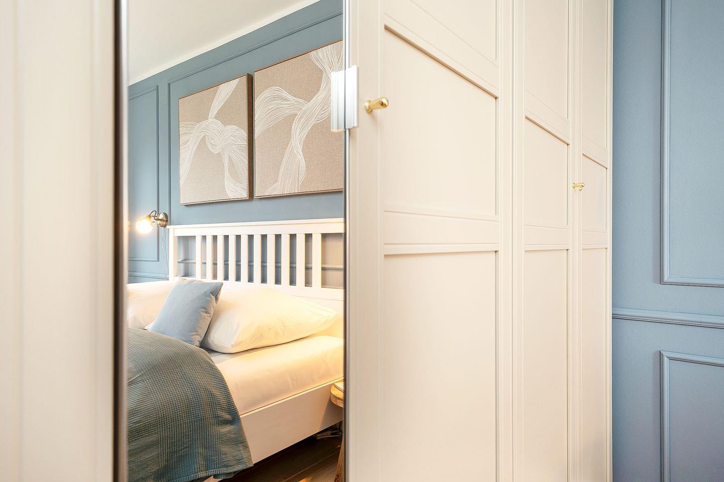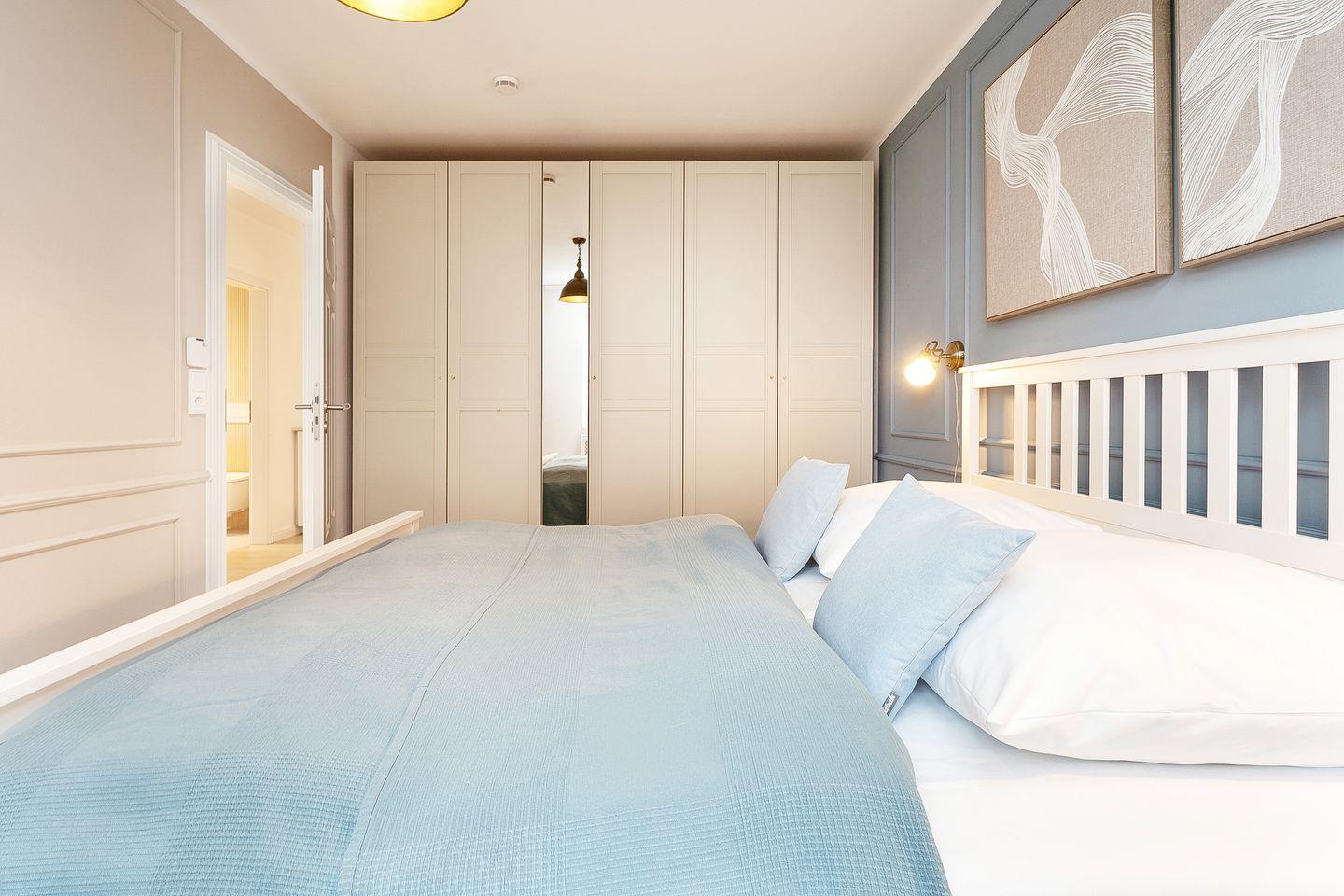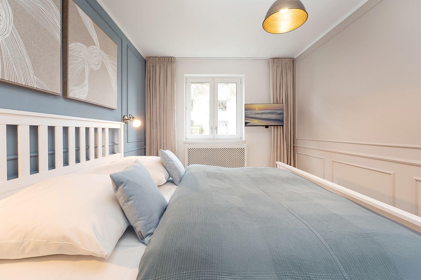 Das Schlafzimmer bietet ein komfortables Doppelbett (2 x 90 x 200 cm) und stilvolles Interieur. Ein geräumiger Kleiderschrank sorgt für genügend Stauraum für Ihre Urlaubsgarderobe.