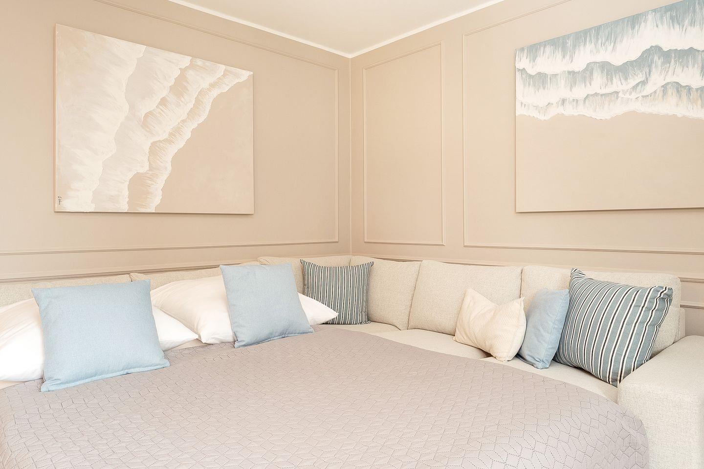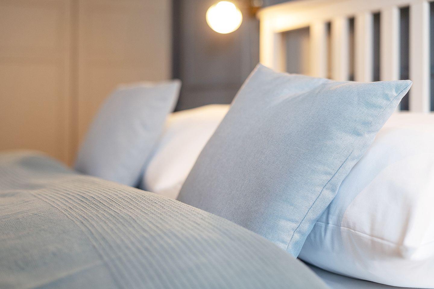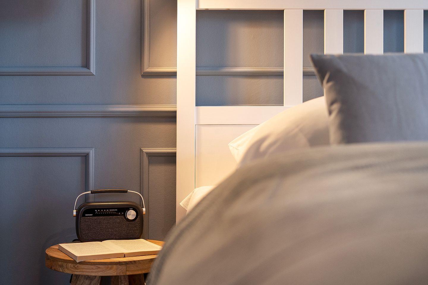 Das Schlafzimmer bietet ein komfortables Doppelbett (2 x 90 x 200 cm) und stilvolles Interieur. Ein geräumiger Kleiderschrank sorgt für genügend Stauraum für Ihre Urlaubsgarderobe.