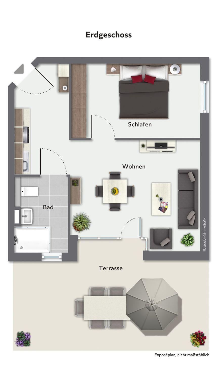 Sie verfügt über ein Wohnzimmer mit offener Küche, ein separates Schlafzimmer, ein Badezimmer sowie eine großzügige Terrasse.