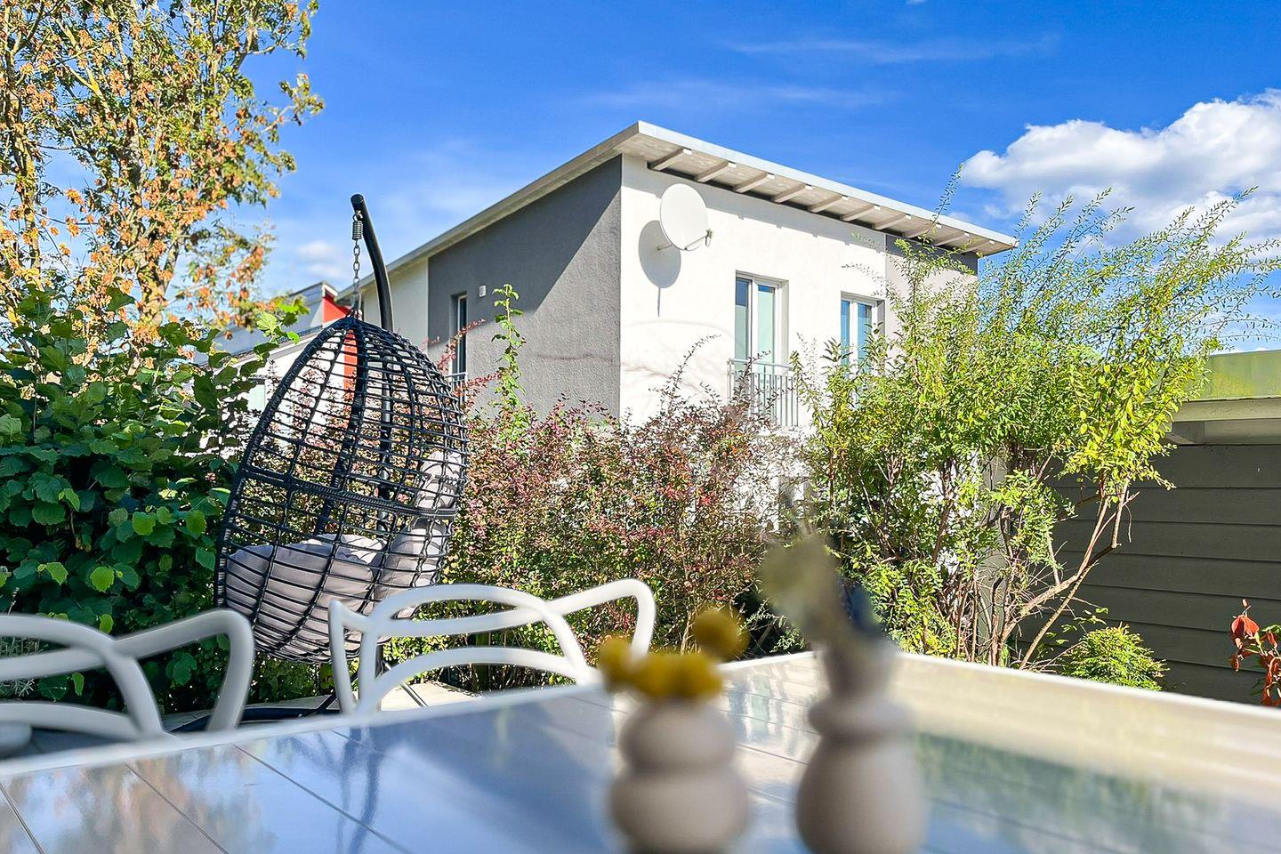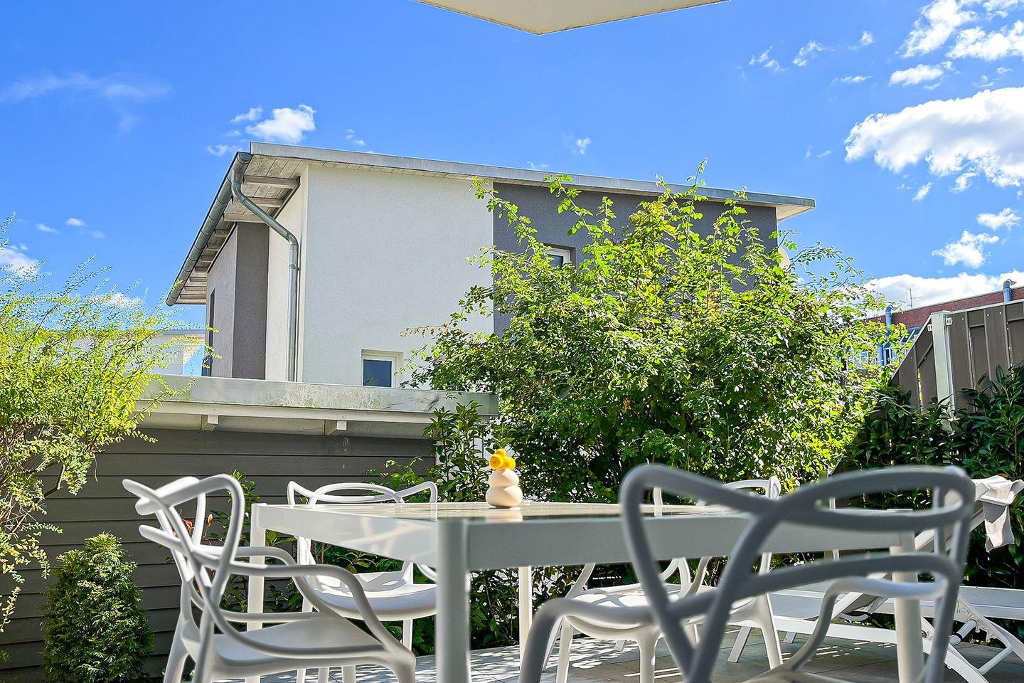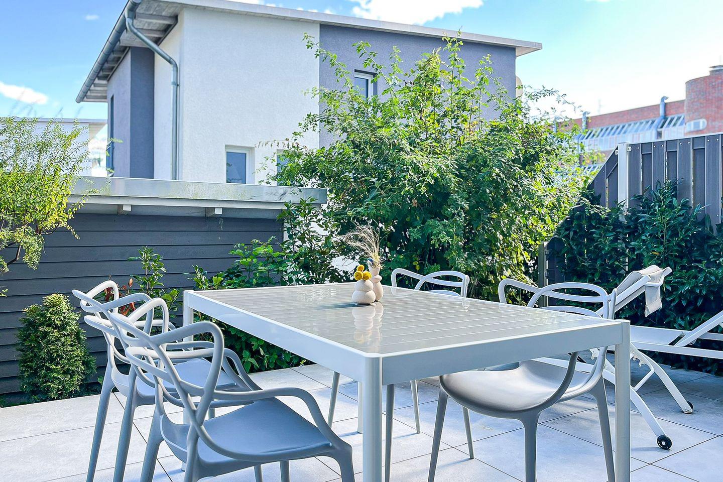 Bodentiefe Fenster verleihen dem Raum eine einladende, freundliche Atmosphäre. Von hier aus gelangen Sie auf die möblierte Terrasse mit Gartenmöbeln, die viel Platz für gemeinsame Mahlzeiten oder erholsame Stunden im Freien bietet.