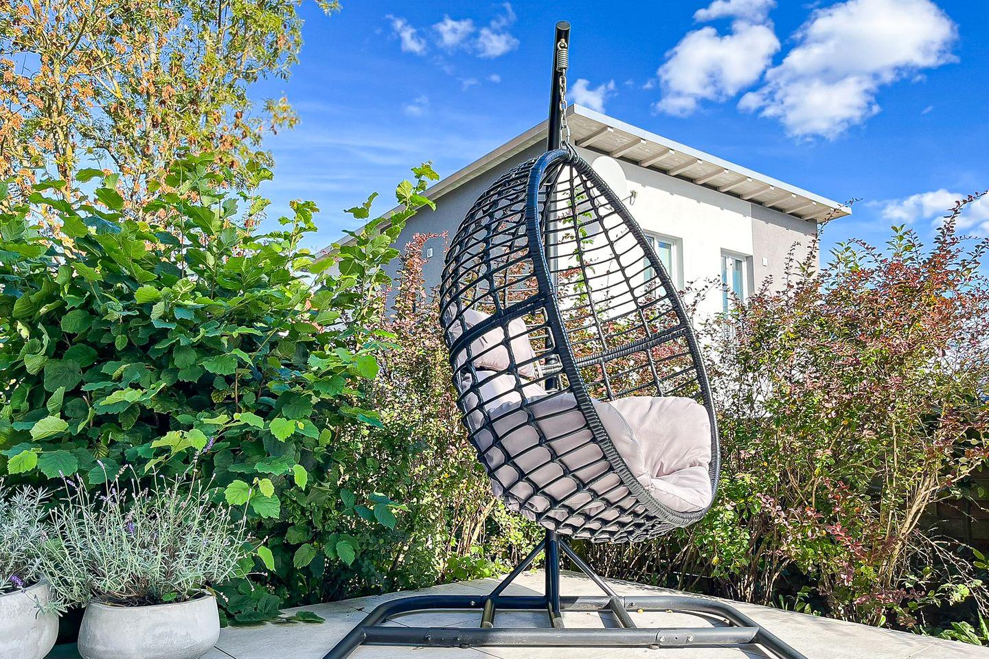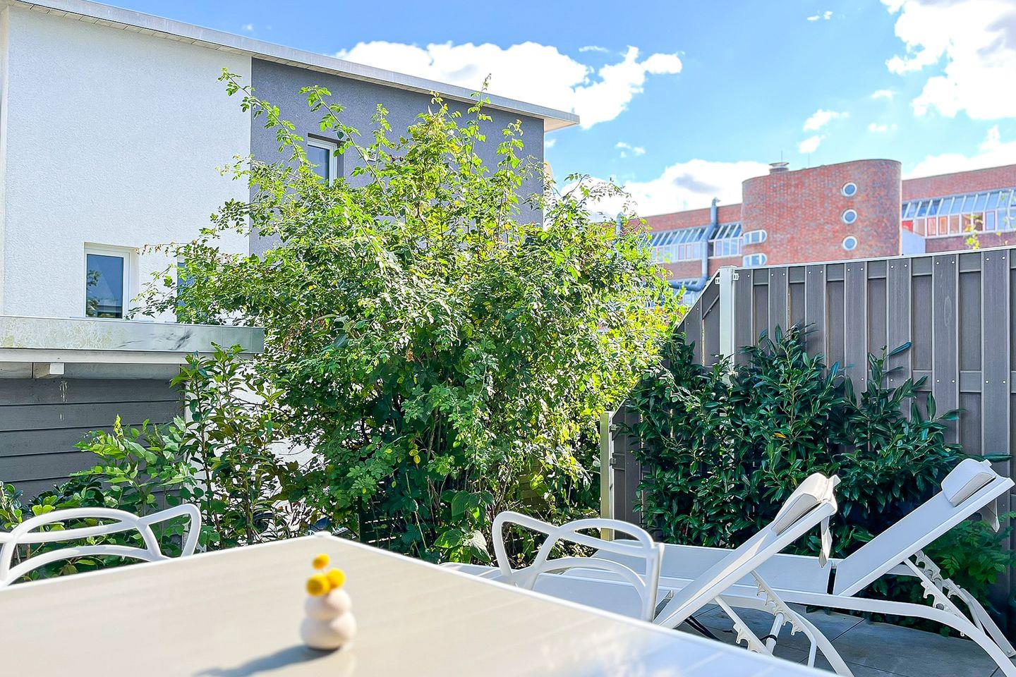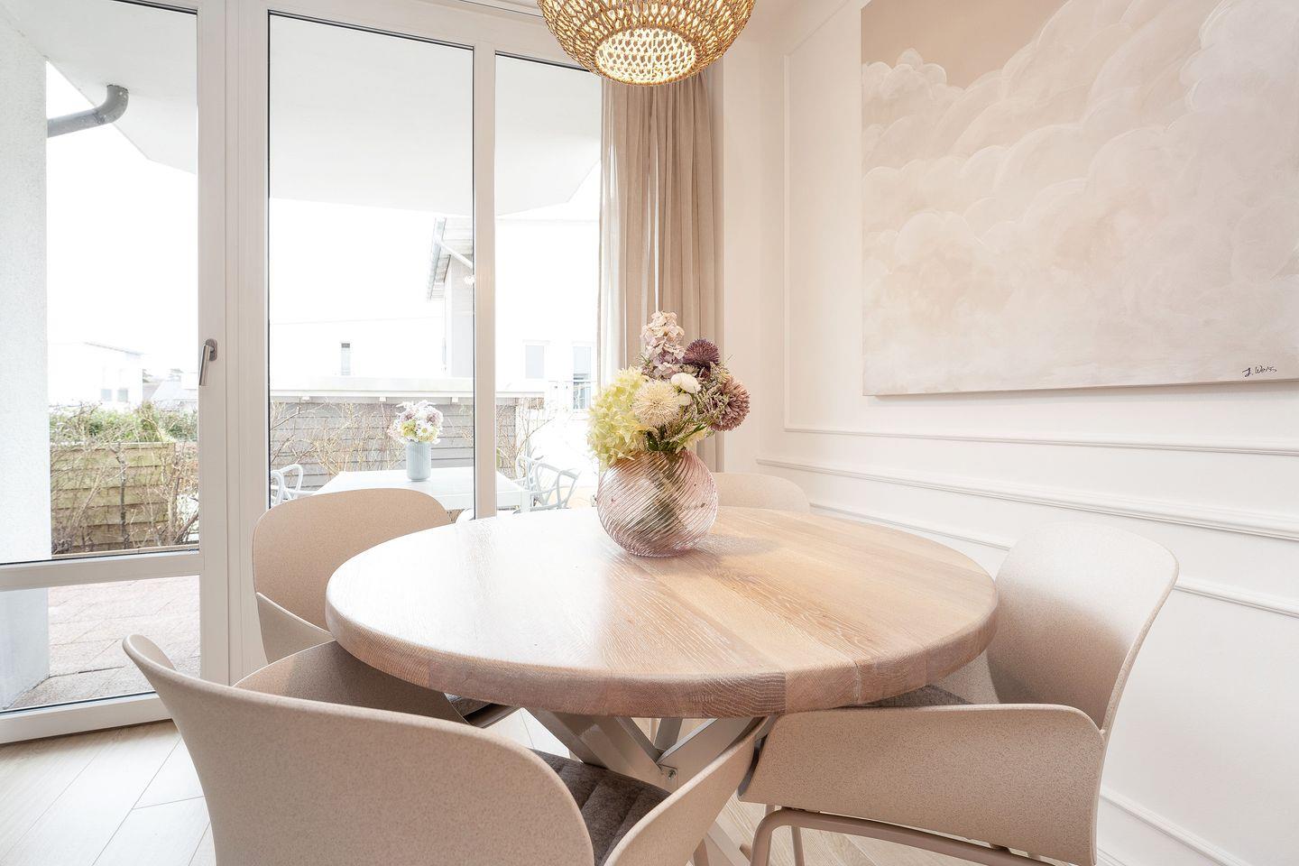 Bodentiefe Fenster verleihen dem Raum eine einladende, freundliche Atmosphäre. Von hier aus gelangen Sie auf die möblierte Terrasse mit Gartenmöbeln, die viel Platz für gemeinsame Mahlzeiten oder erholsame Stunden im Freien bietet.