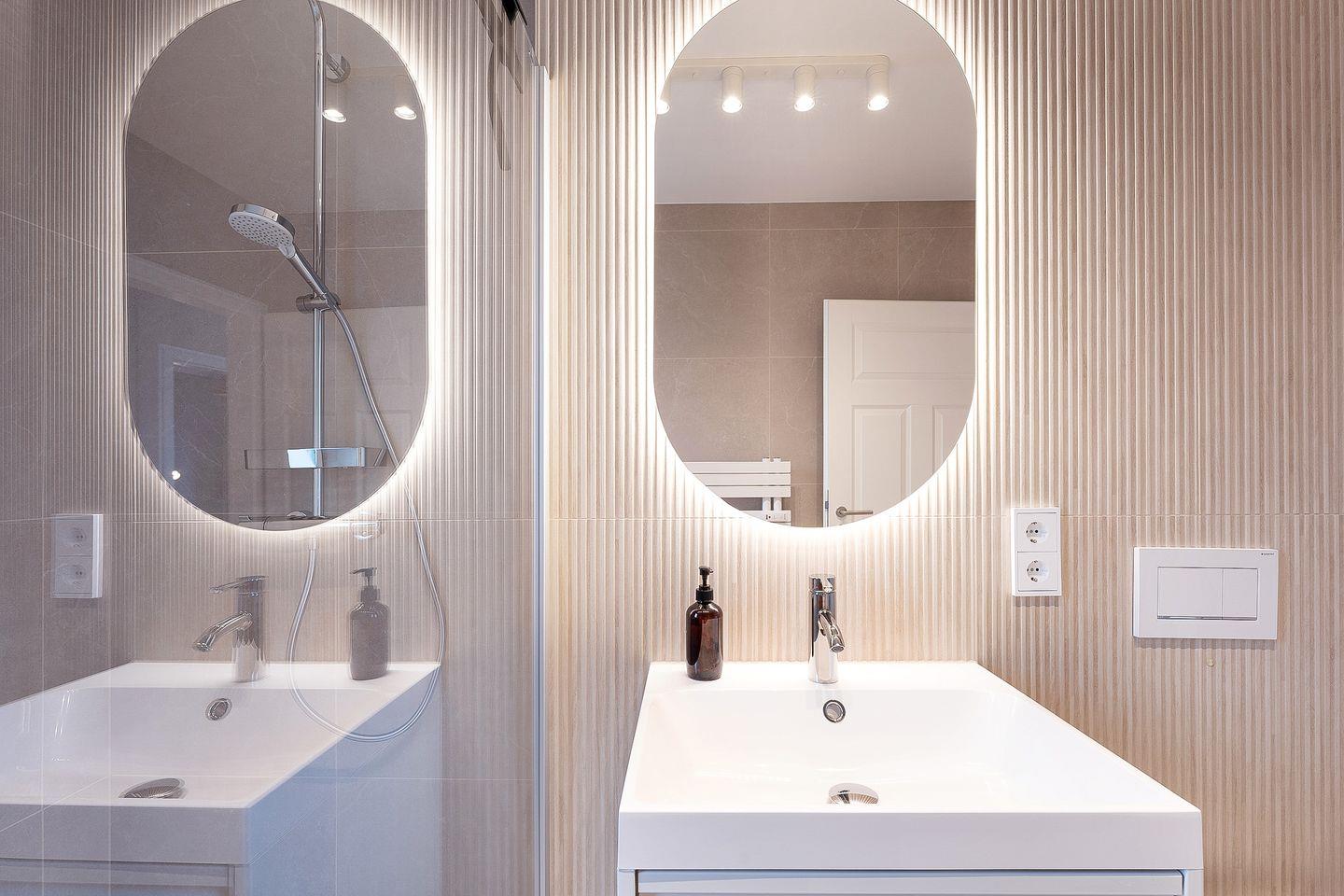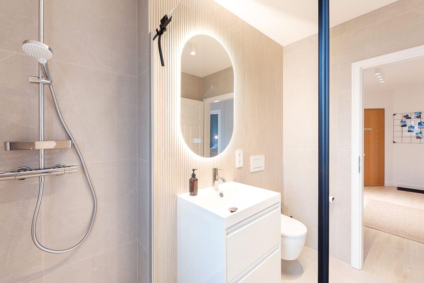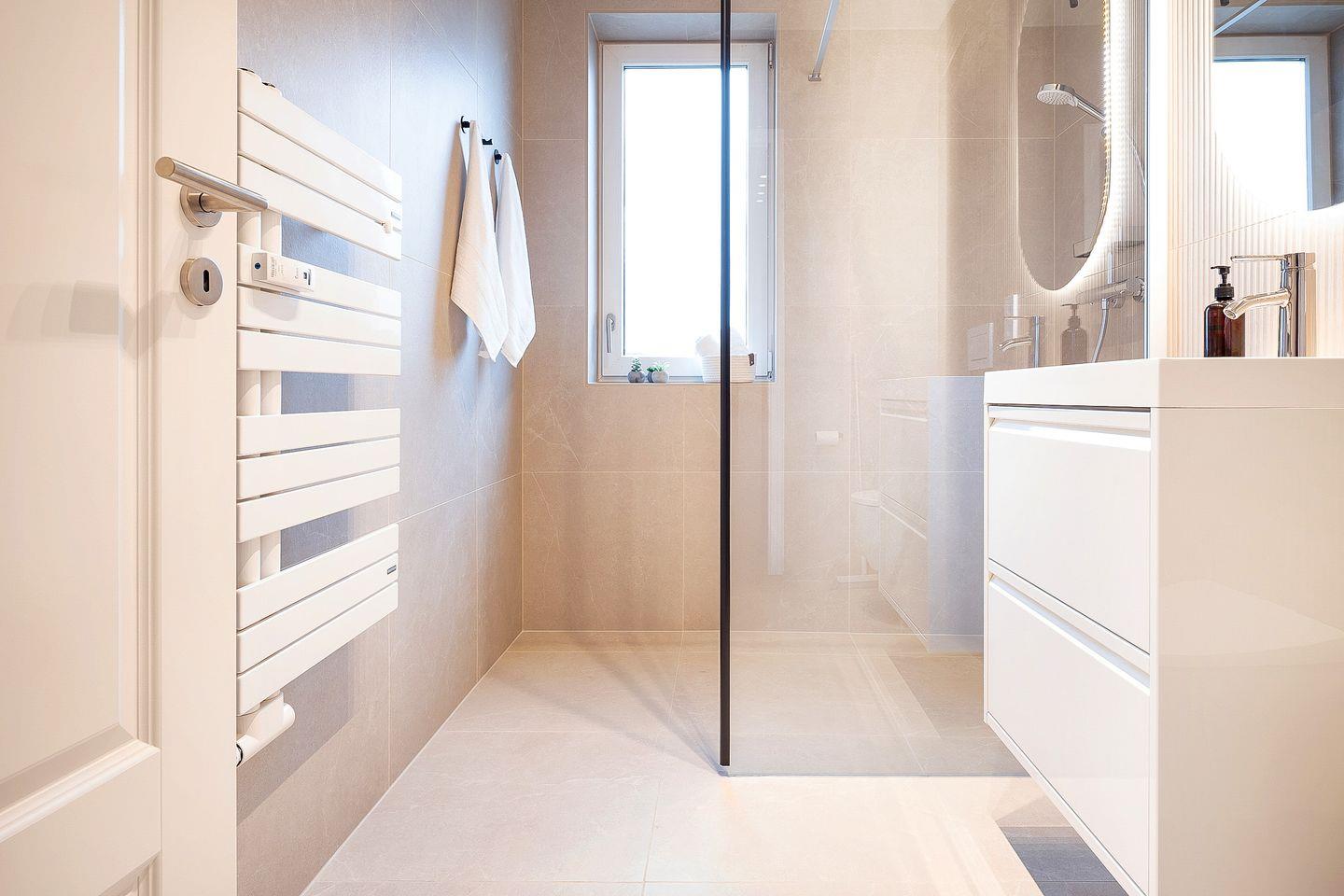 Das moderne Tageslichtbad ist hell gefliest und verfügt über eine bodengleiche Dusche, ein WC, einen Handtuchheizkörper sowie einen Haartrockner.