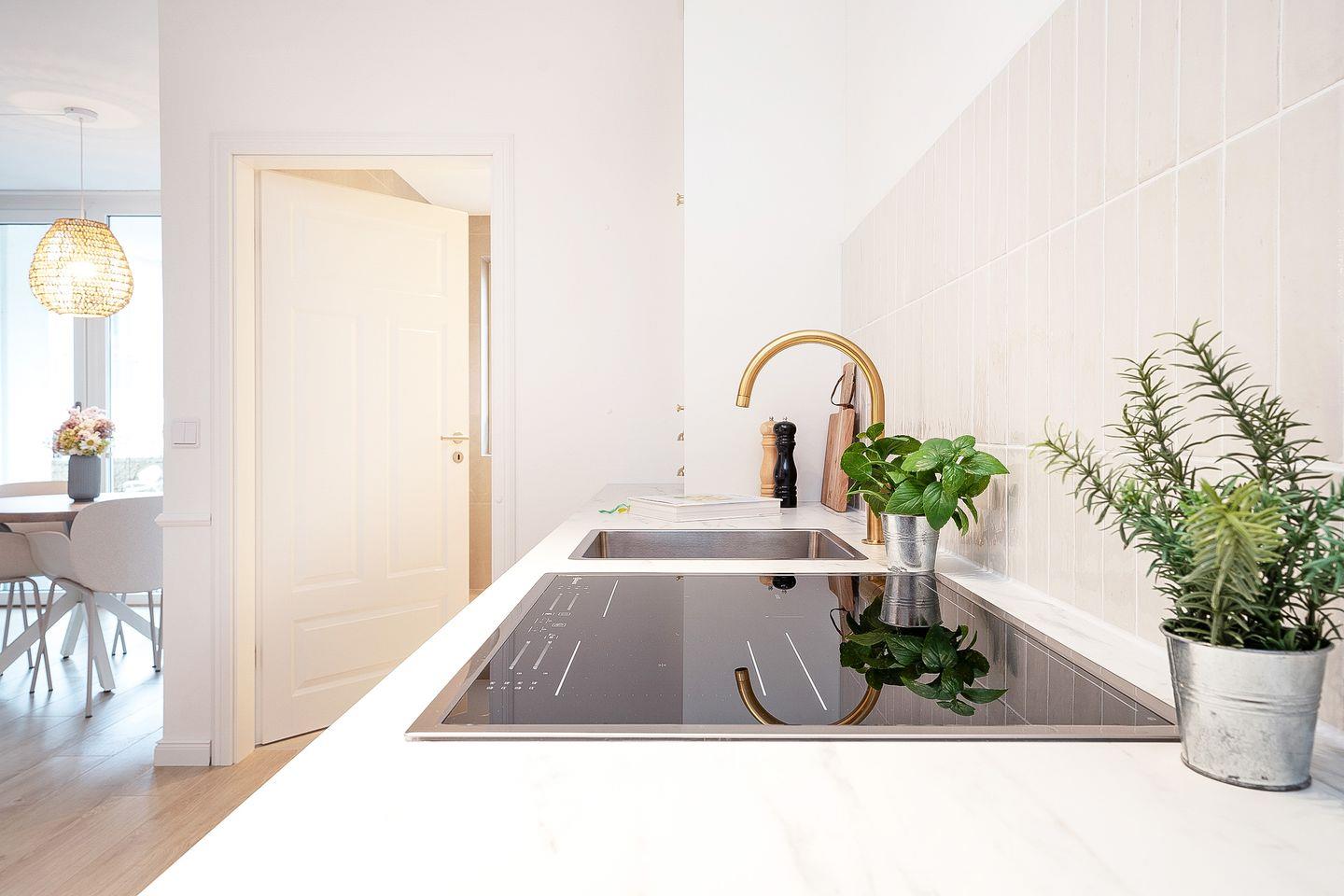 Die offene Küche ist funktional und elegant zugleich. Sie ist mit einem Induktionsherd samt Backofen, Kühlschrank mit Gefrierfach, Geschirrspülmaschine, Kaffeemaschine, Wasserkocher und Toaster vollständig ausgestattet. Ausreichend Geschirr, Besteck, Gläser und Kochutensilien sind selbstverständlich vorhanden. Der Essbereich ist harmonisch in den Wohnraum integriert und lädt zum gemeinsamen Kochen und Genießen ein.