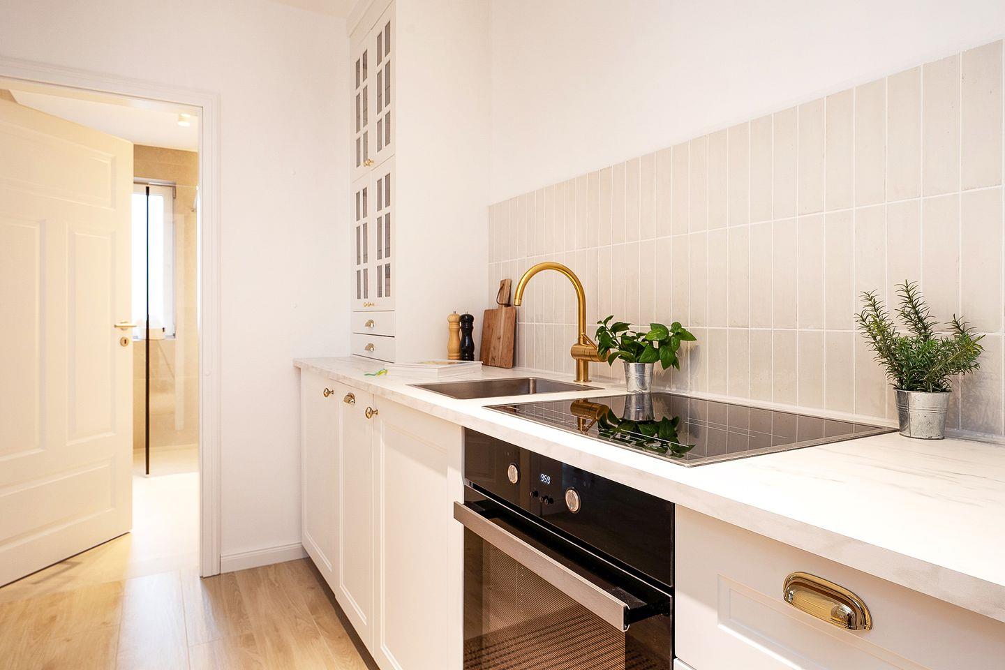 Der Wohn- und Schlafbereich sowie die Küche sind modern in Holzoptik gefliest.
