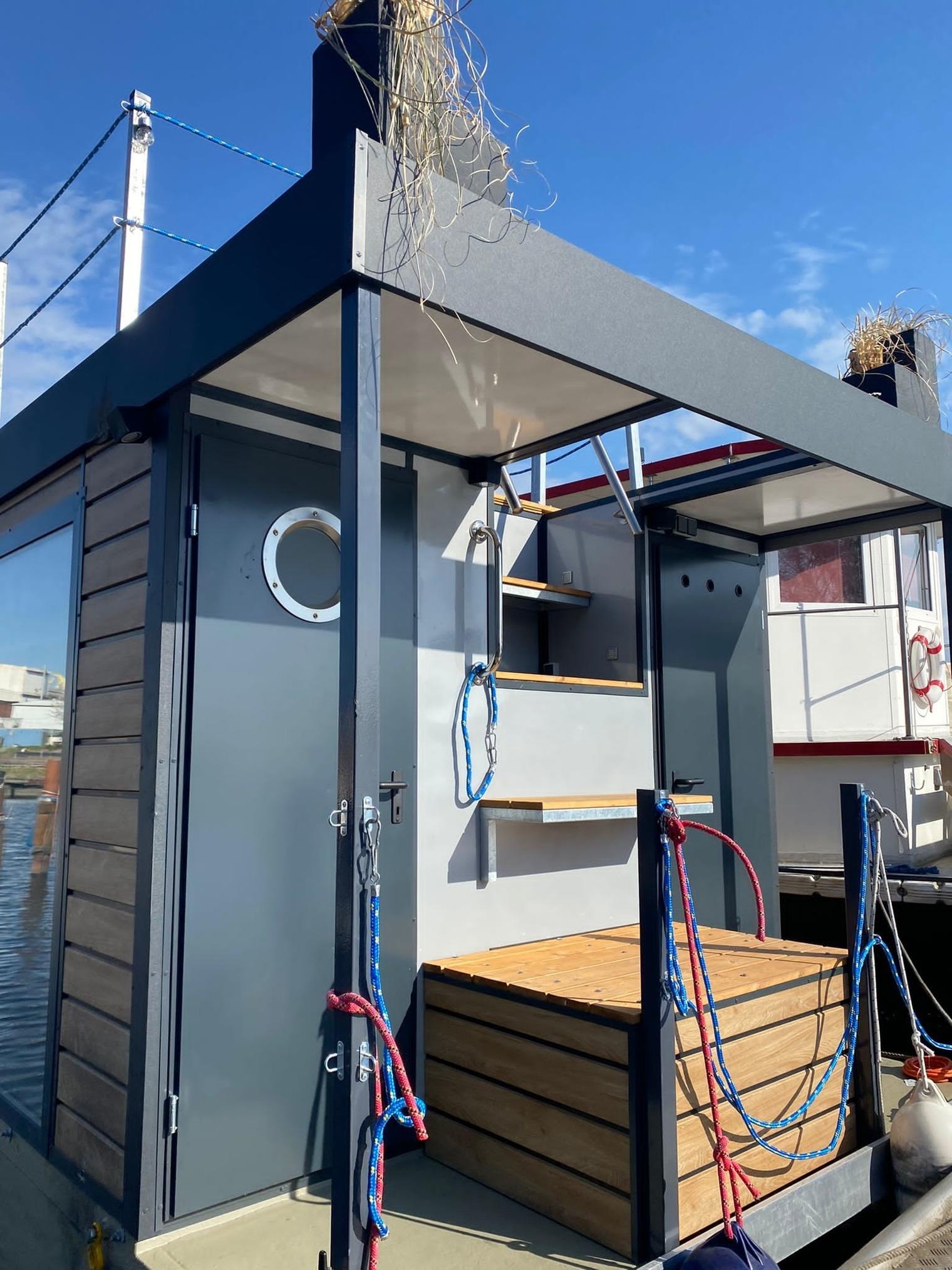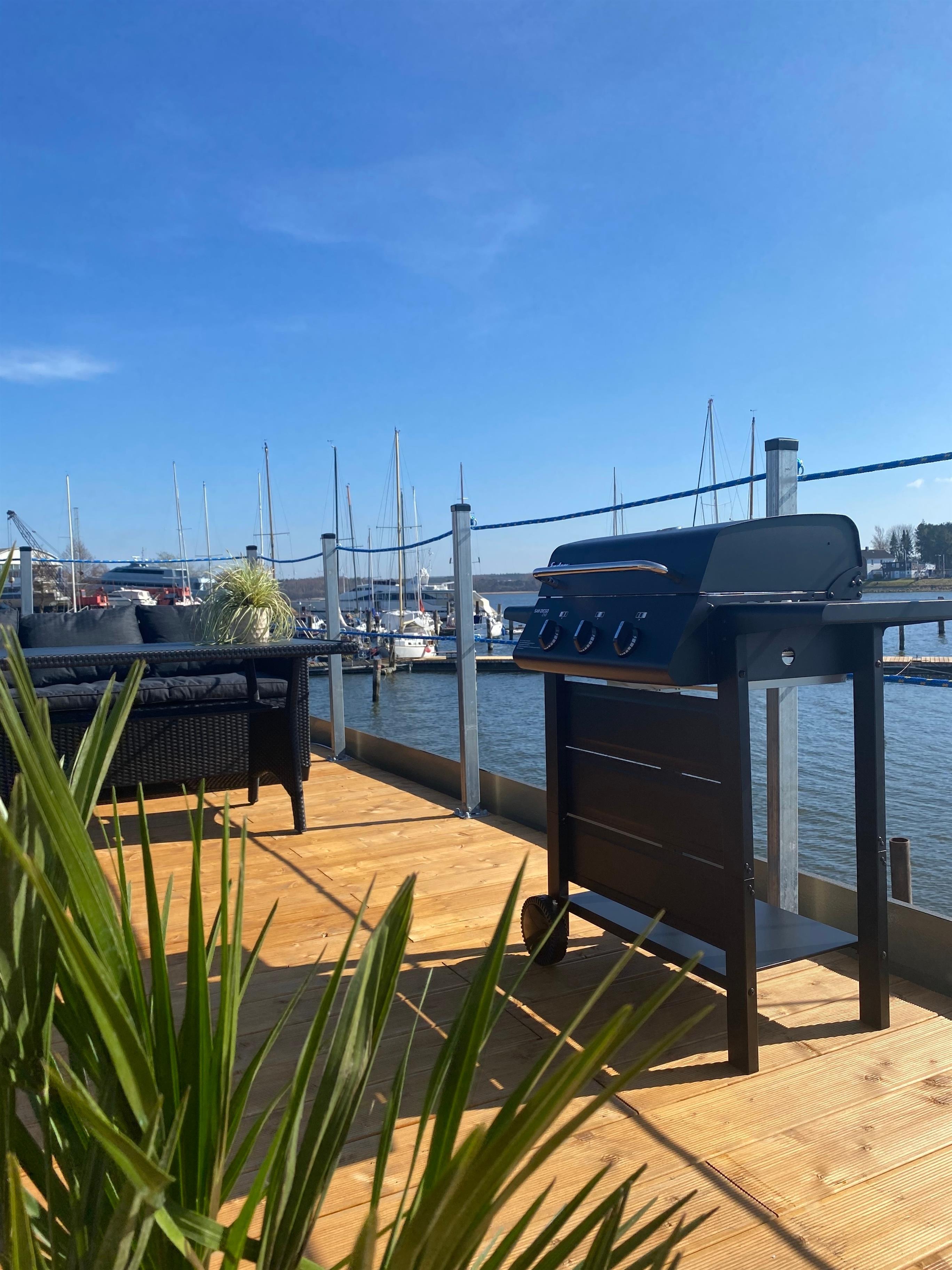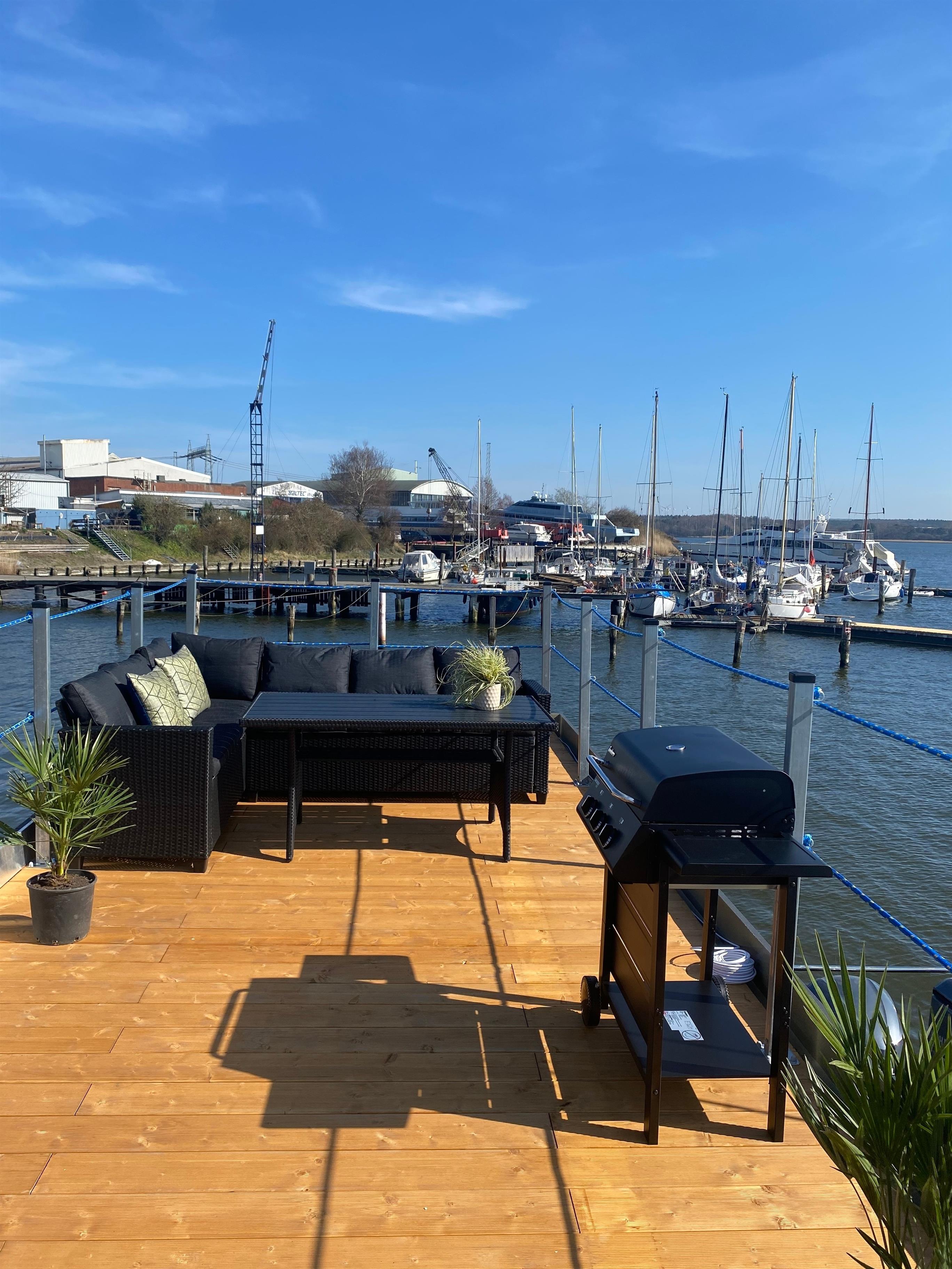 Verbringen Sie entspannte und erholsame Tage auf dem stehenden Hausboot im Hafen von Trave Marina in Travemünde.