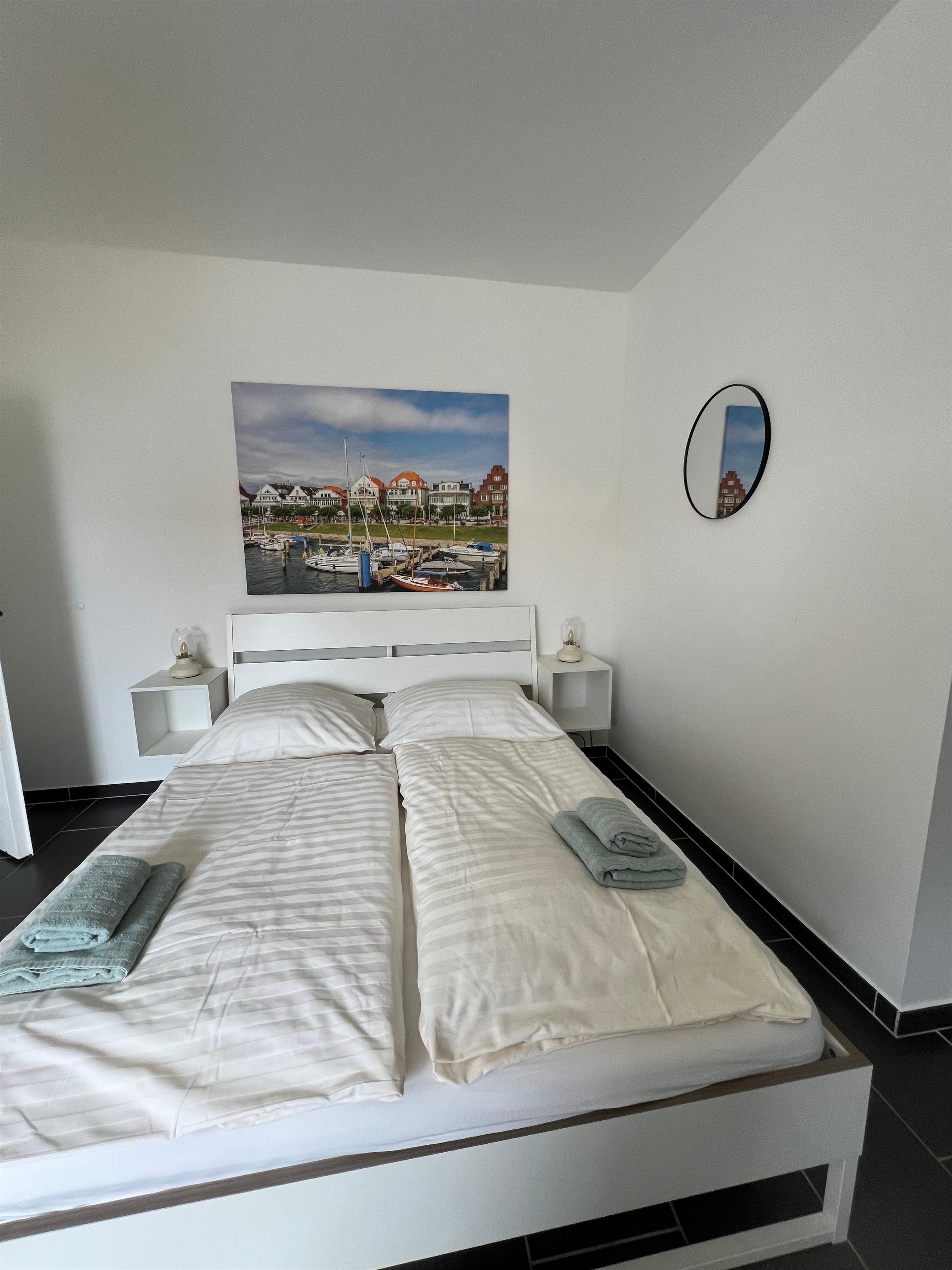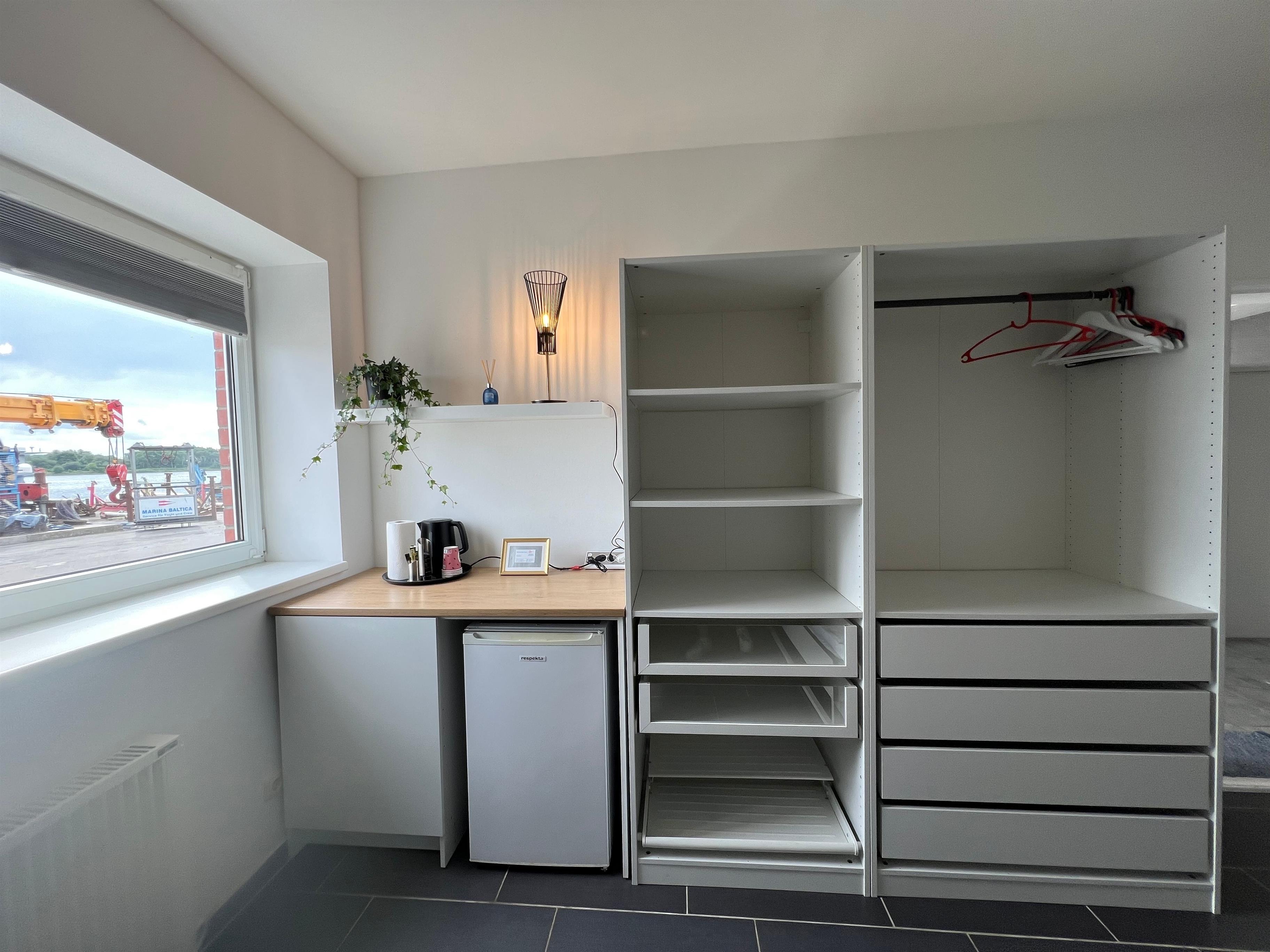 Die Zimmer sind mit einem geräumigen Kleiderschrank inklusive ausziehbarem Schuhregal und großen Schubladen eingerichtet . Die Sitzecke bietet einen individuell beleuchteten Rückzugsort mit Aussicht auf den Hafen. Der Essplatz ist als Tresen gestaltet und bietet Ausblicke auf die Trave. Ein schönes Doppelbett mit hochwertiger Matratze (zwei Härtegrade) komplettiert die Einrichtung. Im Zimmer befinden sich Kühlschrank und Wasserkocher. Eine Grundausstattung Geschirr kann ausgeliehen werden. Handtücher, Bettwäsche, Strom und Wasser sind im Preis