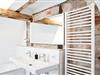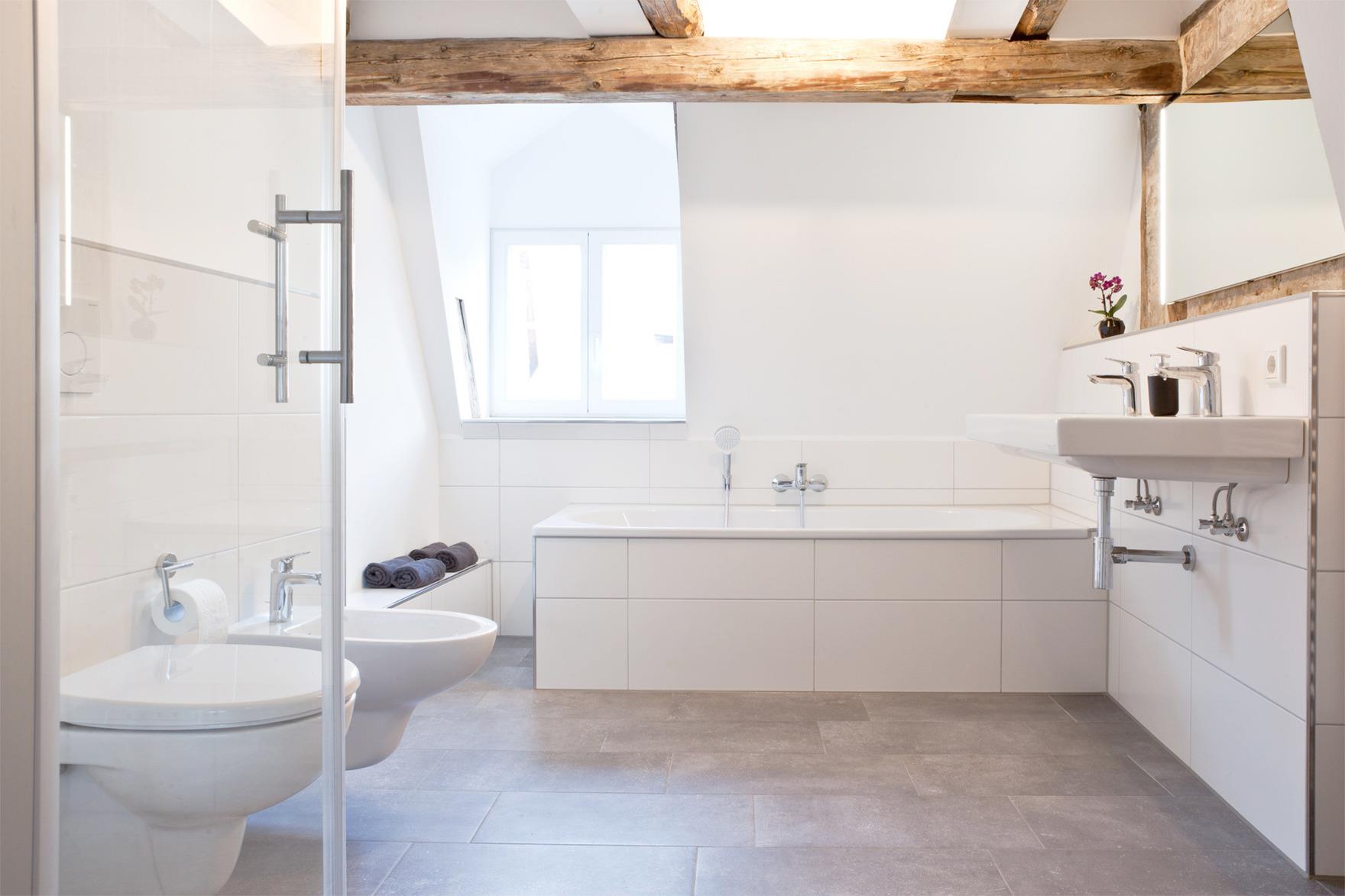 Badezimmerausstattung: Dusche, Wanne, Bidet, 2 Waschbecken, beheizbarer Spiegel, Fön, Vergrößerungsspiegel, Kosmetiktücher, Handtücher