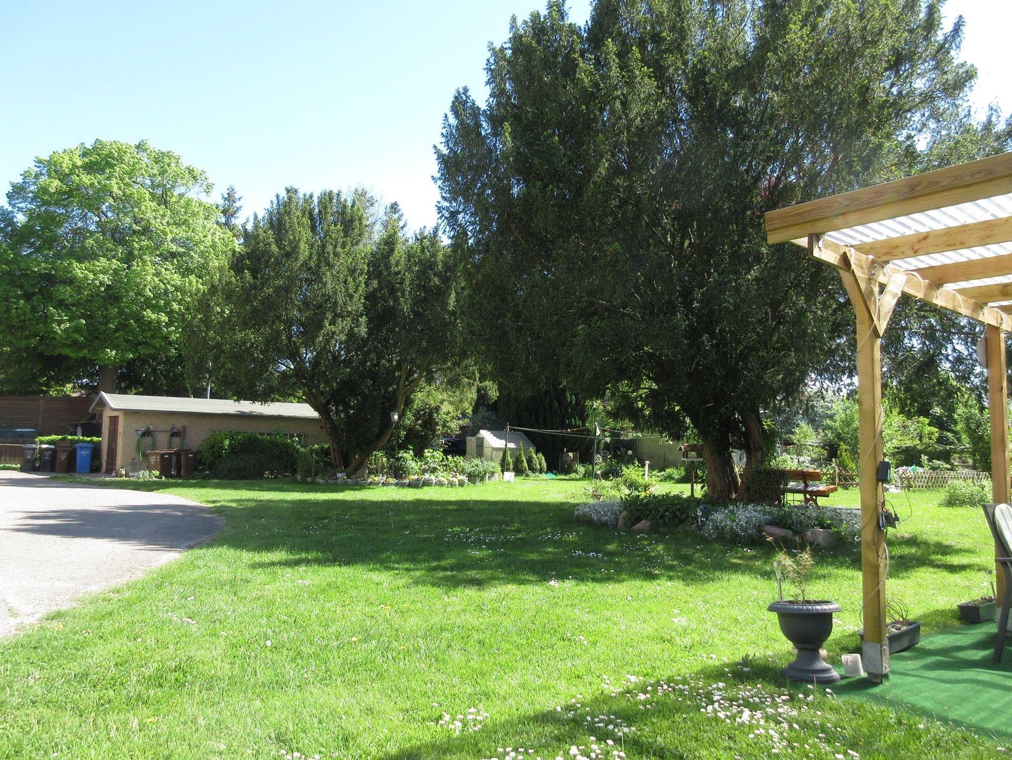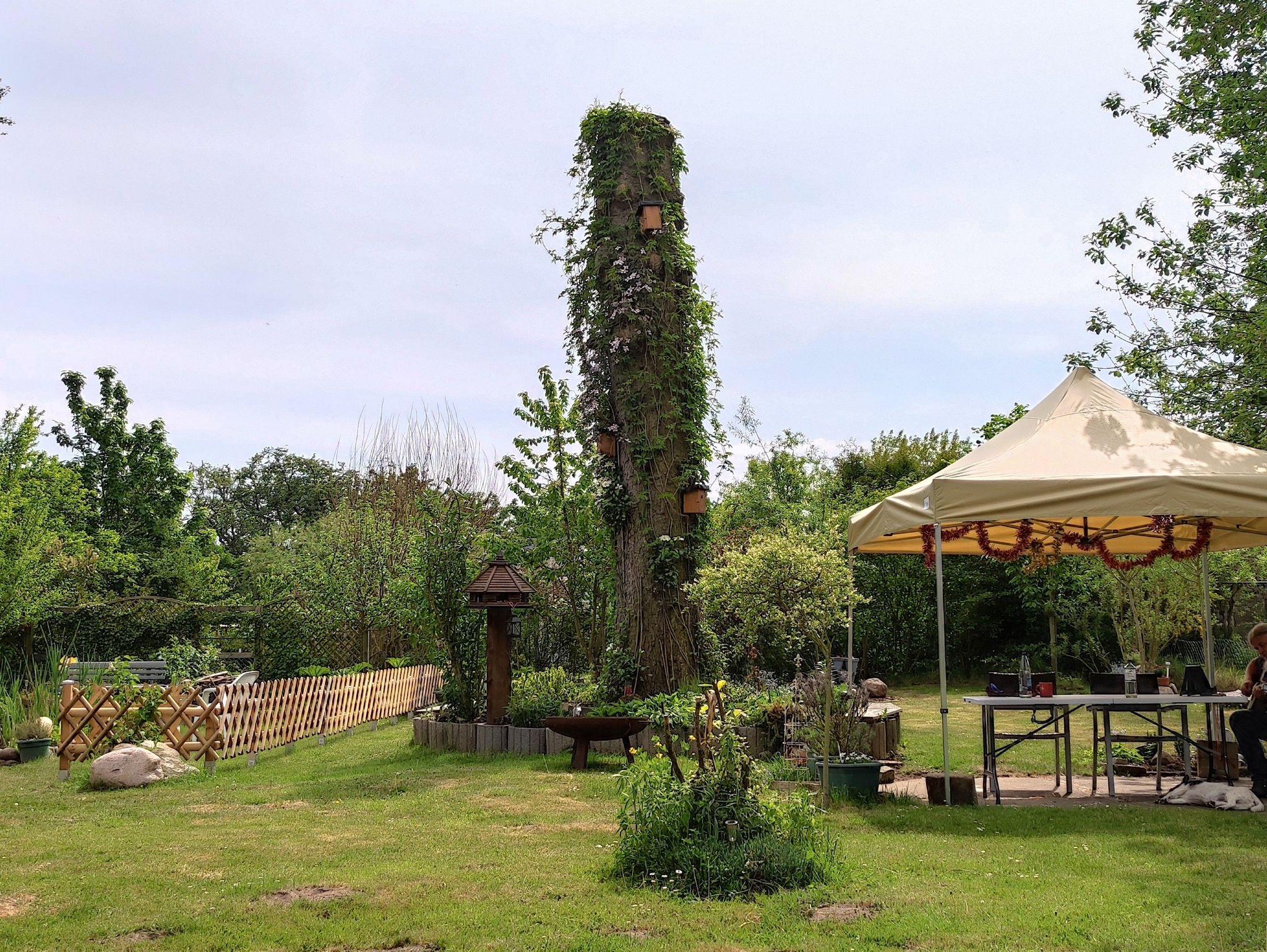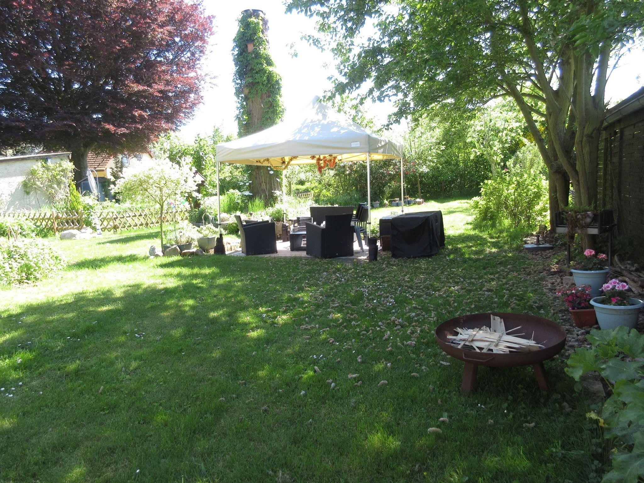 Hinter dem Haus befindet sich auf dem komplett eingezäunten Grundstück (Höhe ca. 60 ? 120cm), der kostenlose Parkplatz, ein großer Garten mit Wiese (Auslauf für die Hunde), Gartenmöbeln und einen Grillplatz, der gerne mitgenutzt werden kann.