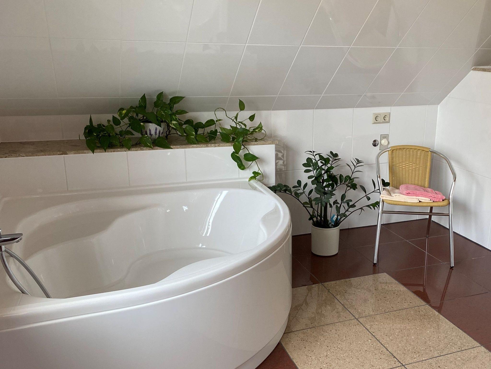 Unsere Ferienwohnung ist 90 qm groß und liegt im Obergeschoss eines Ferienhauses. Sie verfügt über ein großes Wohnzimmer, ein Schlafzimmer mit Doppelbett (nicht trennbar), ein Schlafzimmer mit zwei Einzelbetten, Küche und ein großes Bad mit Doppelwaschtisch, Dusche, Eckbadewanne und WC. Die Aufbettung für die 5. Person erfolgt auf einer ausklappbaren Schlafcouch im Wohnzimmer.