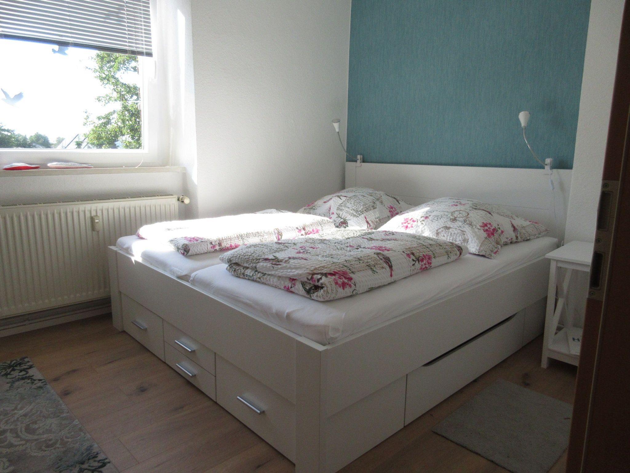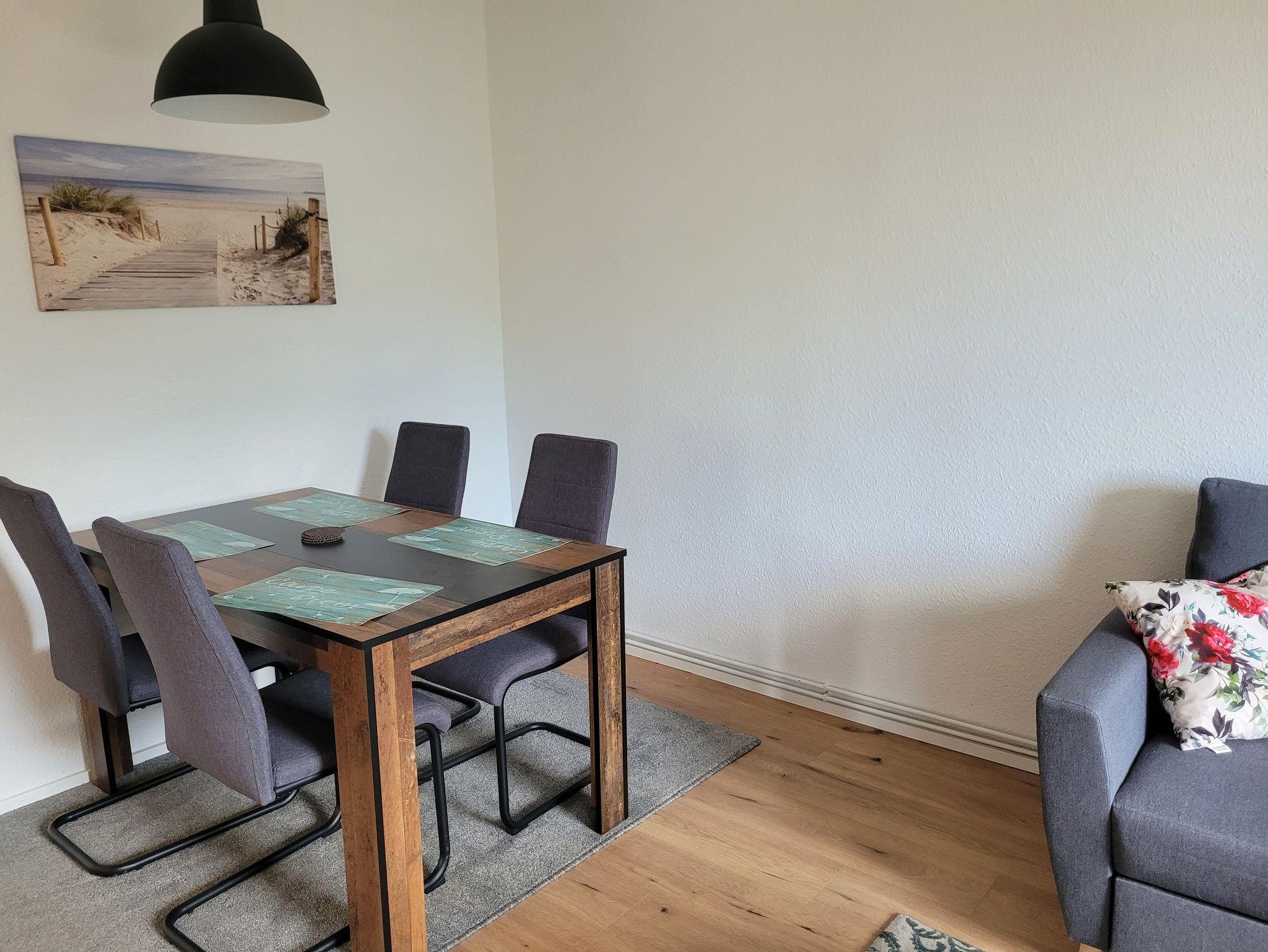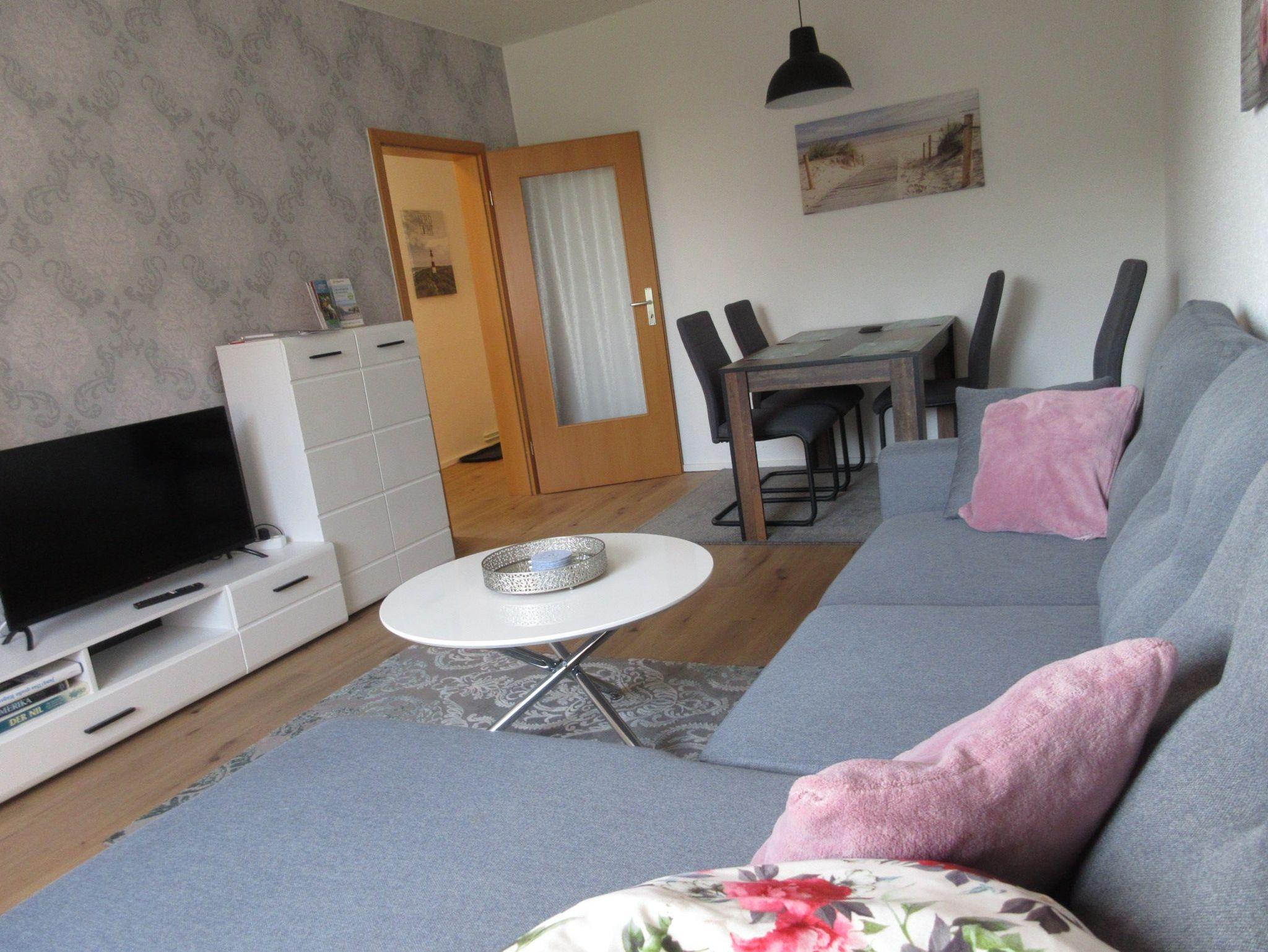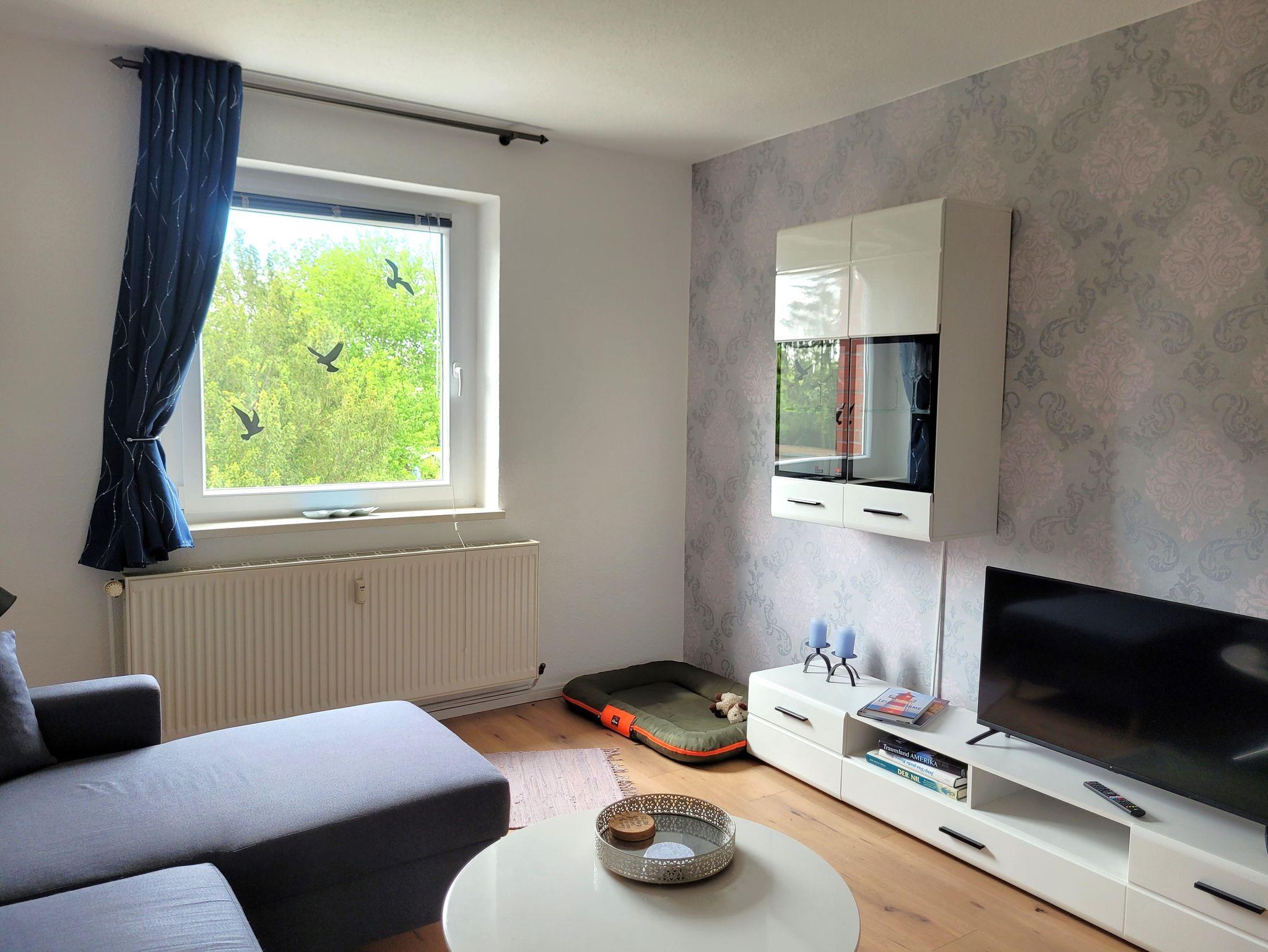 Die renovierte 49m große 2-Raum-Wohnung befindet sich im 1. OG (Treppe) und bietet Platz für 3 Personen mit maximal 2 Hunden. Die hundefreundliche Ferienwohnung verfügt über ein Schlafzimmer mit Doppelbett (1,80m breit) und großem Kleiderschrank. Das moderne Wohnzimmer verfügt über einen Smart-TV (Satellitenanschluß und IInternet), ein gemütliches Ecksofa (Aufbettung 3. Person) und einen großzügigen Esstisch für 4 Personen. Sollte statt der Schlafcouch lieber ein Zustellbett gewünscht sein, wird dieses kostenfrei zur Verfügung gestellt.