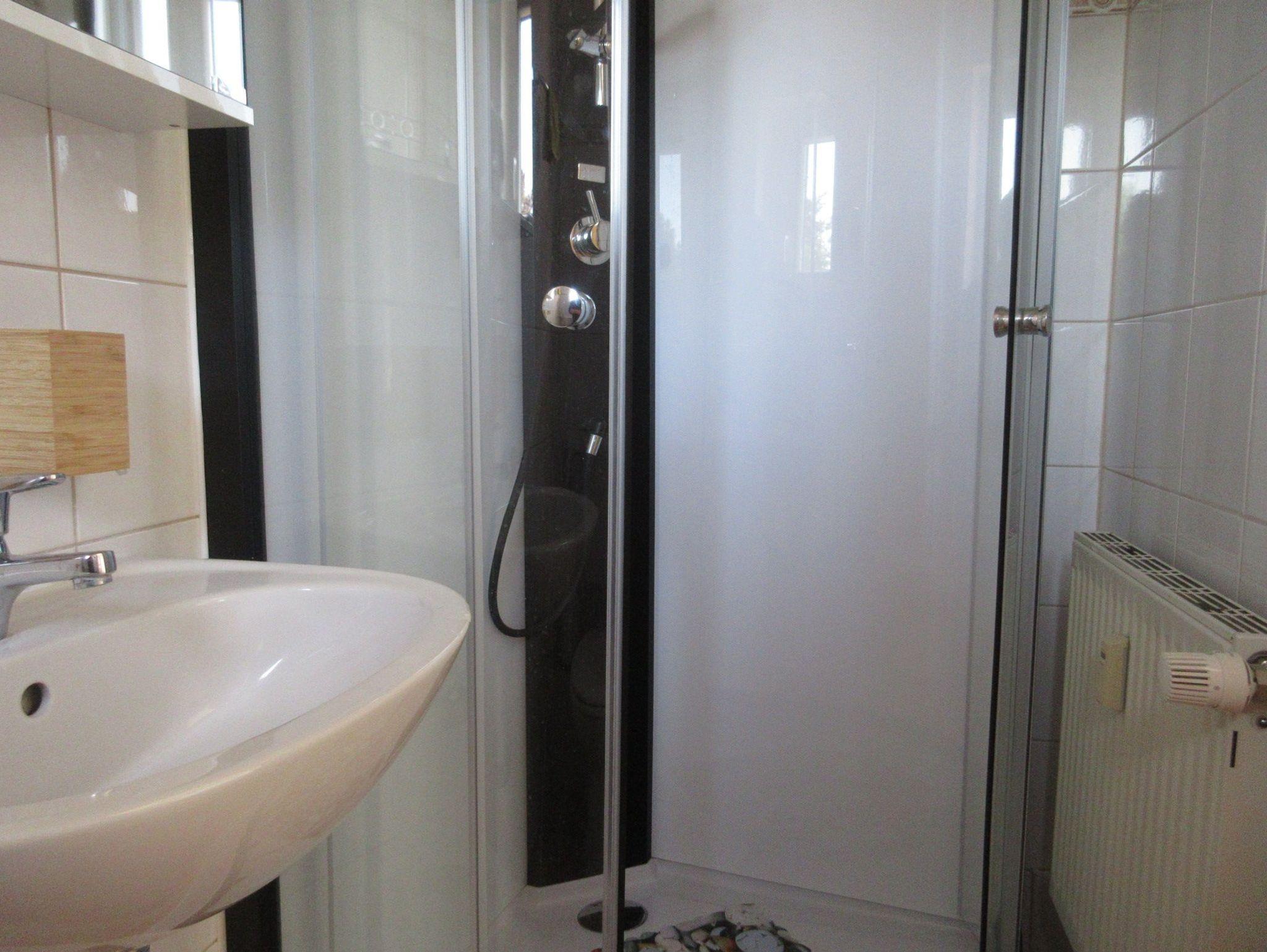 Das Bad bietet den Gästen ein Waschbecken, eine Duschkabine und ein WC. Handtücher und Bettwäsche können hinzugebucht werden. Seife und Toilettenpapier werden in Erstausstattung bereitgestellt.