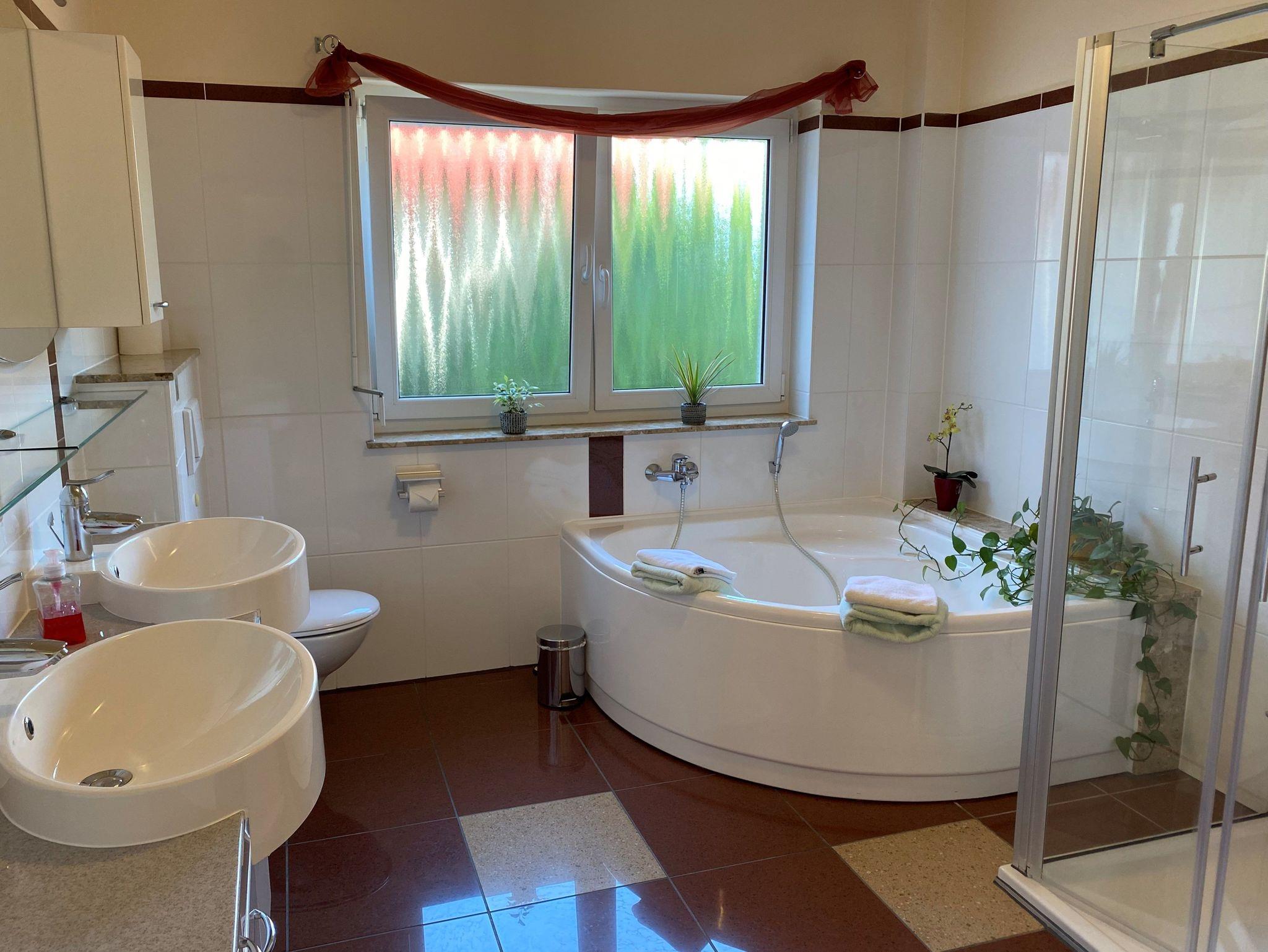 Unsere Ferienwohnung ist 90 qm groß und liegt im Erdgeschoss eines Ferienhauses. Sie verfügt über ein großes Wohnzimmer, ein Schlafzimmer mit Doppelbett (trennbar zu Einzelbetten), ein Schlafzimmer mit zwei Einzelbetten, Küche und ein großes Bad mit Doppelwaschtisch, Dusche, Eckbadewanne und WC. Die Aufbettung für die 5. Person erfolgt auf einer ausklappbaren Schlafcouch im Wohnzimmer. Im Wohnzimmer steht Ihnen ein Kamin zur Verfügung.