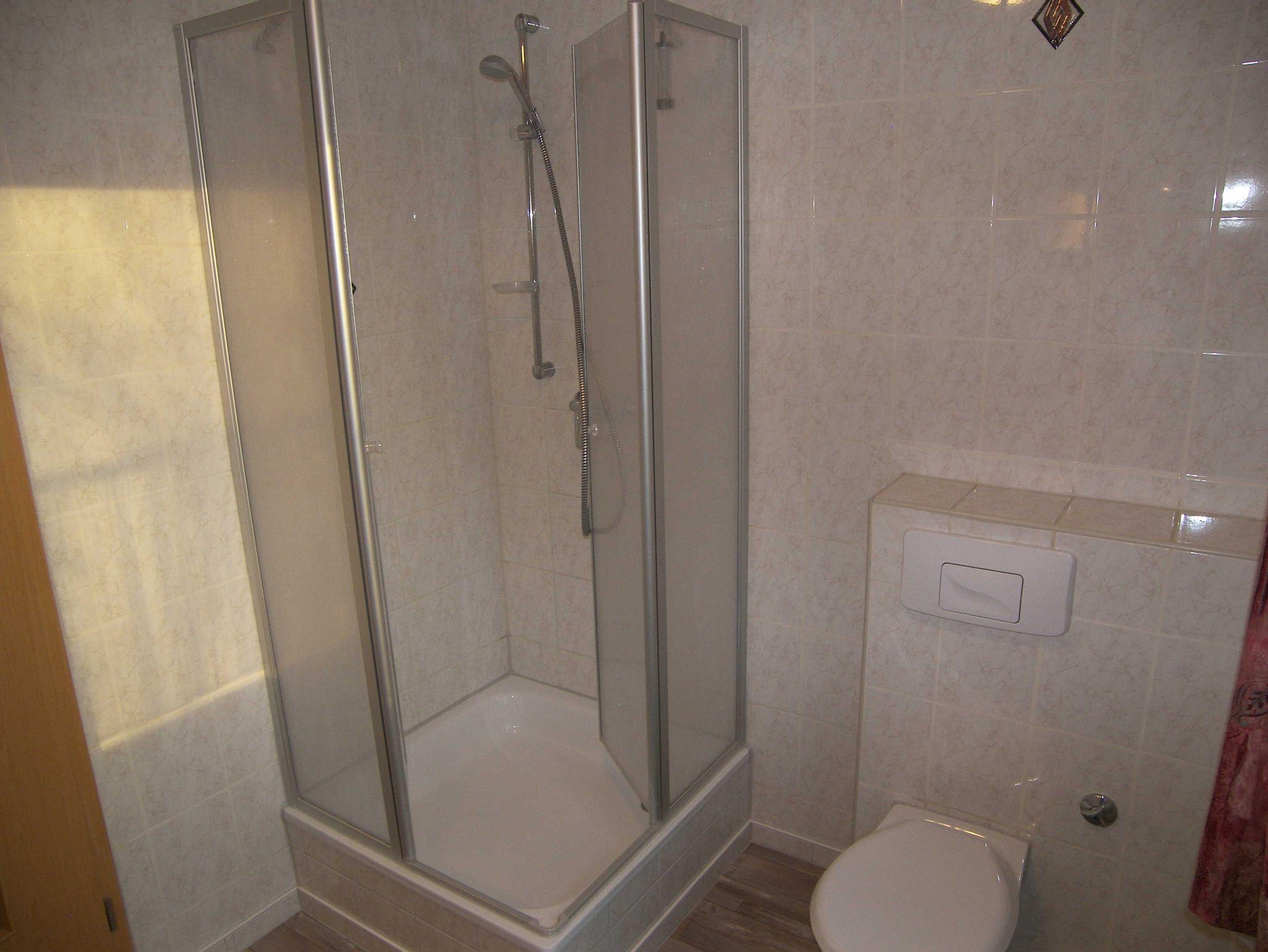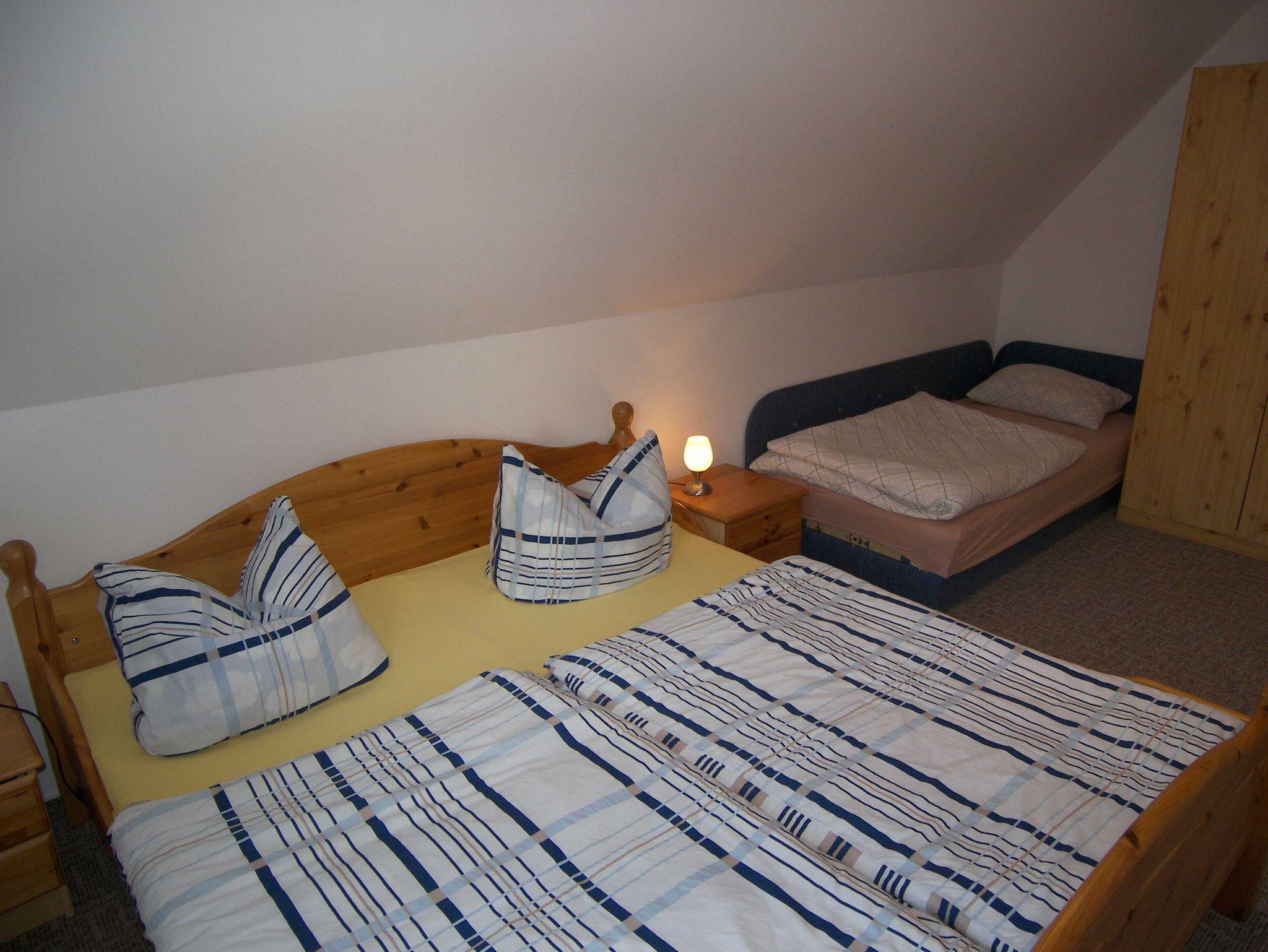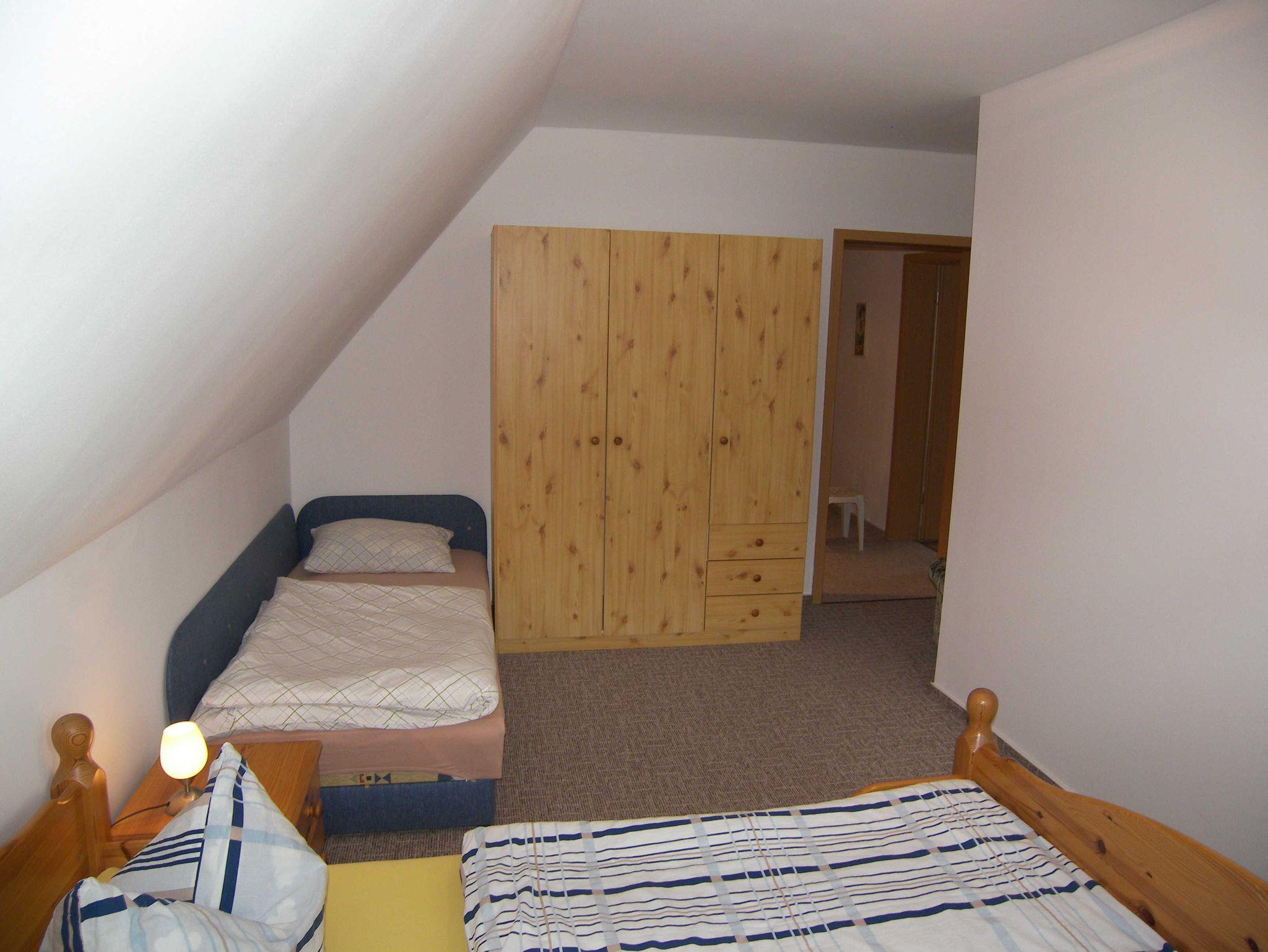 Das Schlafzimmer ist mit einem Doppelbett (180 x 200) und einem Einzelbett sowie mit einem geräumigen Kleiderschrank ausgestattet. Das Bad mit Fenster verfügt über Dusche/WC.