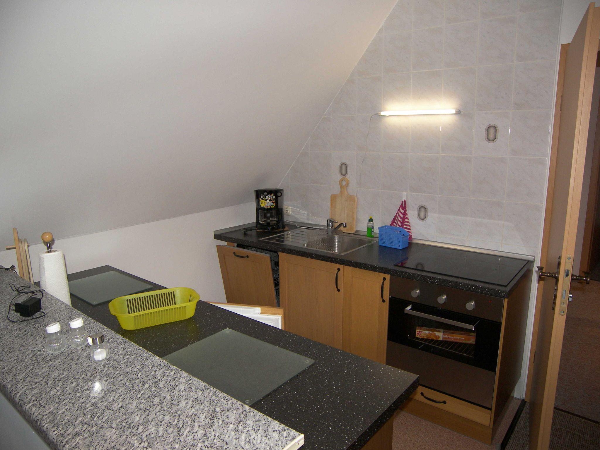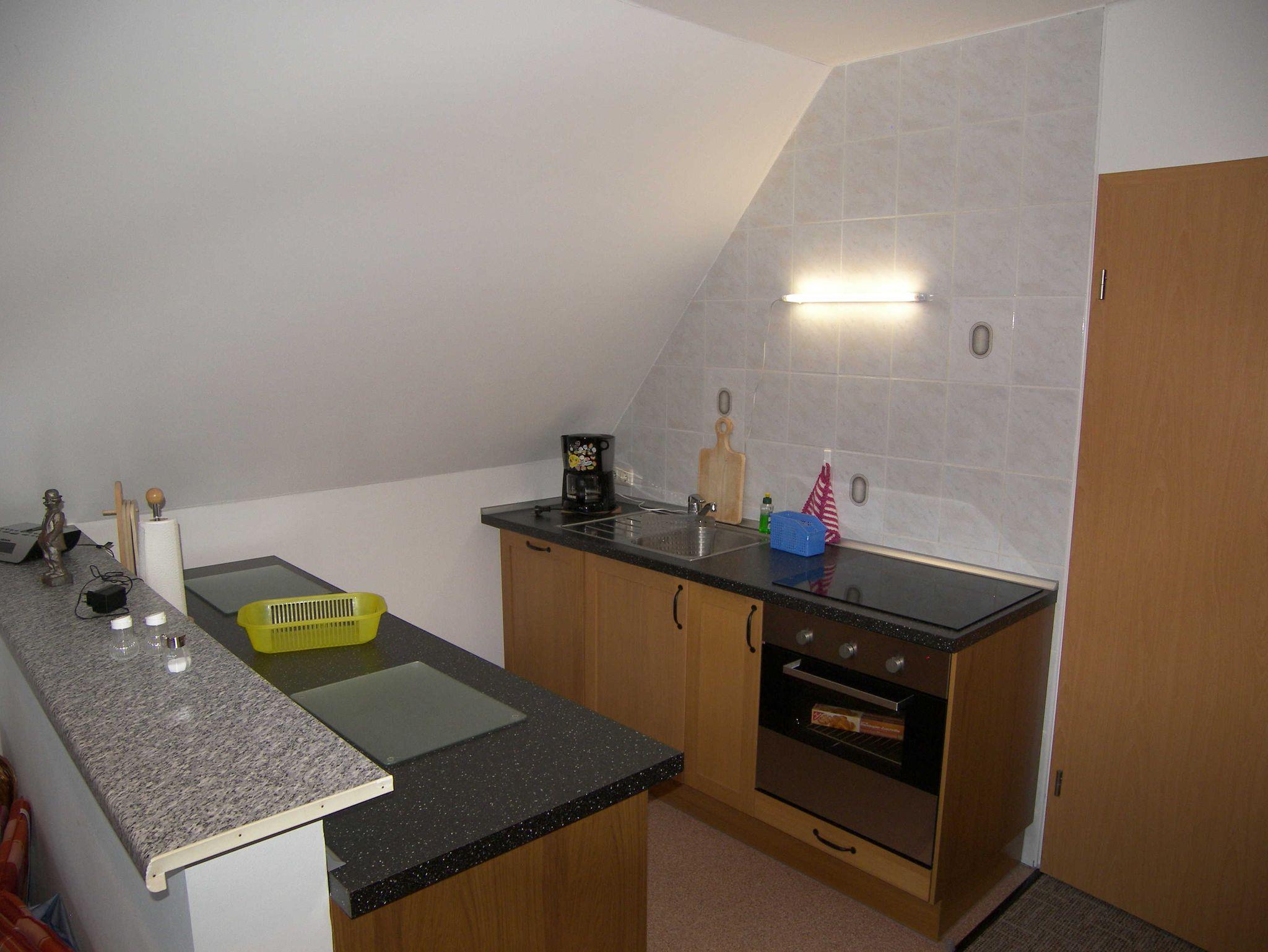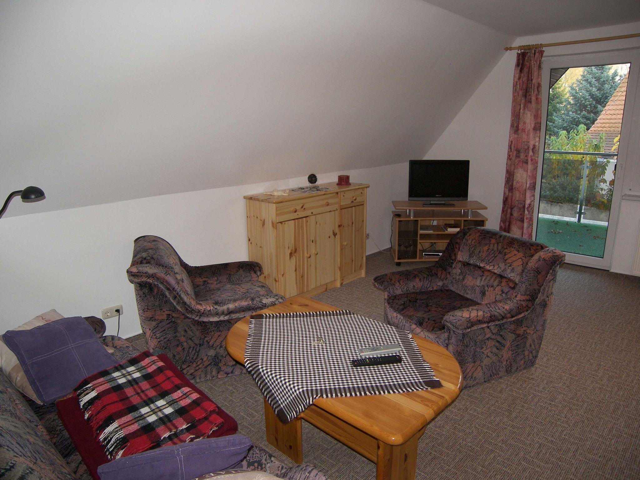 Die Wohnung verfügt über einen Wohnbereich mit offenem Küchenbereich, ausgestattet mit 4 Platten-Herd mit Backofen, Spülmaschine, Wasserkocher, Toaster und Kaffeemaschine und einem großen Esstisch mit 4 Stühlen, Couch-Sitzgruppe, TV und Radio. Vom Wohnzimmer aus gelangt man auf den großzügigen Balkon zur Südostlage.