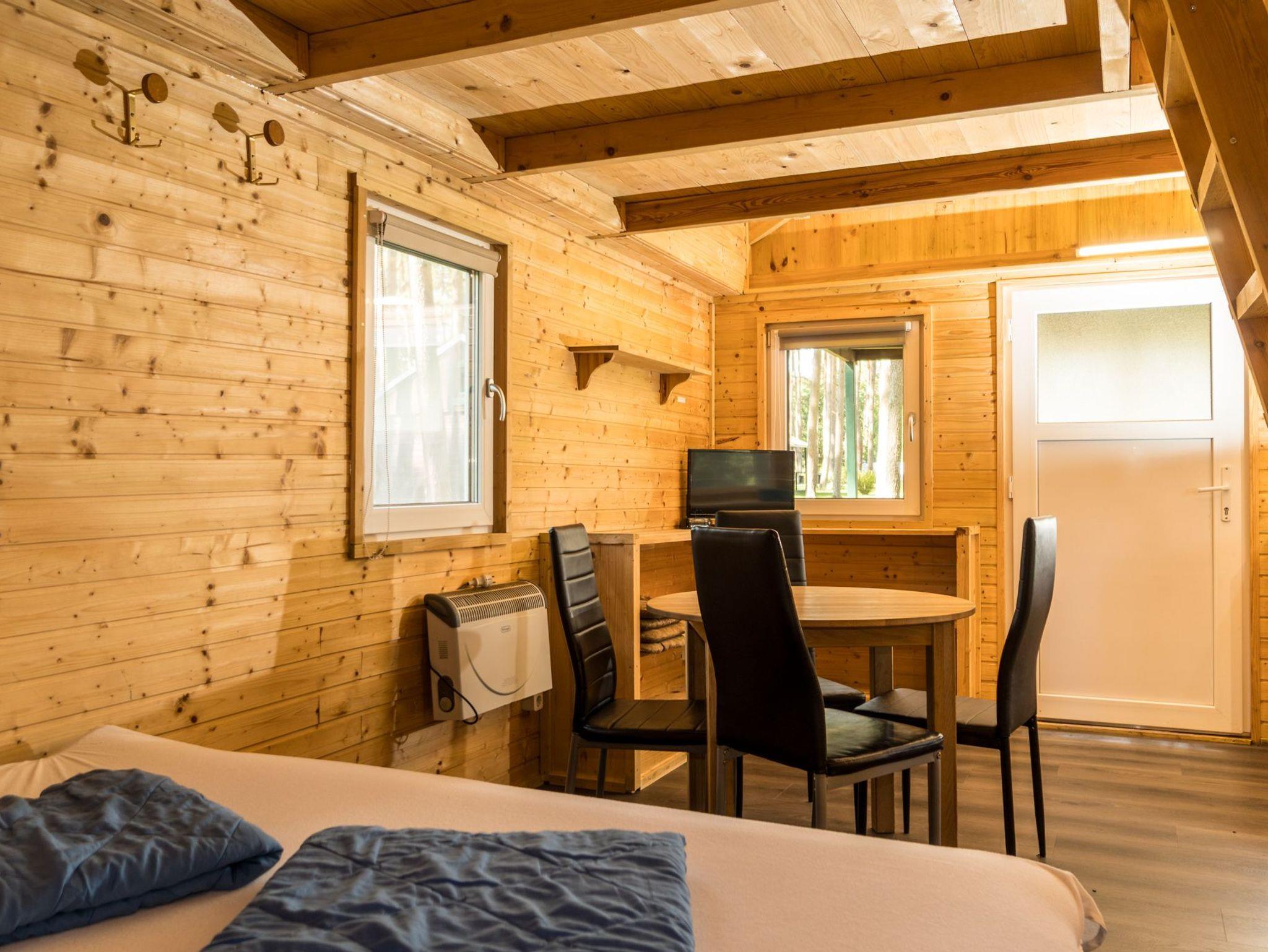 Der Bungalow verfügt über zwei Etagen. Die obere Etage ist ein Schlafboden mit dicker Matrazen (160x200cm) für zwei Personen und über eine Leiter zu erreichen. Die untere Etage besteht aus einem großen Raum mit TV-Ecke, einer Flachstrecken für ihre Garderobe, einer Schlafnische mit Boxspring-Doppelbett (180x200cm) und der Küchenzeile. Separat befindet sich ein Bad mit Toilette und einer Dusche.