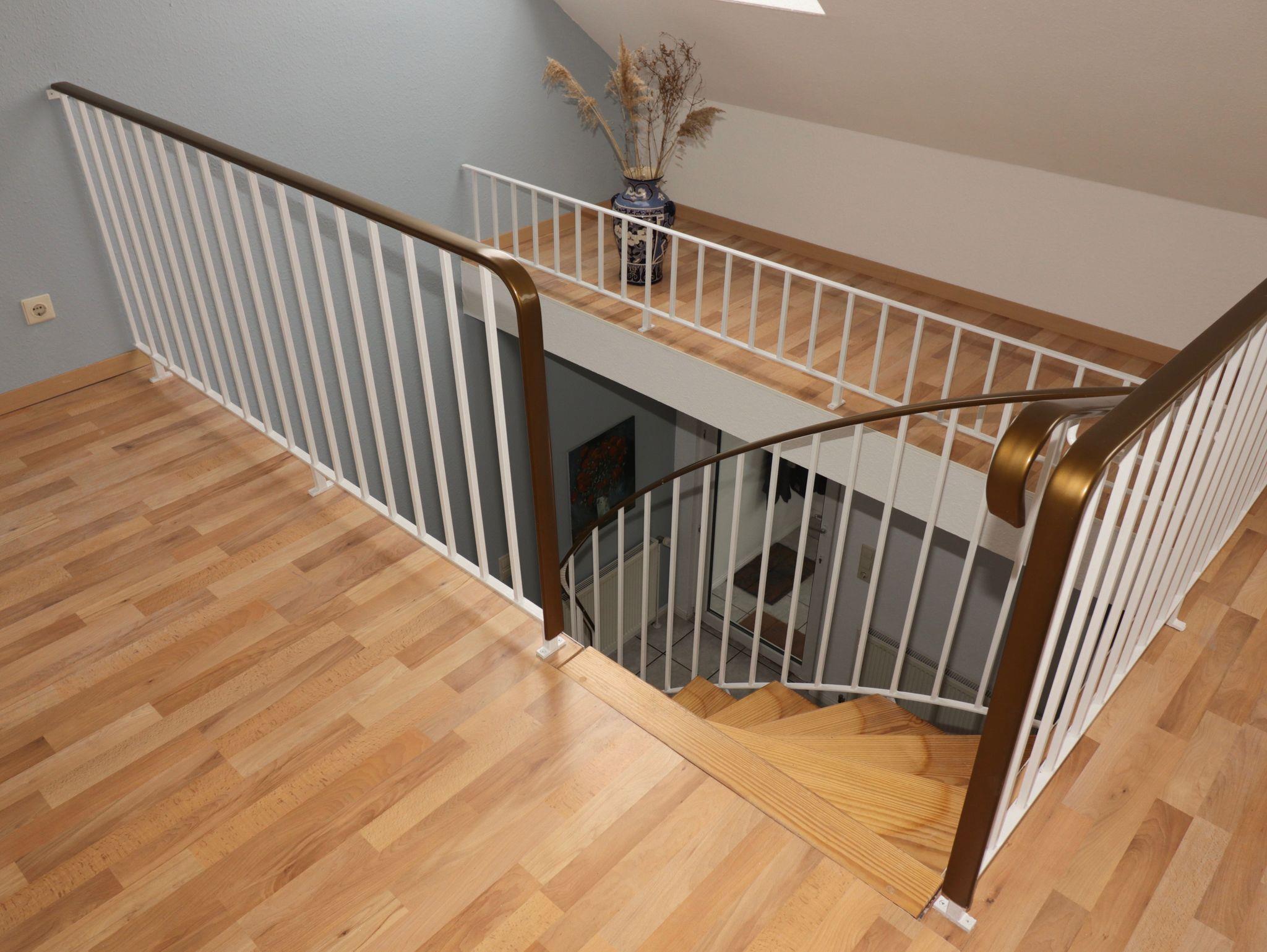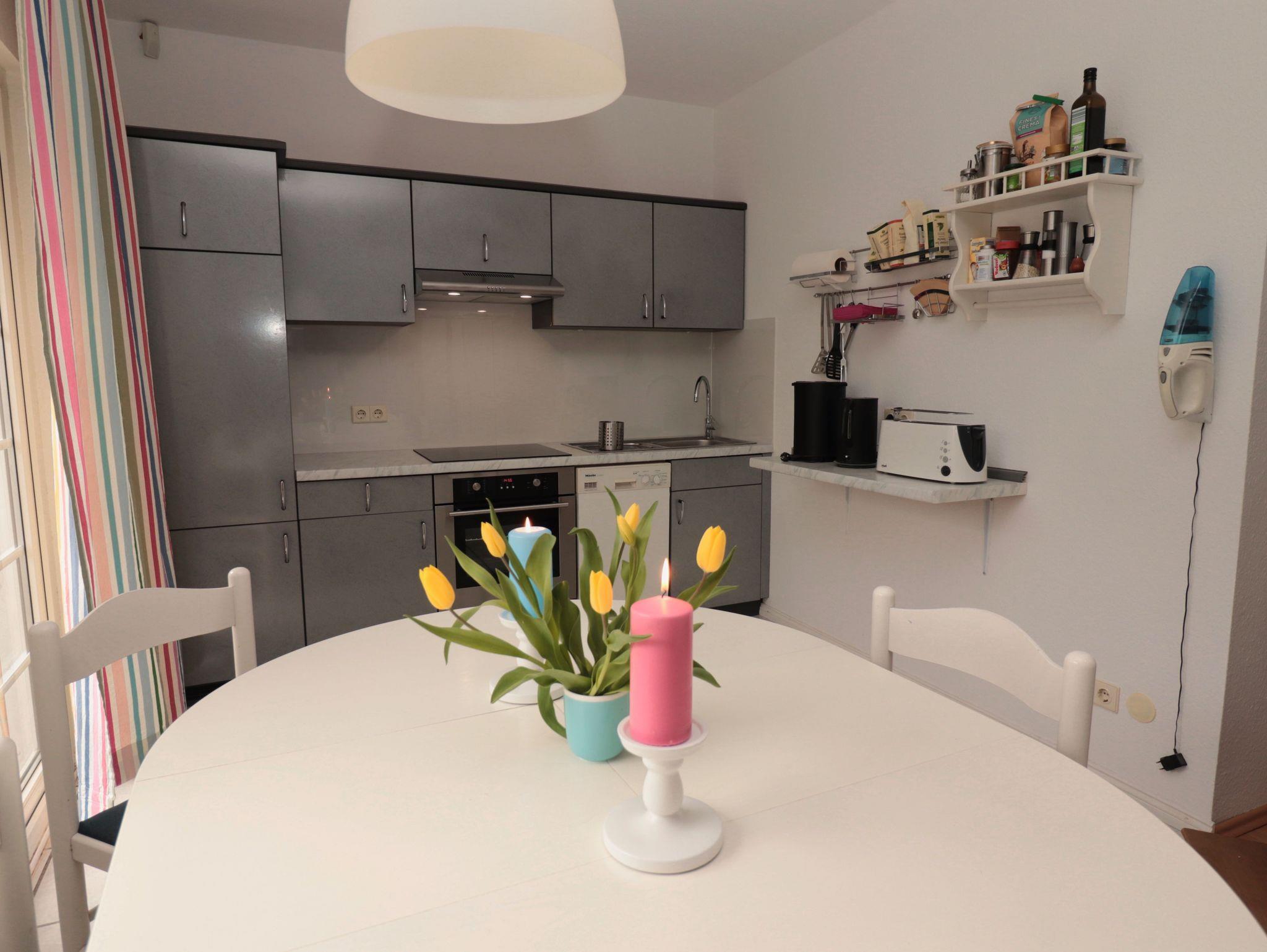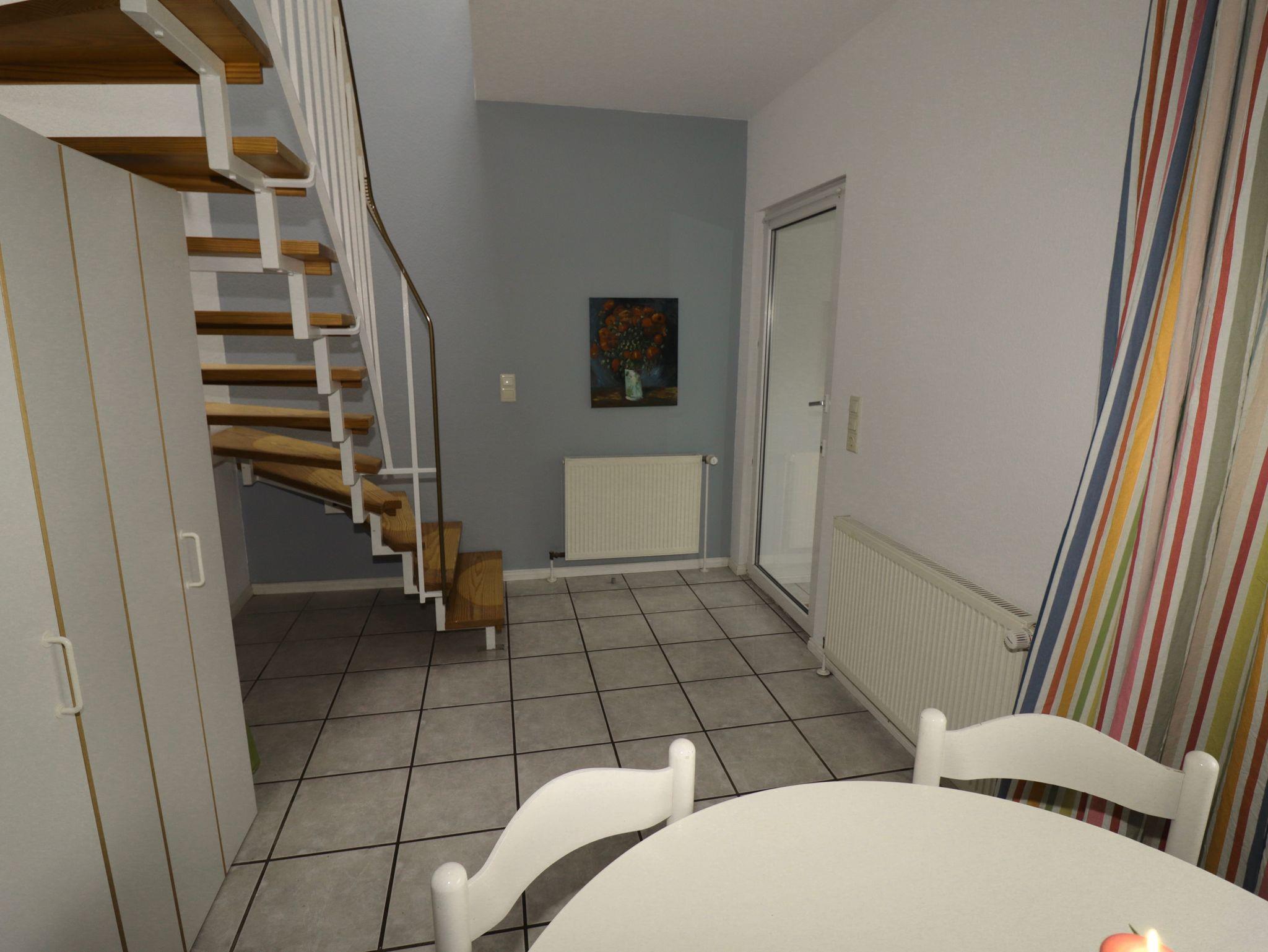 Man betritt das Haus über einen abgeschlossenen Windfang, der ausreichend Platz für Jacken und Schuhe bietet. Durch eine Terrassentür gelangt man in den gefliesten Wohnküchenbereich. Geradeaus führt eine offene Treppe in den Wohnbereich unter dem Dach und am anderen Ende des Raums befindet sich die Küchenzeile. Diese verfügt über einen Induktionsherd mit Backofen (eingebaut 2024), Kühlschrank mit integriertem Gefrierfach und einer Geschirrspülmaschine. Auf dem Ablageregal zur Rechten steht eine Kaffeemaschine, Wasserkocher und Toaster. In diesem Raum befindet sich weiterhin ein runder, ausziehbarer Esstisch mit fünf Stühlen und ein TrippTrapp Kinderstuhl, sowie ein Vorratsschrank unter der Treppe. Über eine Terrassentür links neben der Kochzeile gelangt man auf die Terrasse in Südlage,