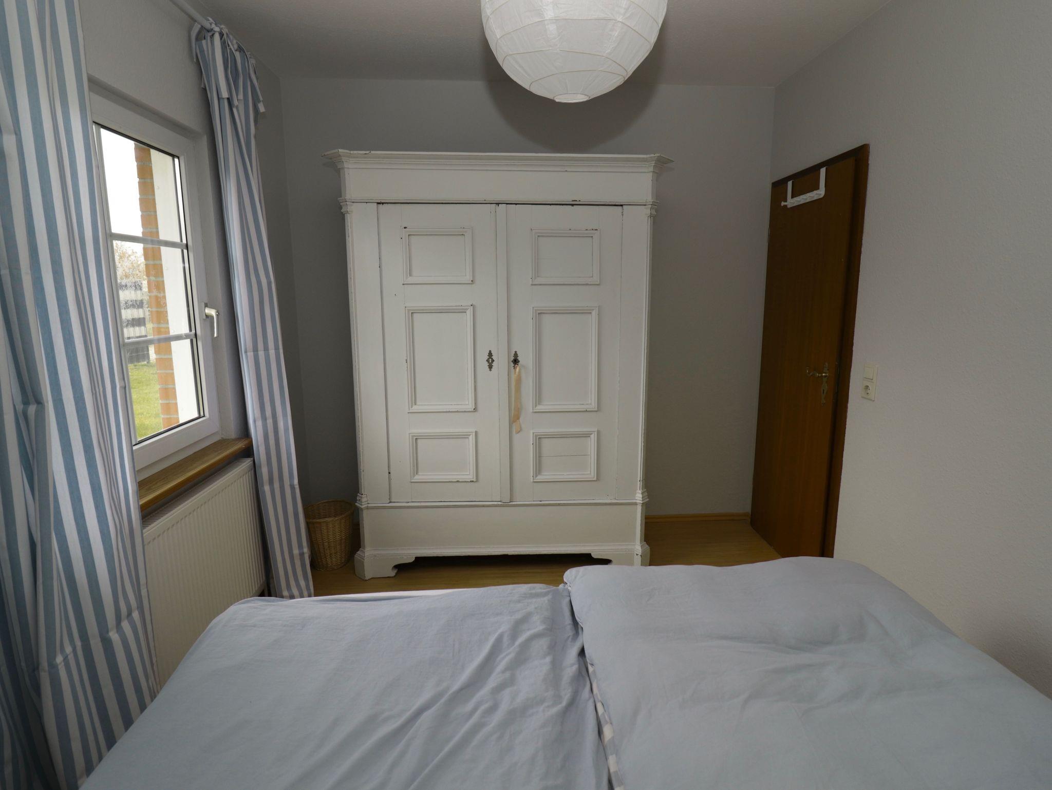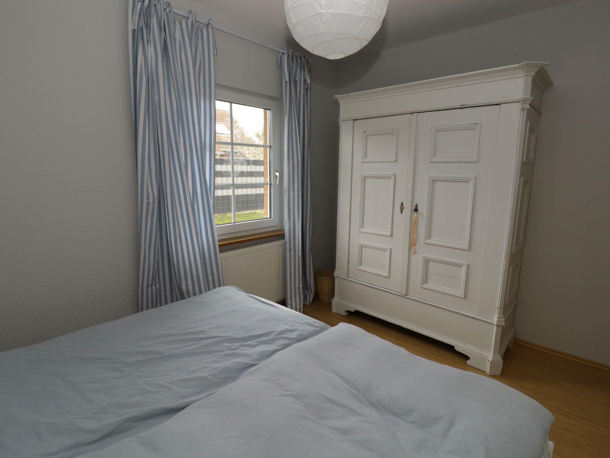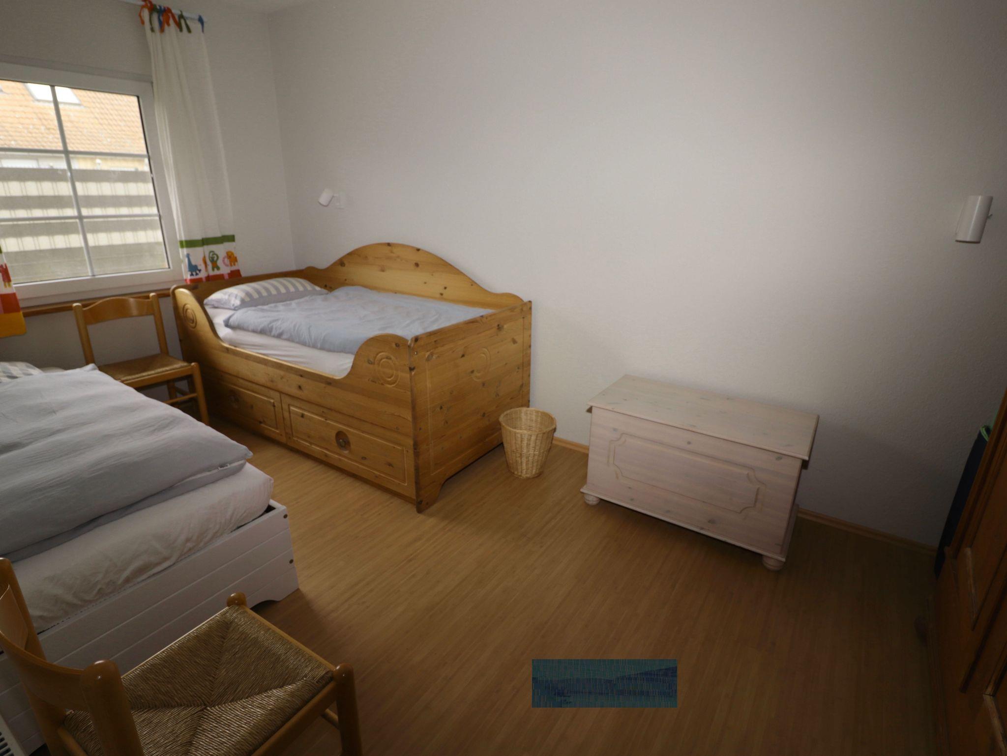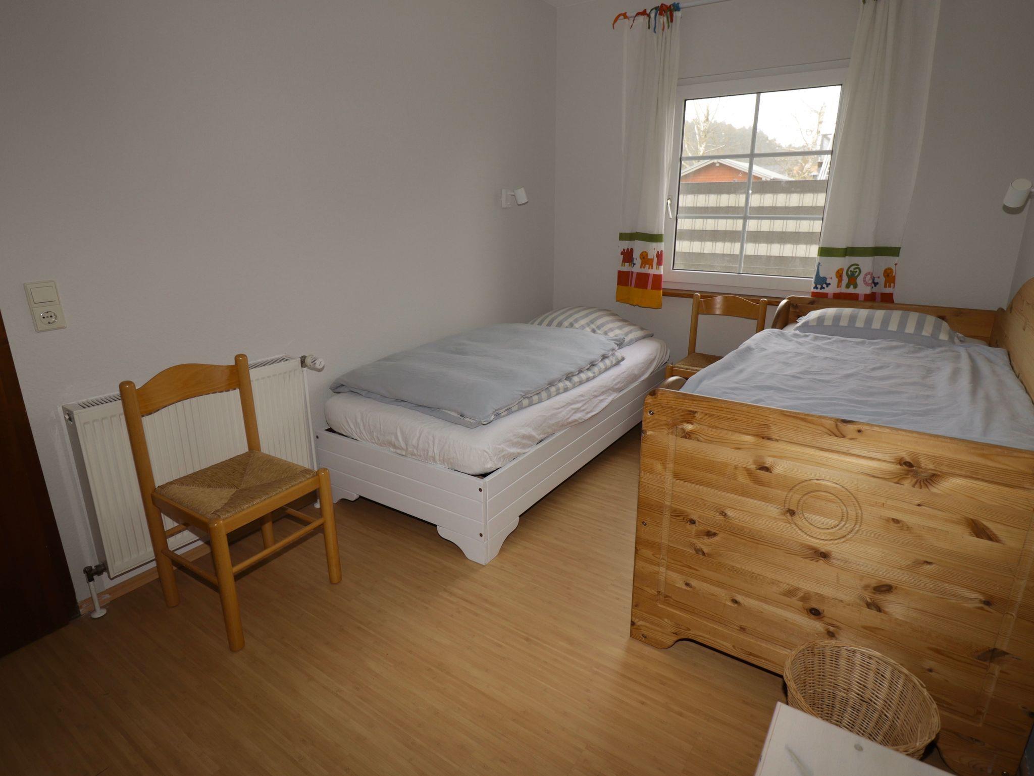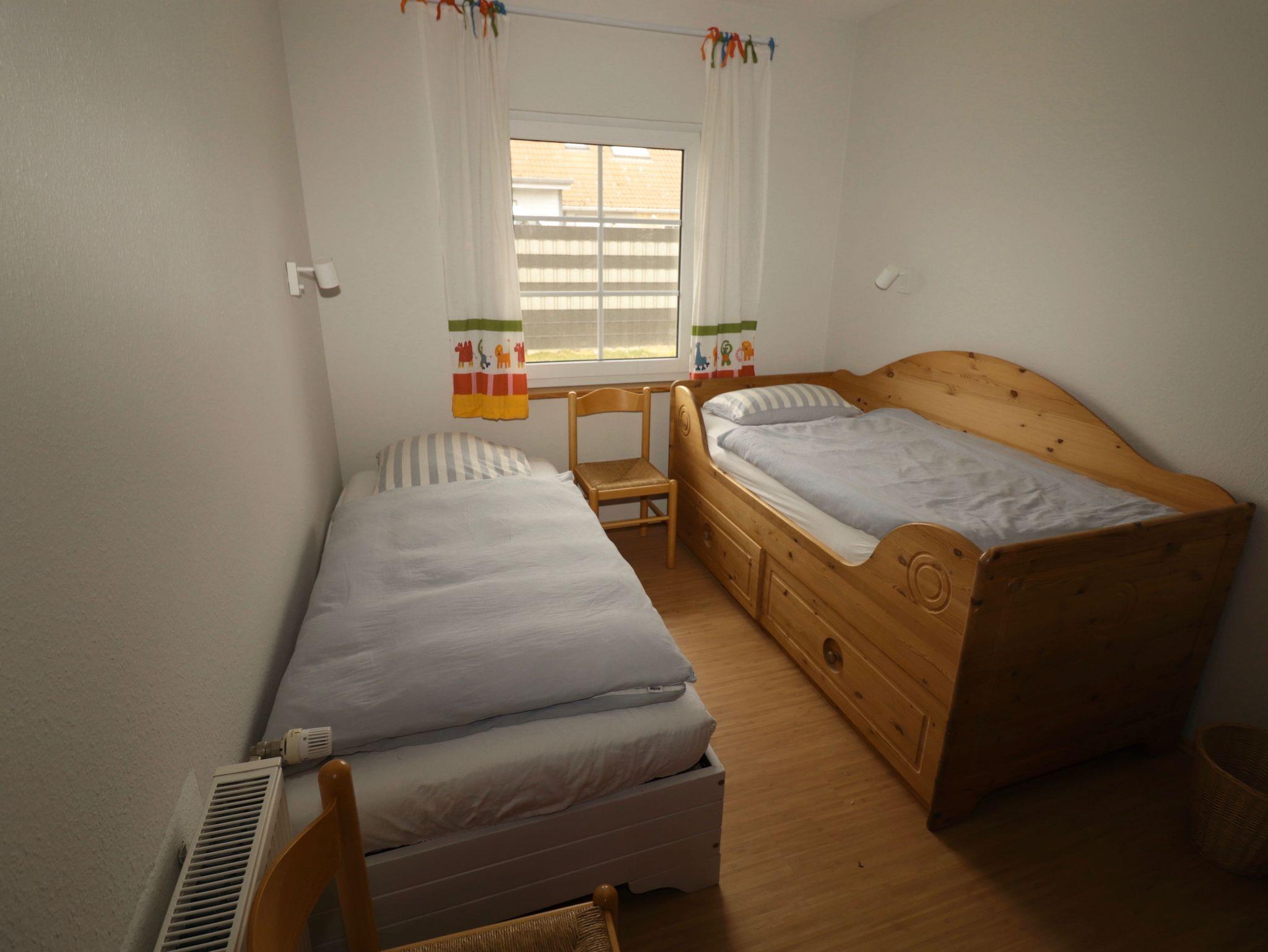 Im Kinderzimmer daneben befinden sich zwei Kastenbetten mit den Maßen 90 x 200 cm, eines davon mit Seitenteilen an drei Seiten und mit Schubläden ausgestattet. Weiterhin steht dort ein schlichter antiker Kleiderschrank des vorletzten Jahrhunderts aus geöltem massivem Nadelholz gearbeitet. In einer Holztruhe ist Kinderspielzeug untergebracht. Für Babys und Kleinkinder gibt es zwei der bewährten aufklappbaren Kinderbetten von 140 cm Länge und dazu passende separate Matratzen.