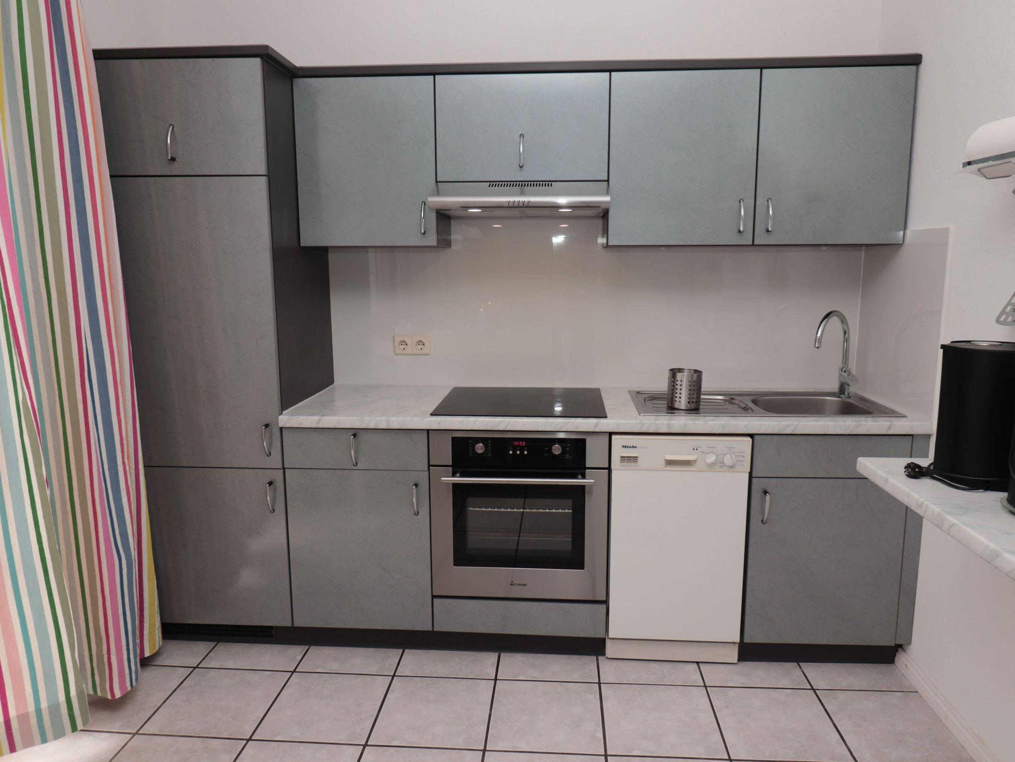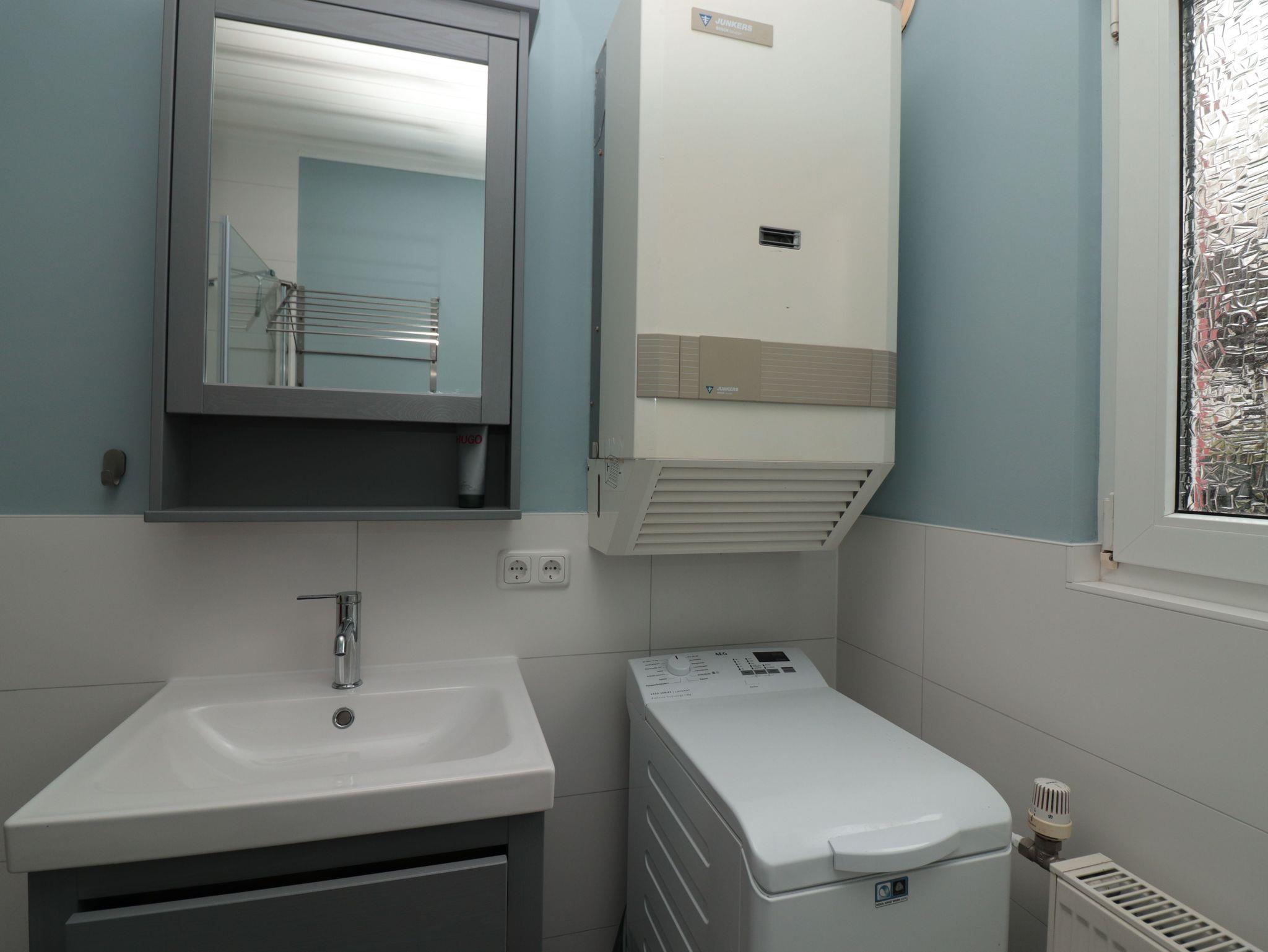 Über einen kleinen Flur erreicht man das ebenfalls 2024 vollständig renovierte Duschbad mit großzügiger bodenebener Duschkabine, einem Hänge-WC und Waschtisch. Außerdem befindet sich dort die Waschmaschine, die als Toplader von oben zu bedienen ist.