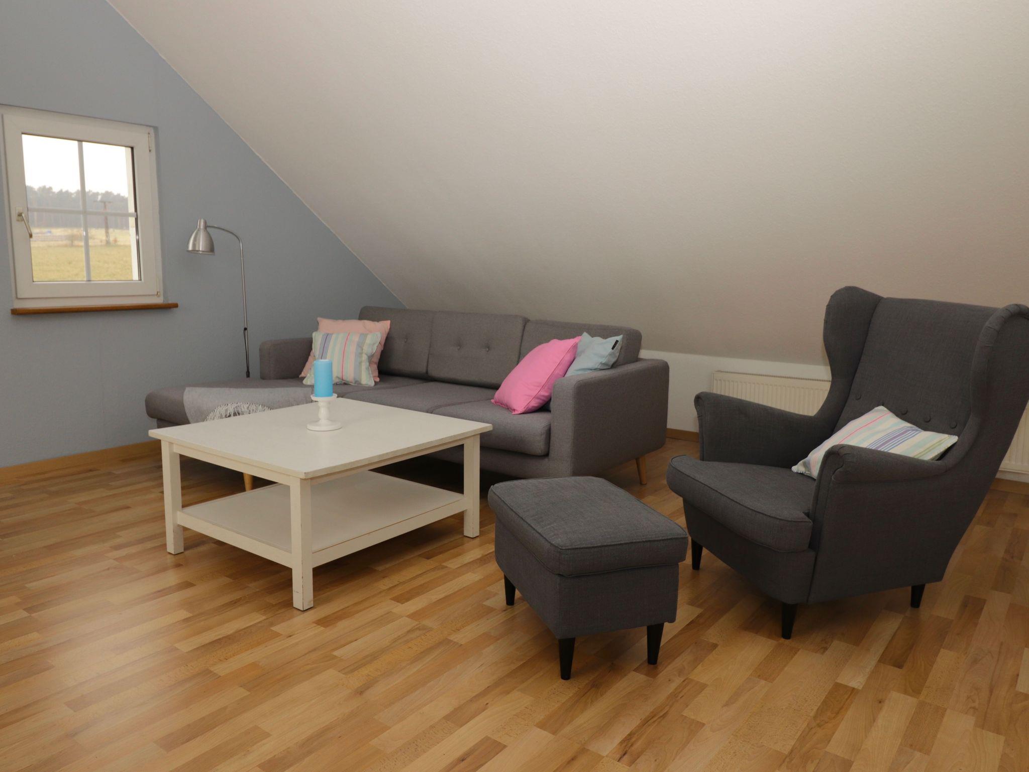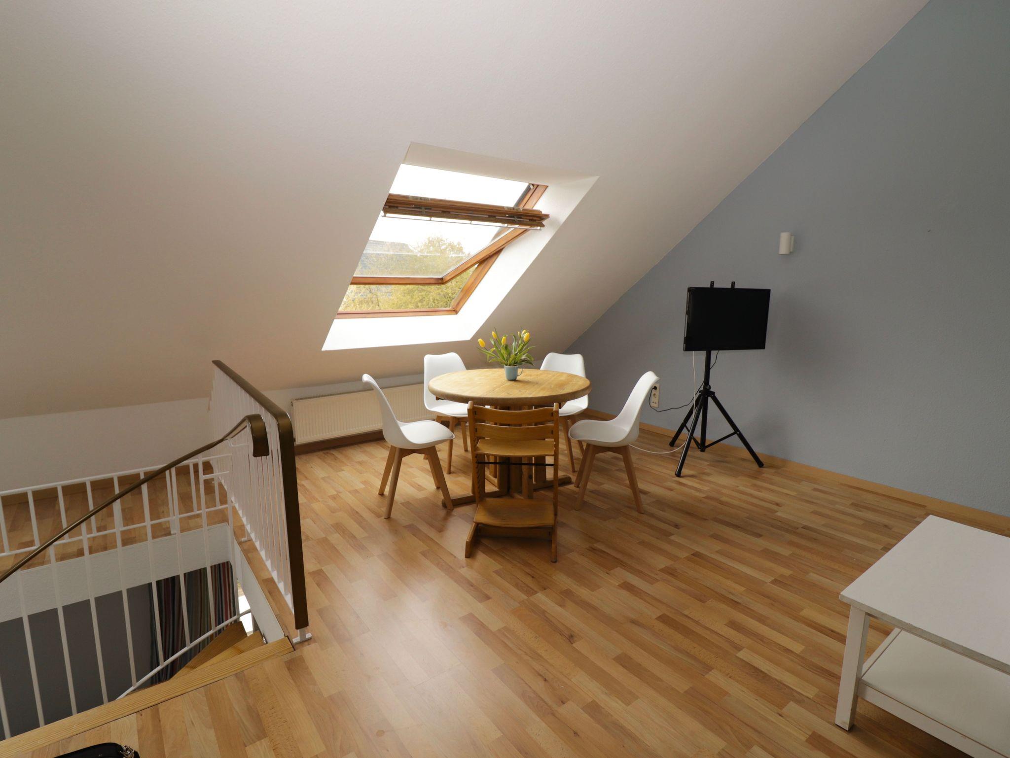 Im großzügigen Wohnbereich unter dem Dach steht ein runder massiver Holztisch mit modernen Kunststoffschalenstühlen und auch hier einem TrippTrapp Kinderstuhl. Für die gemütlichen Stunden findet sich hier ein Dreier-Sofa mit Recamière und ein einzelner Ohrensessel mit Sitzbank. Diese Möbel sind mit zeitlosem grauen Sofastoff bezogen und mit bunten Kissen aufgefrischt. Mit dem Flachbildfernseher, der an einem Dreibeinstativ befestigt ist, werden zahlreiche Sender per Satellitenantenne empfangen.