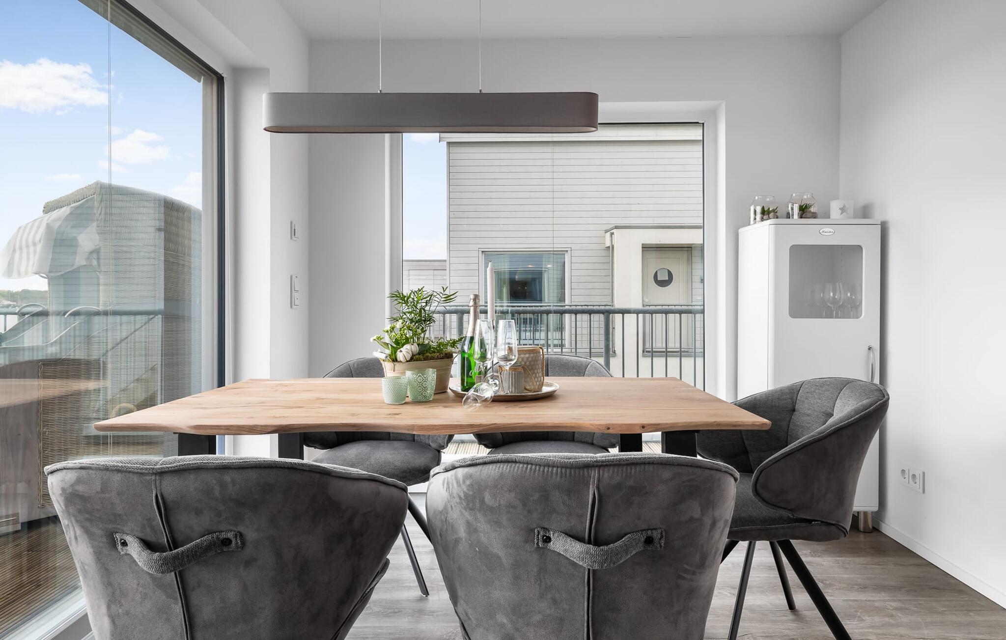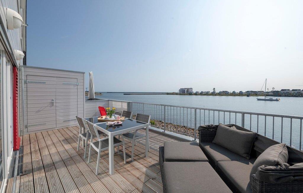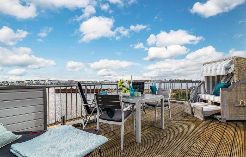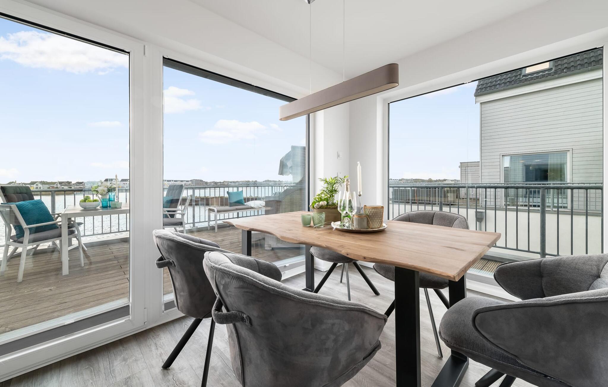 En fantastisk udsigt åbner op på terrassen ved siden af ??spisepladsen med udsigt over sejler- og sportsbådshavnen i OstseeResort Olpenitz. Uanset om det er en romantisk middag i levende lys eller en hyggelig grillfest, er en havnebiograf og en fantastisk solrig udsigt garanteret. Komfortable havemøbler og en elektrisk grill er til rådighed til feriebrug.