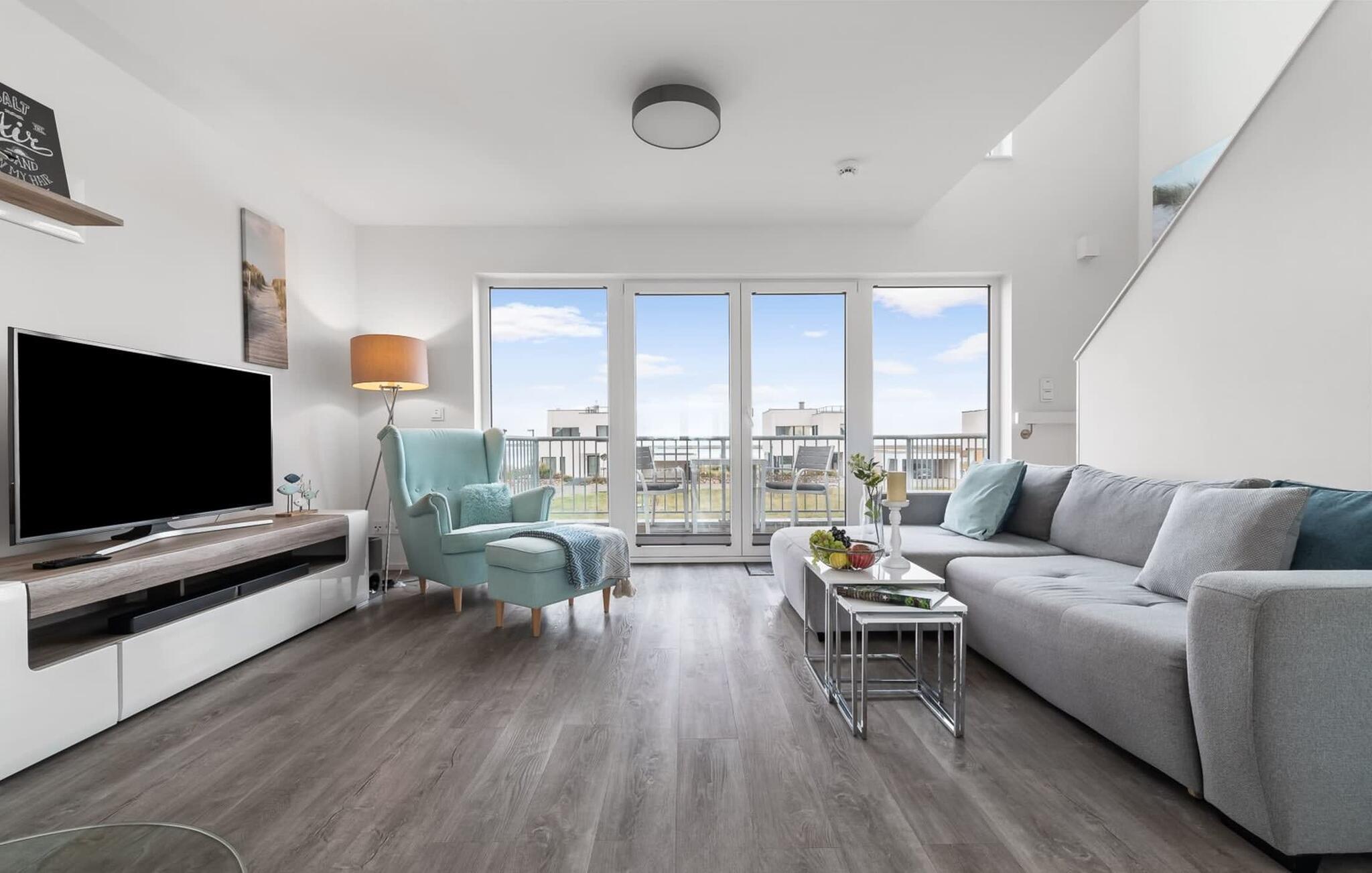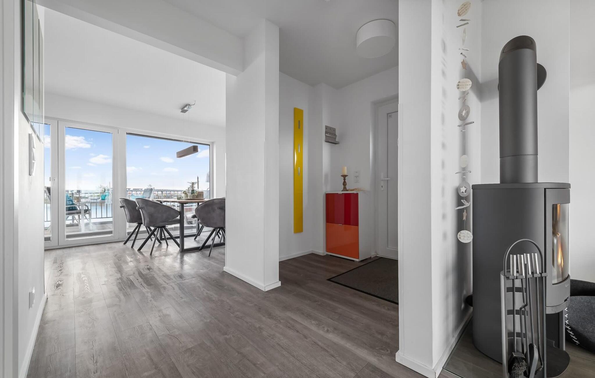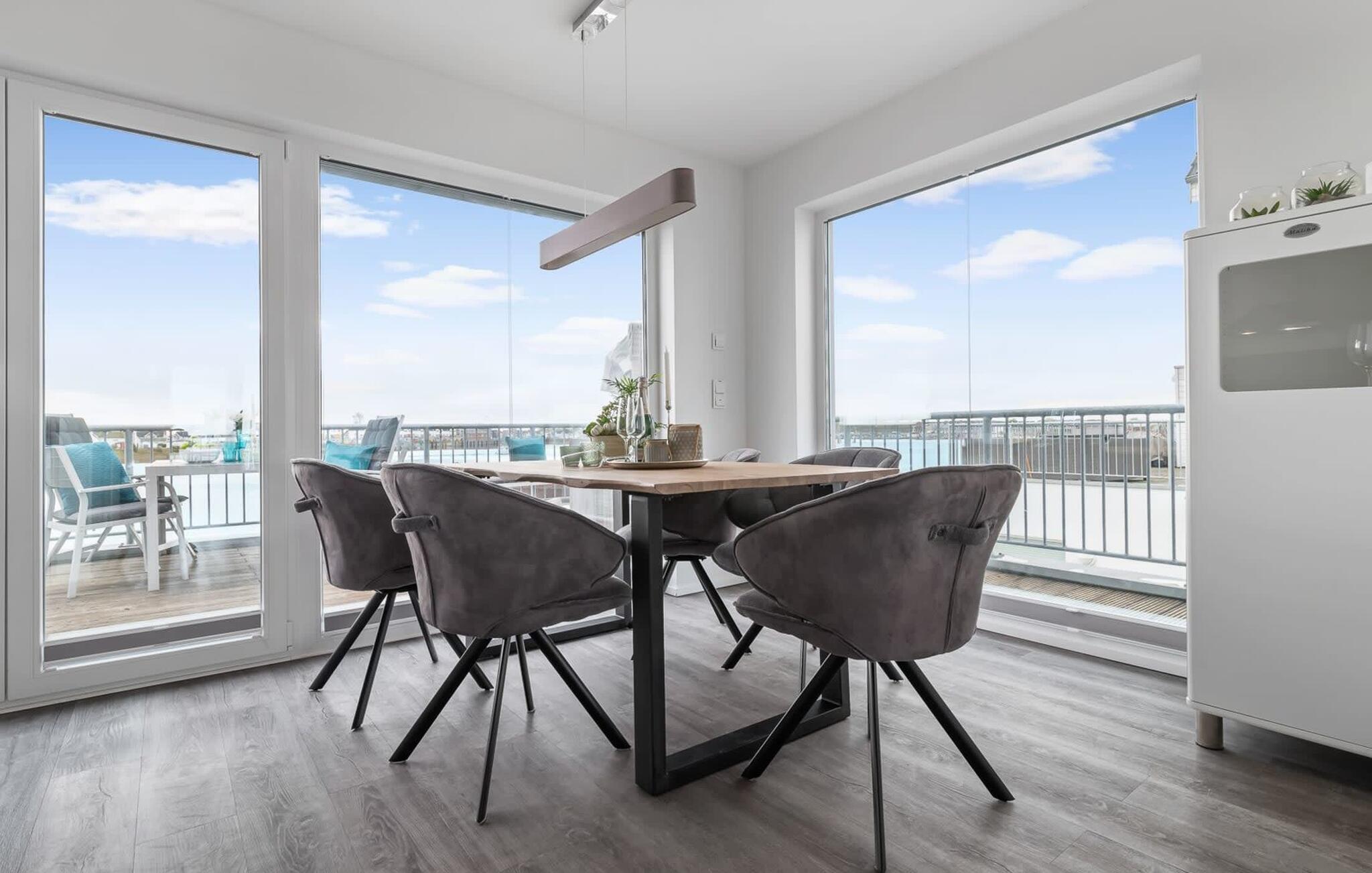 En fantastisk udsigt åbner op på terrassen ved siden af ??spisepladsen med udsigt over sejler- og sportsbådshavnen i OstseeResort Olpenitz. Uanset om det er en romantisk middag i levende lys eller en hyggelig grillfest, er en havnebiograf og en fantastisk solrig udsigt garanteret. Komfortable havemøbler og en elektrisk grill er til rådighed til feriebrug.