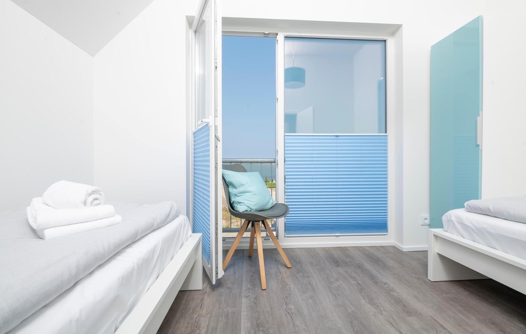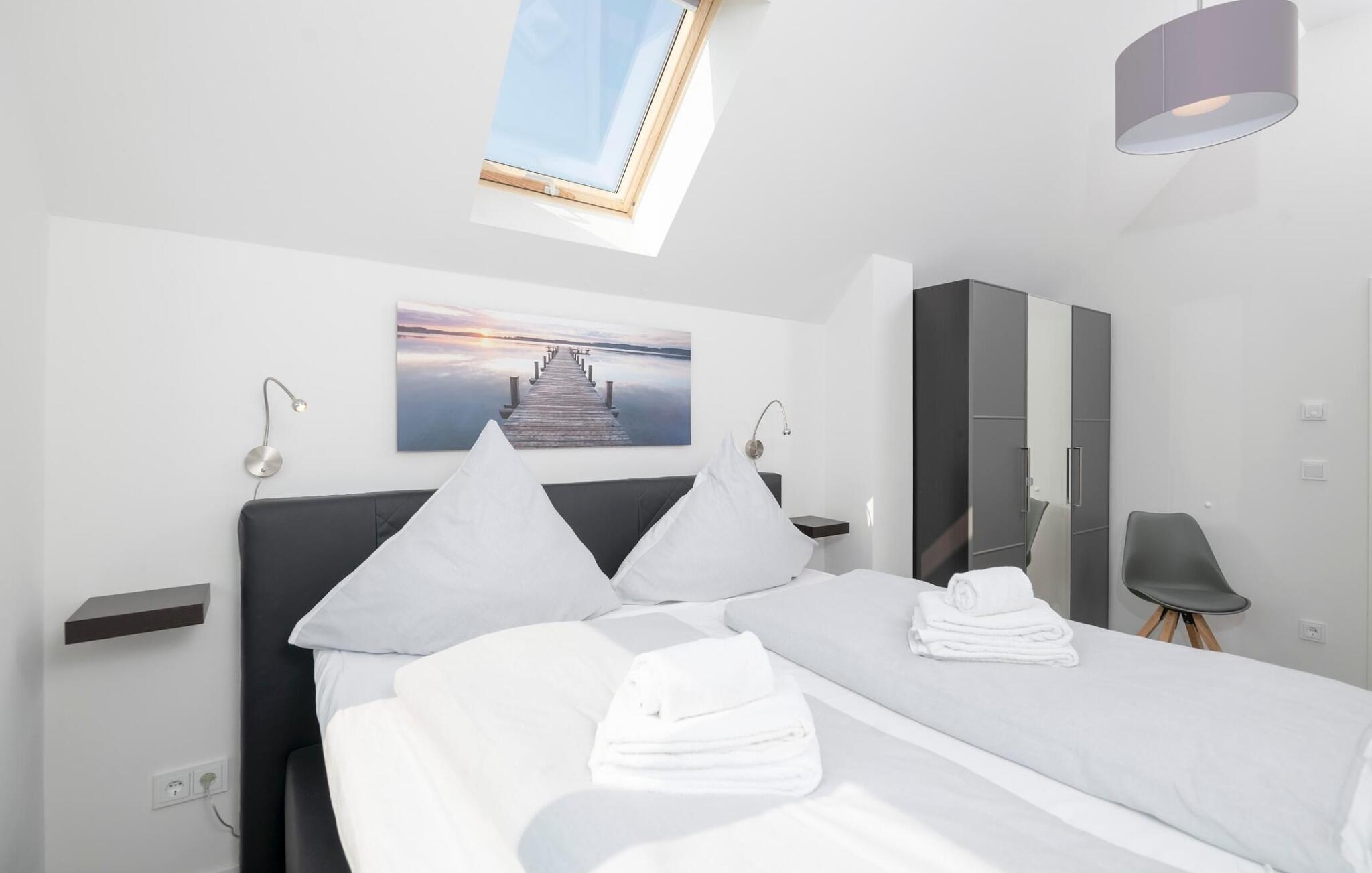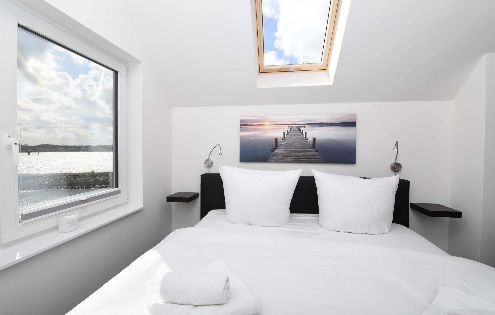 Ferielejlighedens drømmeland er på andet niveau. Det store soveværelse har en fantastisk udsigt over havnen og er udstyret med en højkvalitets boxmadras. Fald i søvn under stjernerne, et ovenlys giver jer ikke kun mulighed for at se stjernehimlen, men også de drømmeagtige skyformationer, der er så karakteristiske for norden. Det andet soveværelse byder på to enkeltsenge og en enestående udsigt over Schleien, de første sejlbåde kan ses tidligt om morgenen!