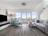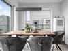 Stuen/spisestuen er oversvømmet med lys med gulv-til-loft panoramavindue, der fører til de tilstødende terrasser på begge sider.