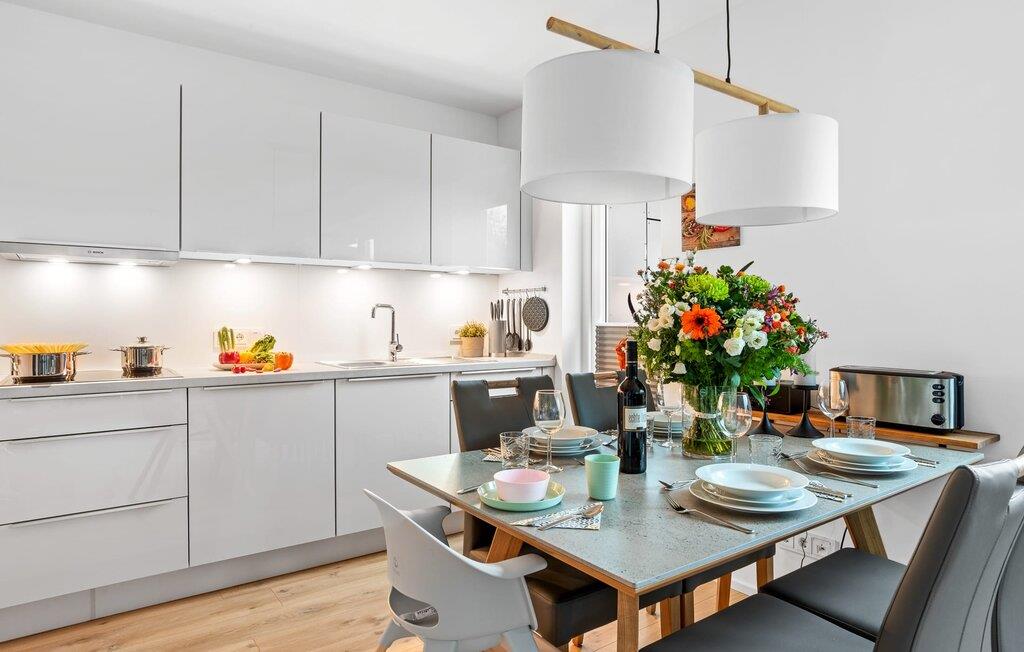 Det integrerede køkken er perfekt udstyret, og det er sjovt at lave mad sammen. Så nyd de færdige lækkerier på terrassen eller start en hyggelig grillaften med Weber el-grill. Det er ren ferie.