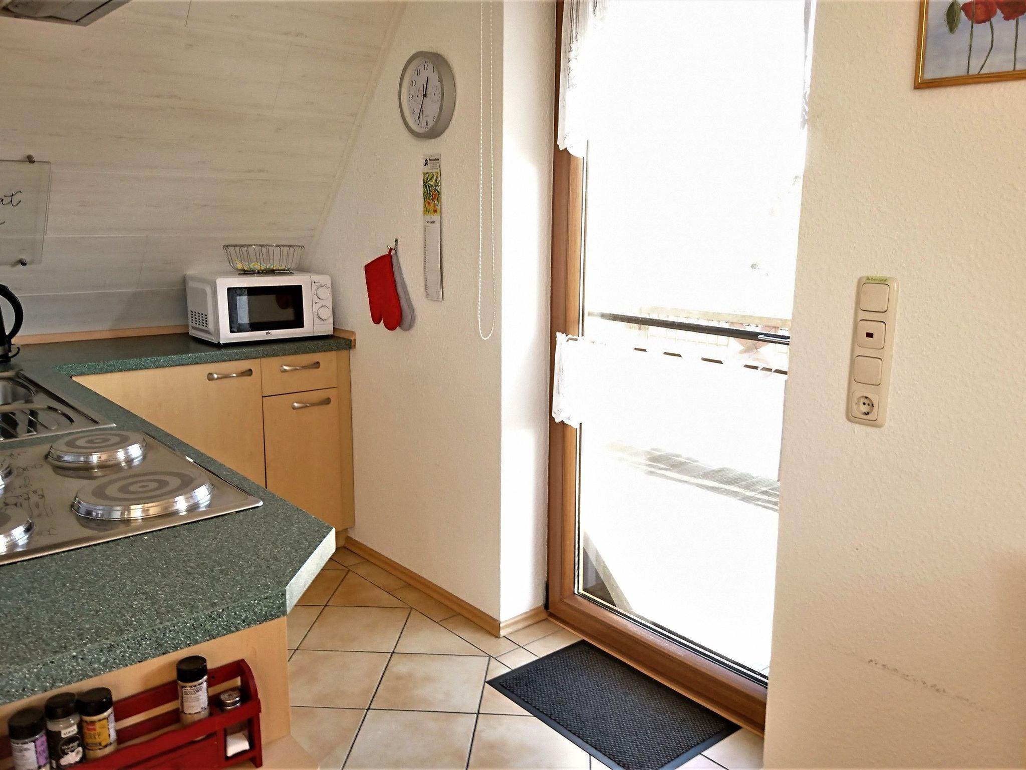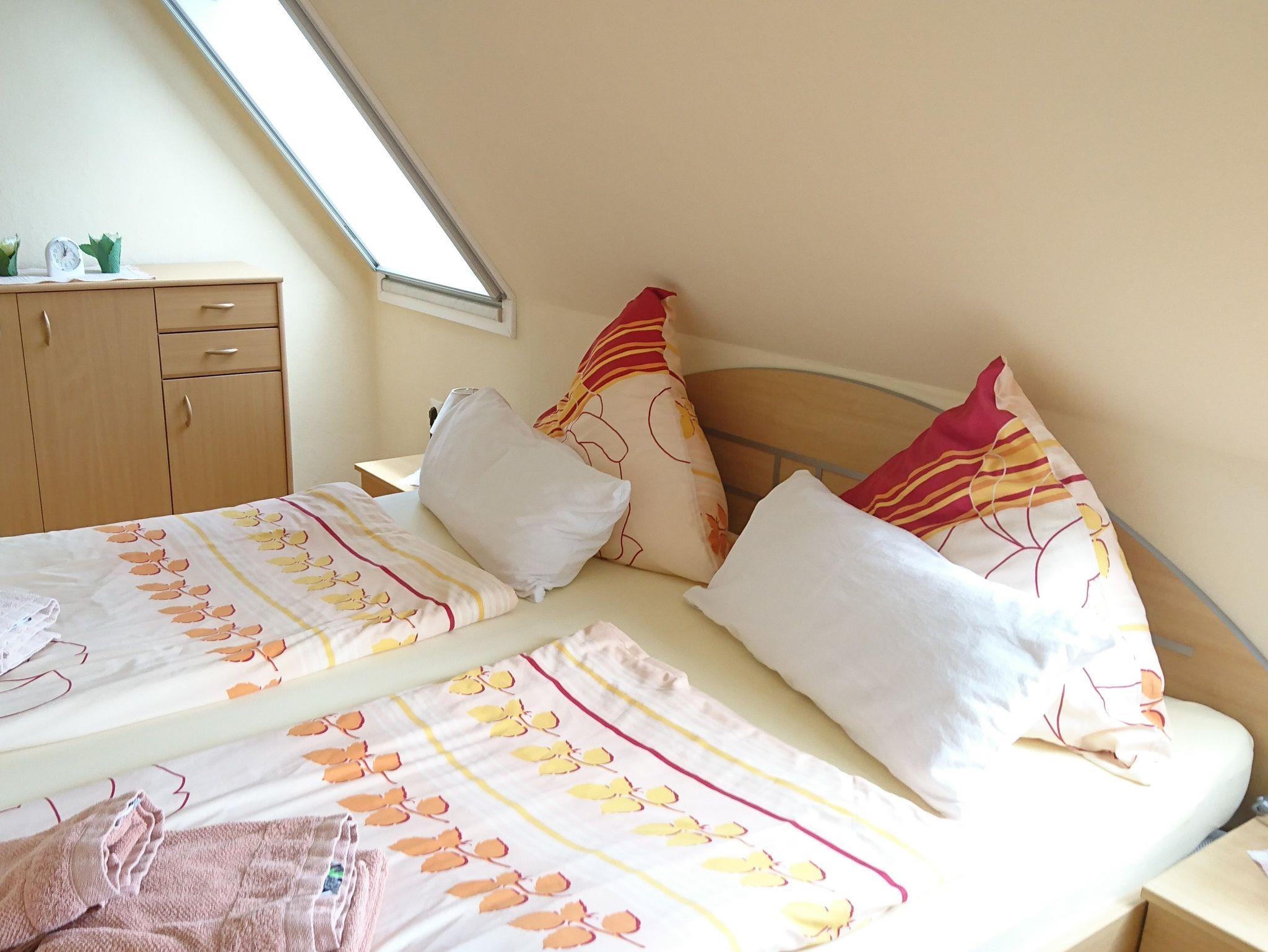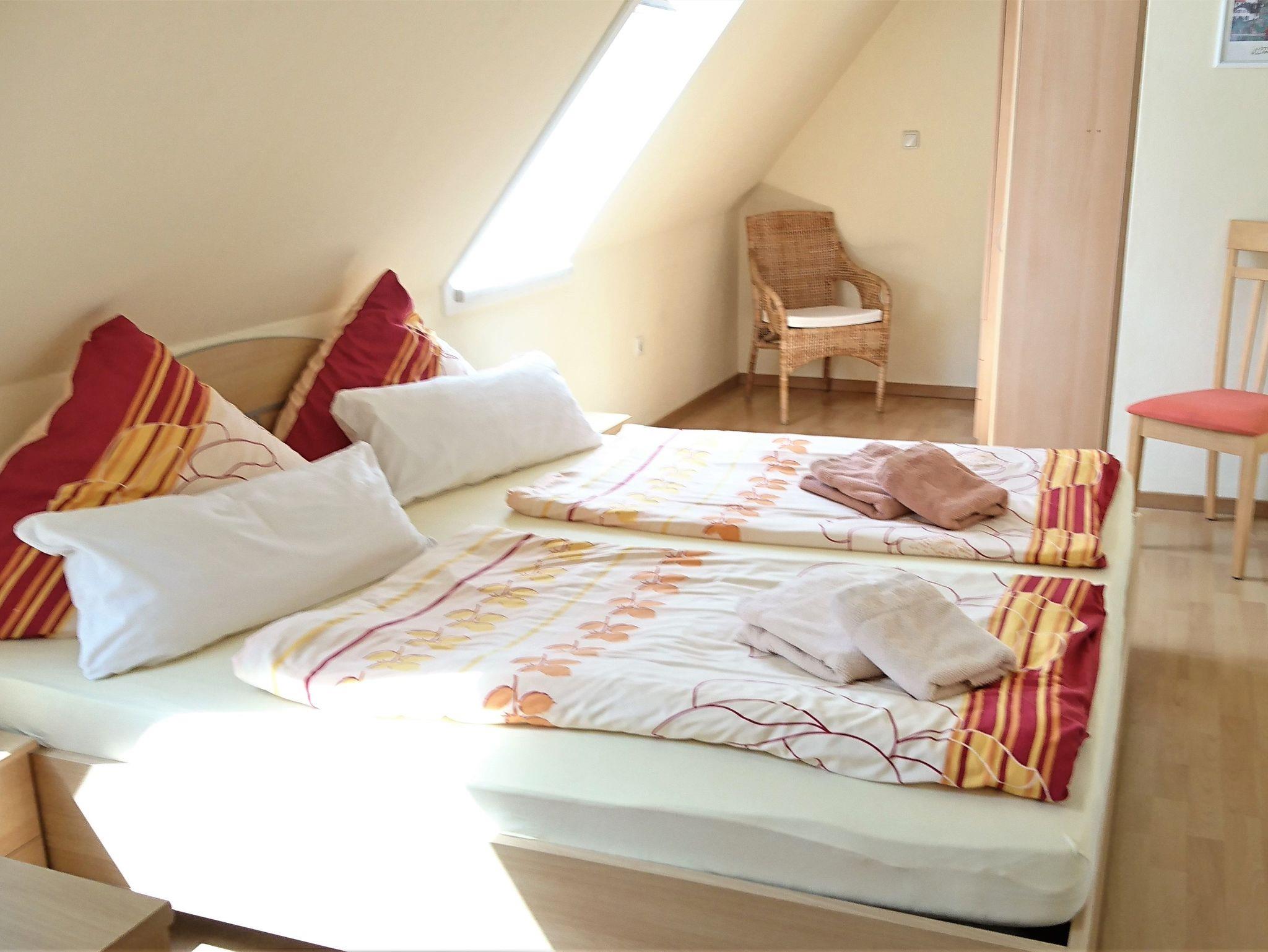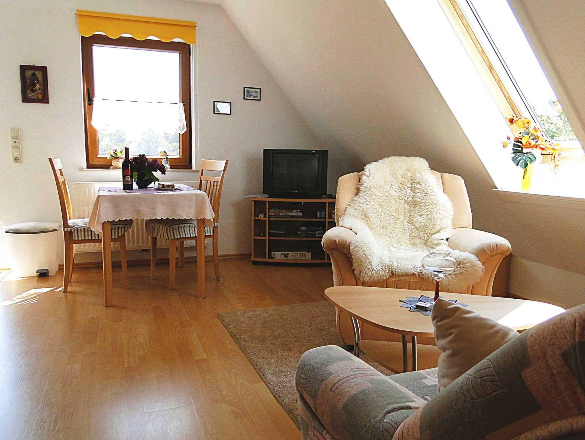 Wohnzimmer mit integrierter Küchenzeile (4-Plattenherd mit Backröhre), Kühlschrank mit Gefrierfach, Kaffeemaschine, Eier- u. Wasserkocher, Sat-TV, Radio mit CD-Player, Wecker, Schlafzimmer (1 Aufbettungsmöglichkeit im SZ, Kinderbett und -stühlchen können gestellt werden),