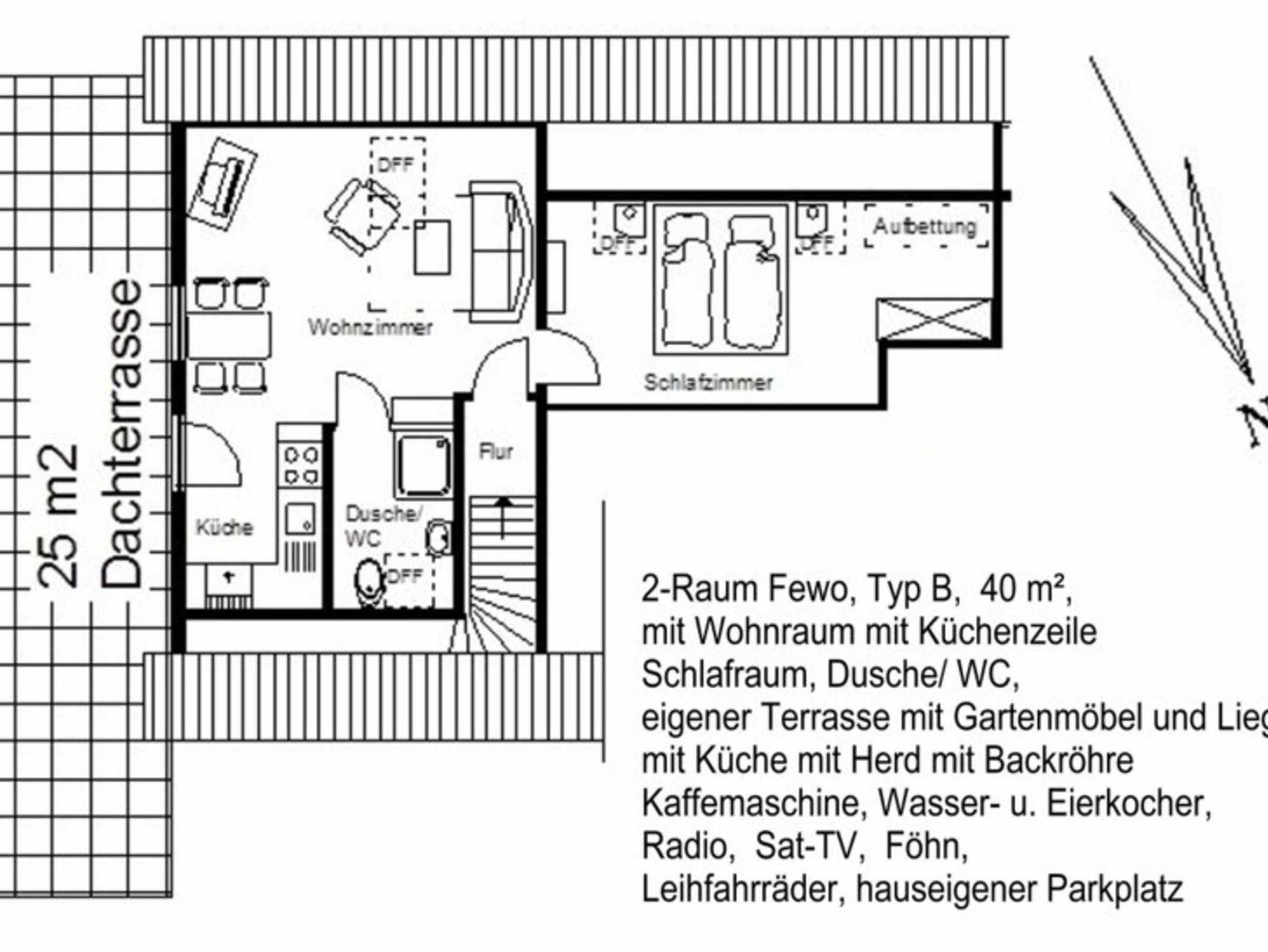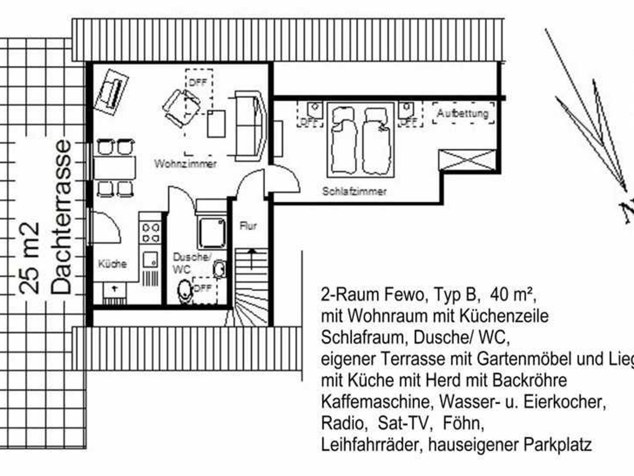 Schlafcouch im WZ, die Dachfenster haben von außen Sonnenschutzrollos), Du/WC, Fön u. Große Dachterrasse mit Gartenmöbel, Liegen und Elektrogrill. Hier ist man absolut ungestört, da niemand Einsicht auf die Terrasse haben kann.