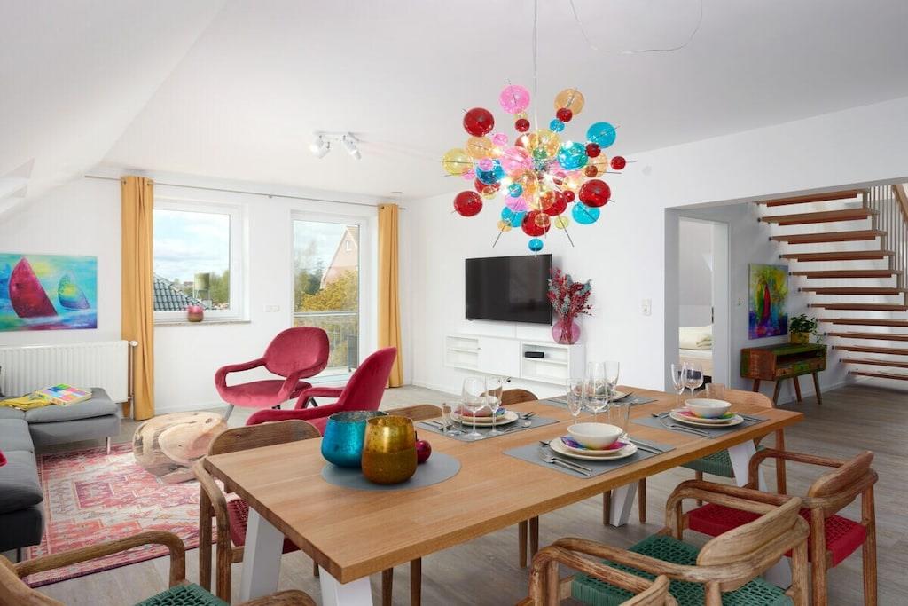 Velkommen til "Pink Dream", en af vores fire stilistisk unikke kunstlejligheder. En rummelig, stilfuldt møbleret maisonette-kunstlejlighed med malerier af kunstneren Sabine Körner som tema. I stueetagen er der en generøs stue og spisestue med direkte adgang til den møblerede balkon, et fuldt udstyret køkken af høj kvalitet med køleskab, fryser, ovn, opvaskemaskine og stort spisebord, et rummeligt soveværelse med en stor tredobbeltseng (270/200 cm), et komplet badeværelse med bruser, badekar, vaskemaskine og tørretumbler samt en stor, åben entré med et klædeskab. Ovenpå er der to komfortabelt møblerede soveværelser: et med en dobbeltseng (180x200 cm) og det andet med to enkeltsenge (90x200 cm). Mellem soveværelserne i gangen er der et afslapningshjørne med en sækkestol og bøger. Maisonette-lejligheden tilbyder gratis Wi-Fi, to smart-tv'er, en Bluetooth-højttaler, brætspil og bøger. Separat bryggersskab med støvsuger, strygejern, strygebræt, brandslukker, førstehjælpskasse og rengøringsmidler. ...