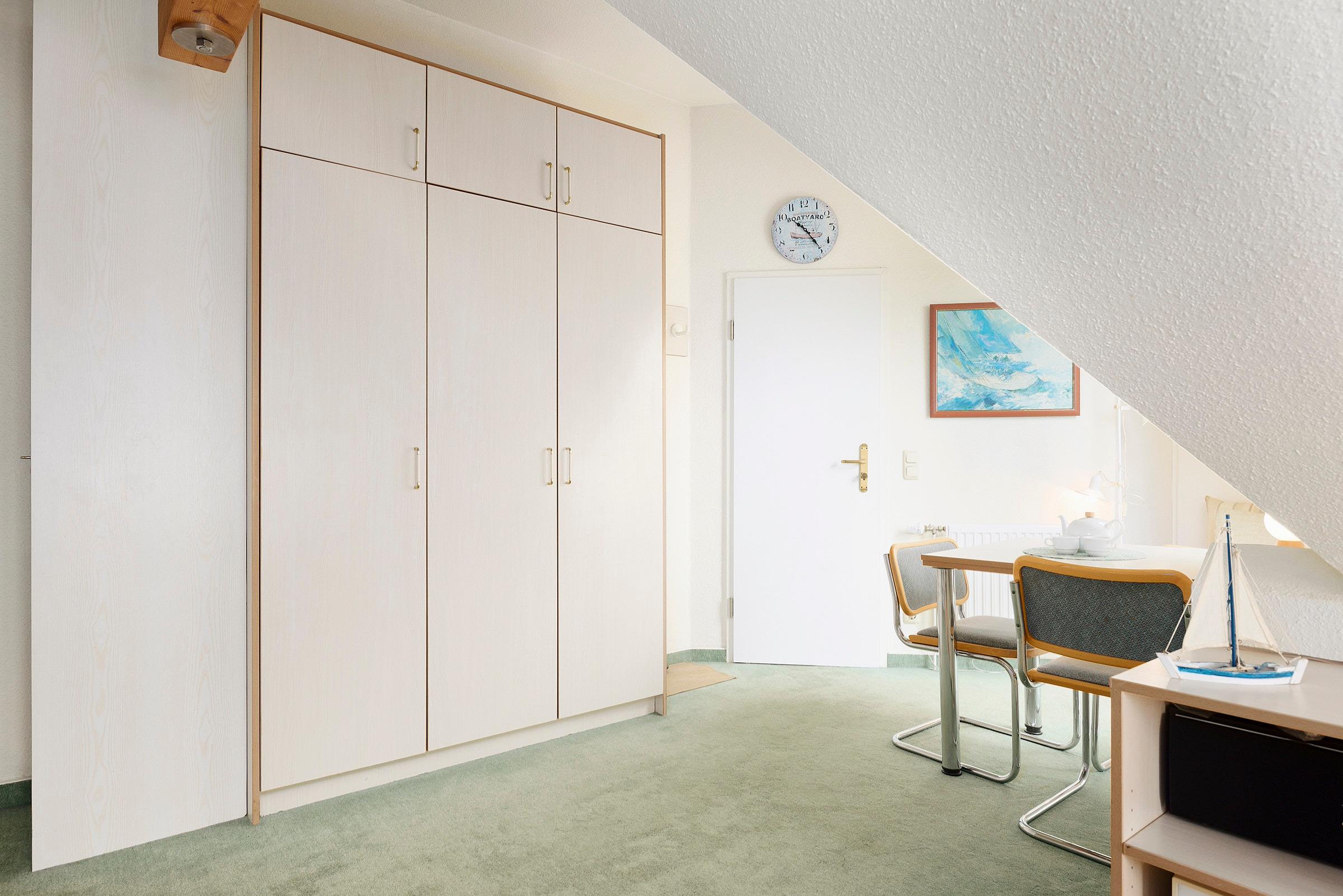 Als Schlafmöglichkeit dient ein Schlafsofa (150x200 cm) im Wohn-/Schlafbereich. Zusätzlich steht Ihnen ein Schlafsessel zur Verfügung. Die Dachschrägen verleihen der Wohnung einen besonderen Charme. Die offene Küchenzeile ist gut ausgestattet. Das innenliegende Badezimmer erwartet Sie mit einer Dusche. Das Highlight dieser Wohnung ist jedoch der Ostseeblick. Vom möblierten Balkon genießen Sie einen einmaligen Blick auf die Kieler Förde.