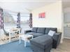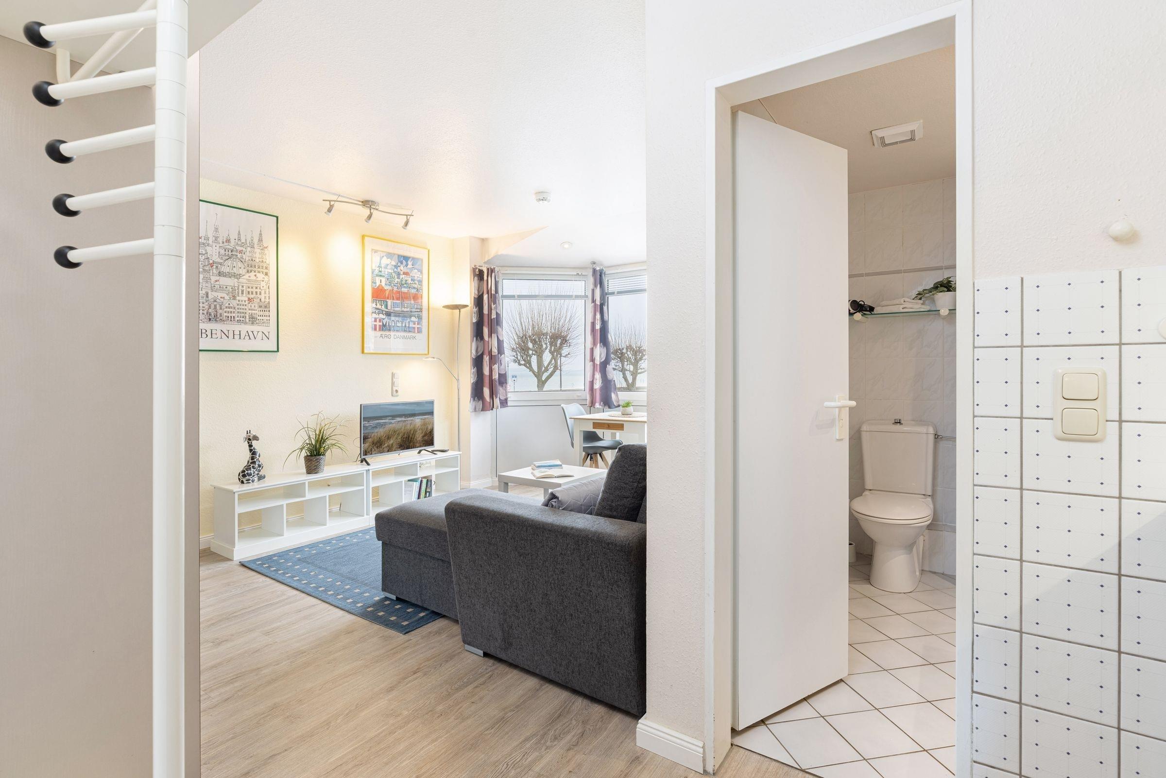 Die kleine 1-Zimmer-Ferienwohnung für 2 Personen mit seitlichem Meerblick befindet sich im Hochparterre des Appartementhauses Panorama direkt an der Strandpromenade von Laboe.