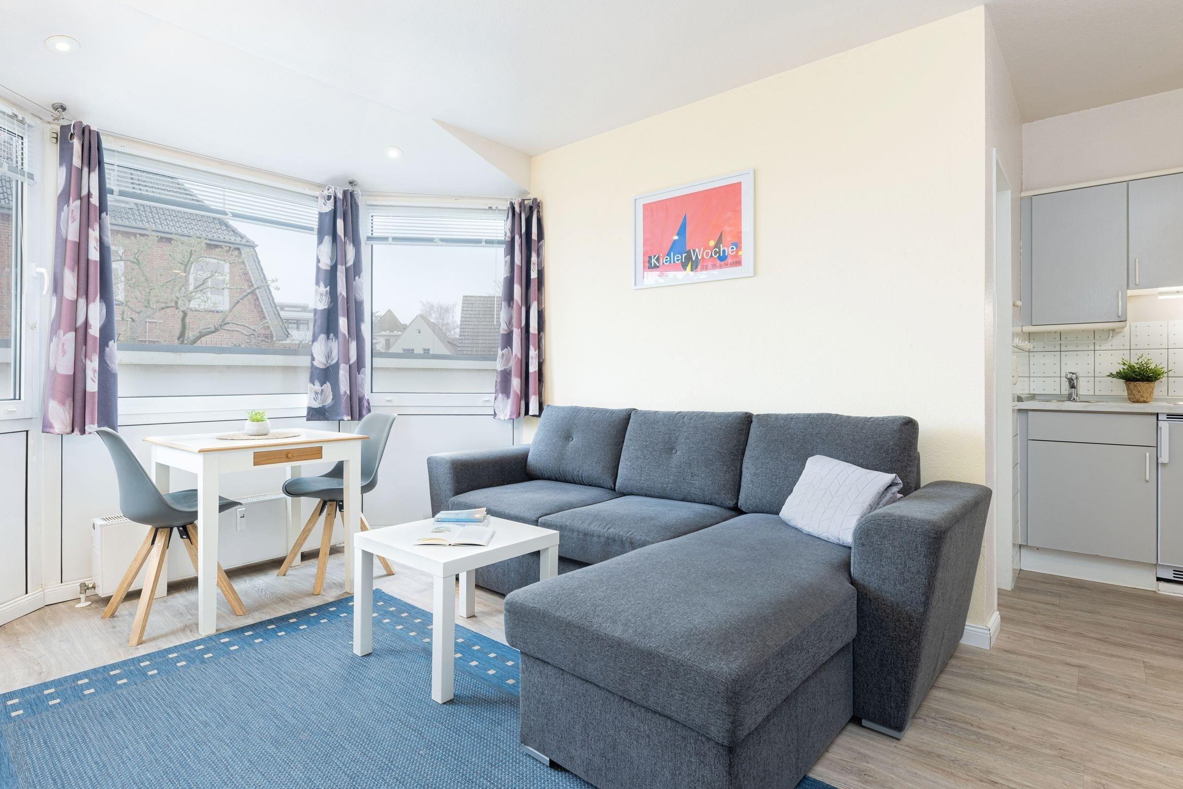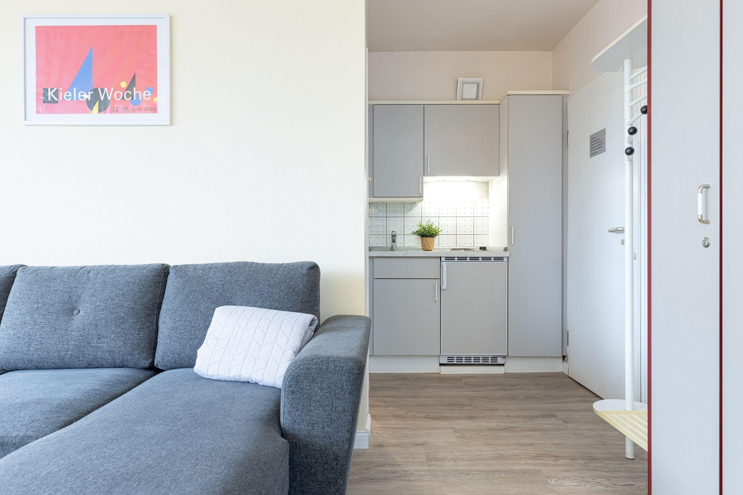 In diesem gemütlichen eingerichteten Appartement wohnen Sie in der 1. Strandreihe. Sie befinden sich hier nur wenige Schritte vom Strand und der Kieler Förde entfernt. Auf ca. 22 m² Wohnfläche befinden sich ein kombinierter Wohn- und Essraum mit Schlafsofa, TV, Essecke sowie eine offene Küchenzeile.