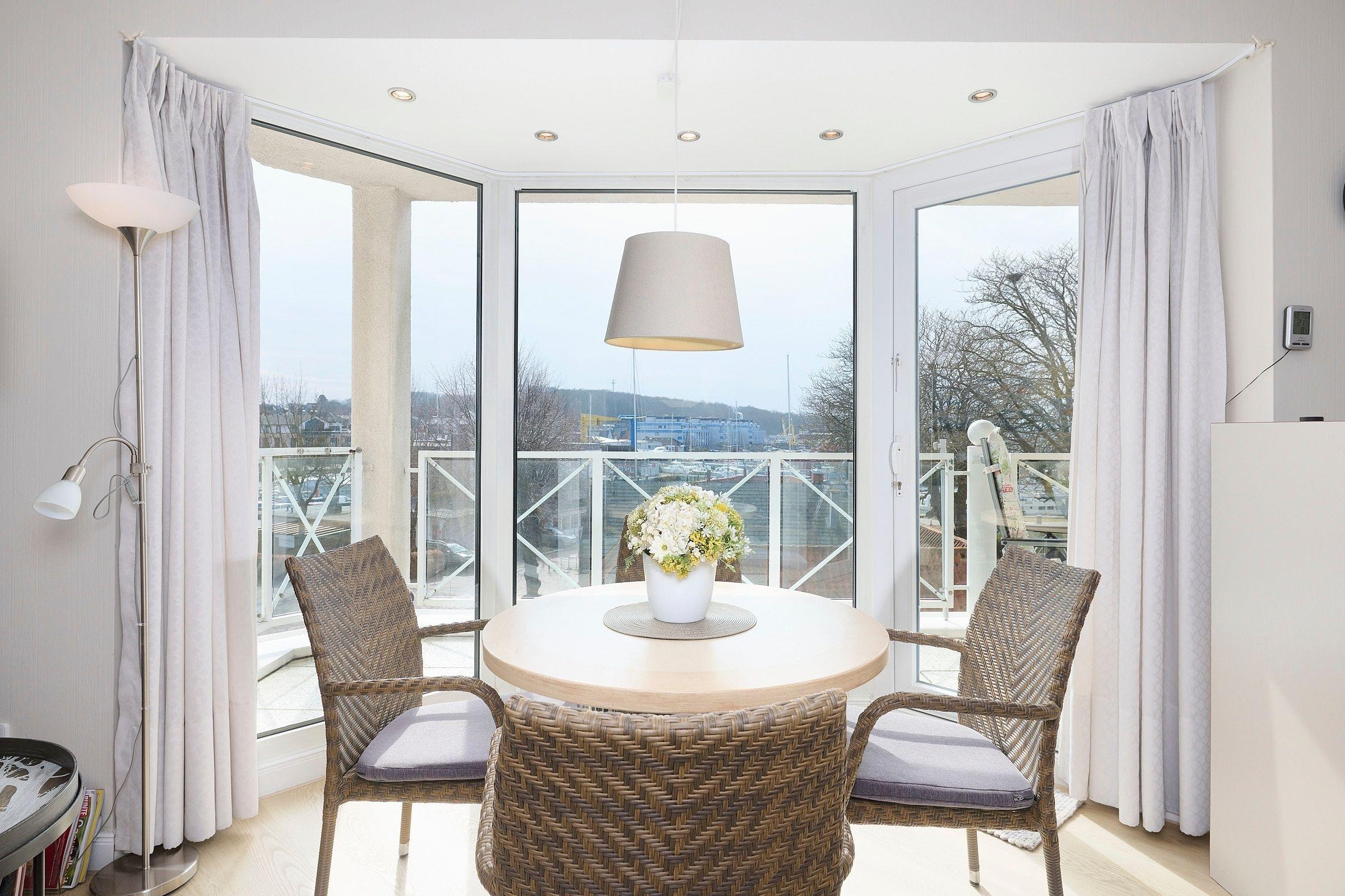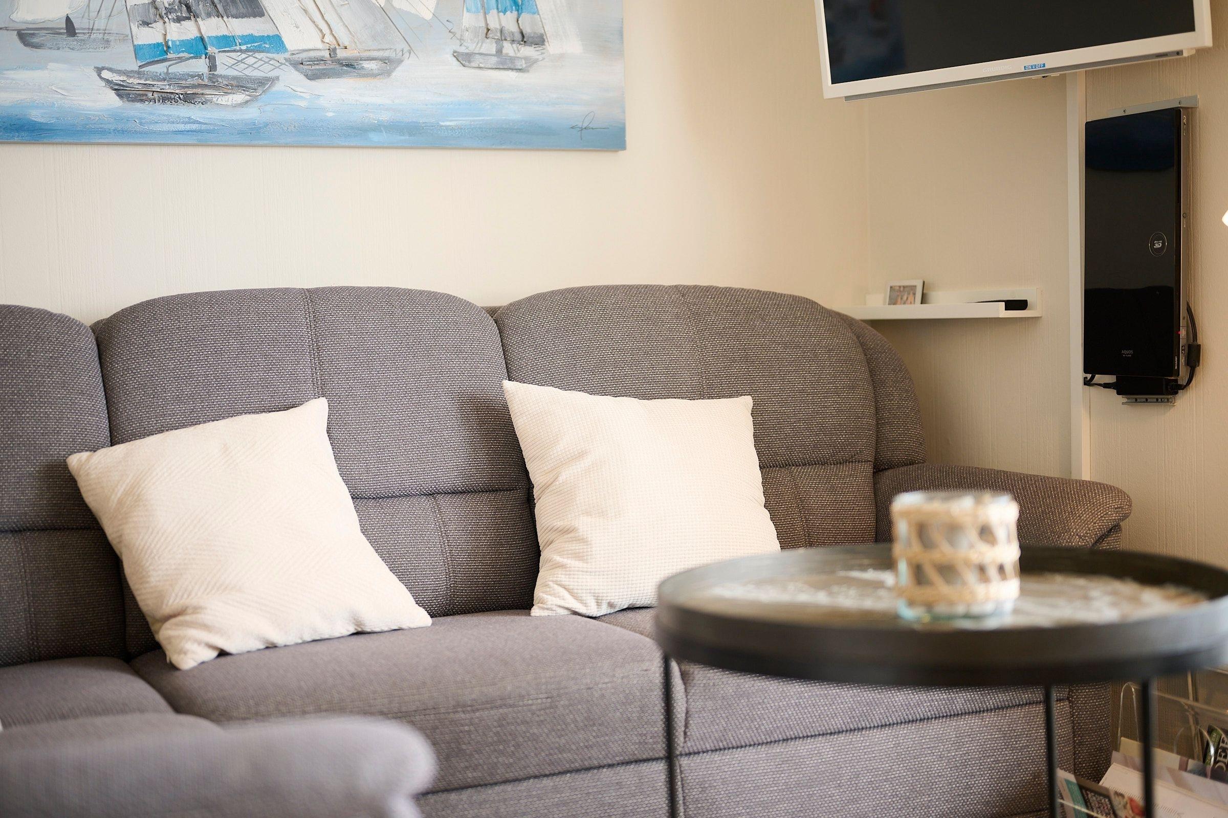 Für eine angenehme Nachtruhe stehen Ihnen ein geschlossener Schlafraum mit Doppelbett (160x200 cm) sowie eine neuwertige Schlafcouch (130x200 cm) im Wohnbereich zur Verfügung. In der offenen Küche fehlt es Ihnen an Nichts. Auch das moderne Bad mit Regendusche lässt keine Wünsche offen. Vom Wohnzimmer, von Ihrem Essplatz und vom traumhaften Süd-Balkon genießen Sie einen unvergleichlichen Panoramablick über die Kieler Förde und den Hafen. Das Kommen und Gehen der Schiffe erleben Sie aus erster Reihe. Ihr Blick reicht vom Hafen bis über die Förde mit dem feinsandigen Ostseestrand. Falls die Sonne wider Erwarten einmal nicht scheinen sollte, bietet Ihnen der Flatscreen-TV mit angeschlossenem Blu-Ray-Player Unterhaltung der Extraklasse.