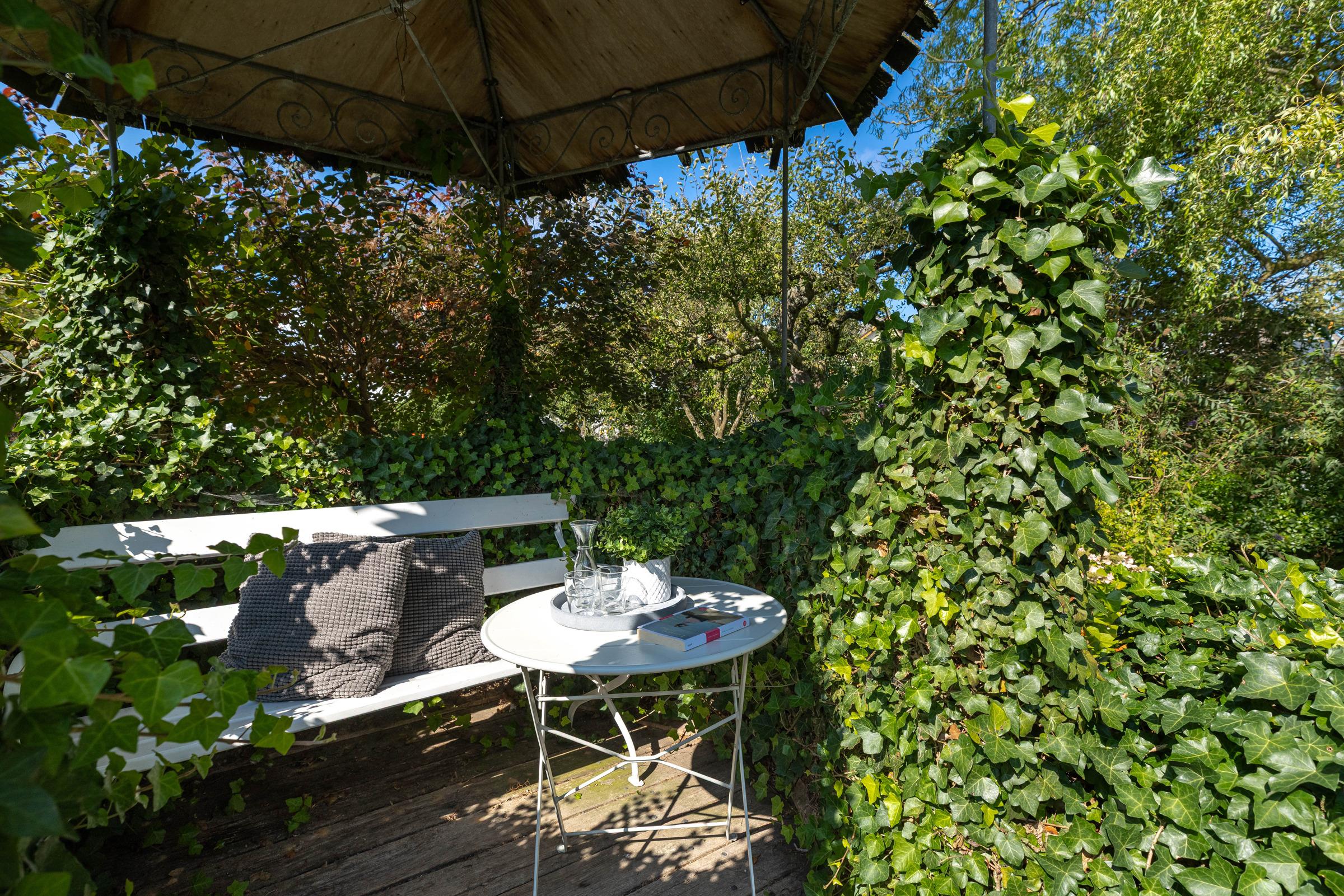 Die gesamte Einrichtung ist sehr gemütlich. Im Erdgeschoss befinden sich das Wohnzimmer mit einer integrierten Küchenzeile, das Duschbad und der sogenannte Alkoven (Bett) für 2 Personen (180x200 cm). Die vorgelagerte Terrasse mit Strandkorb steht Ihnen zur Eigennutzung zur Verfügung. Der wunderschöne Garten kann von allen Gästen gemeinschaftlich genutzt werden. Bitte beachten Sie, dass die Empore für Gäste nicht zur Verfügung steht.