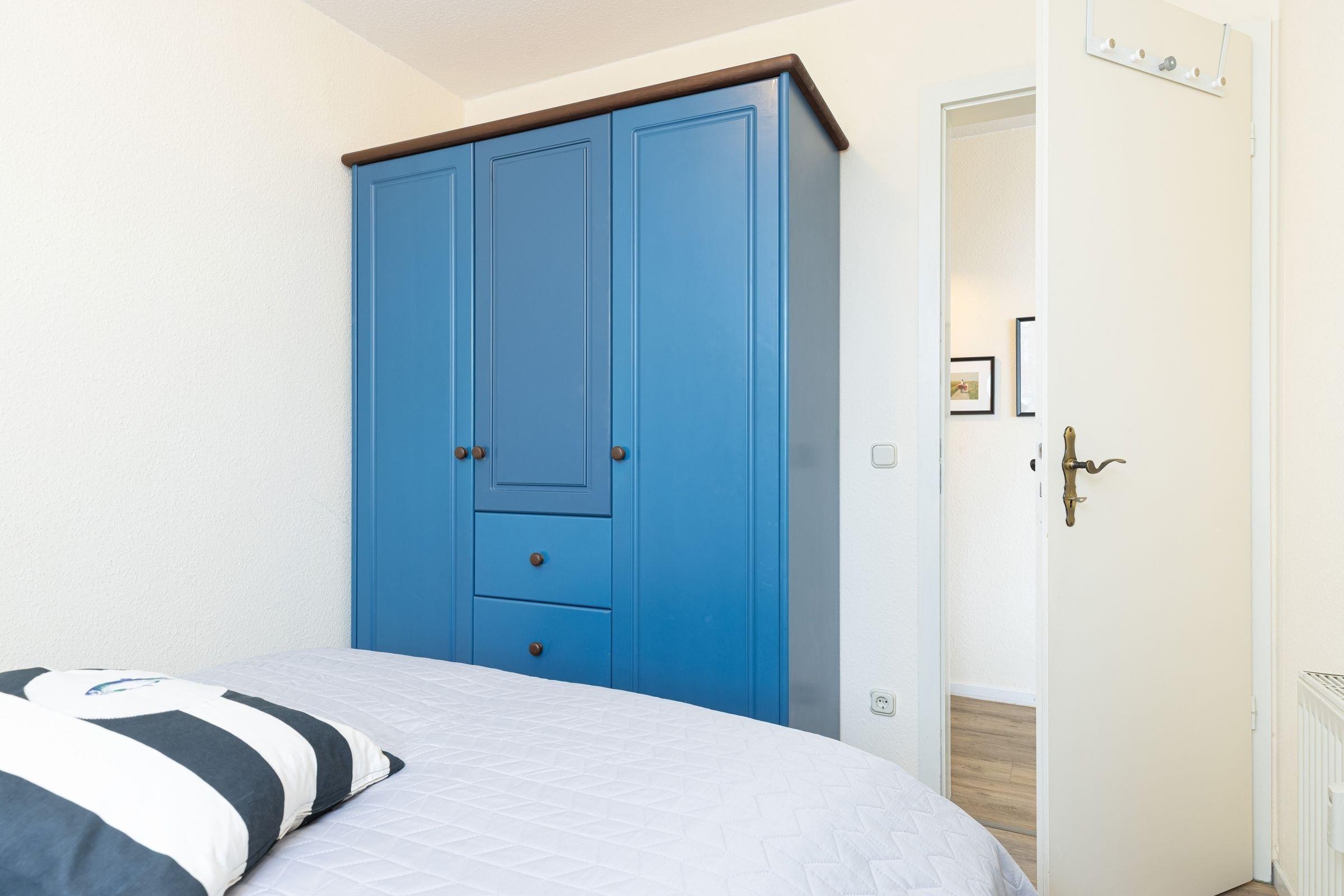 Das maritim eingerichtete Wohnzimmer empfängt Sie mit seinem fantastischen Blick und freie Sicht auf wilde Wellen und weiße Gischt. Ein Kaminofen sorgt für wohlige Wärme und gute Atmosphäre. Gemütliche Sitzgelegenheiten laden nach langen Strandspaziergängen zum Relaxen ein. Das Sofa bietet am Abend für zwei Personen Platz zum Schlafen. Ein Flat-TV, ein DVD- und CD-Player sorgen hier für Unterhaltung. Von hier aus gelangen Sie auf den Balkon. Der erste Kaffee am Morgen, Ihre Tageszeitung zur Hand und Salz in der Luft. Die separate Küche erlaubt mit Ihrem 4-Platten-Ceranfeld, einer Mikrowelle und einem großen Kühlschrank auch das Zubereiten von größeren Speisen. Das süße Schlafzimmer ist mit einem 160x200cm großen Doppelbett (1 Matratze) und einem Kleiderschrank für Ihre Urlaubsgarderobe ausgestattet. Das Duschbad ist hell, freundlich-frisch.