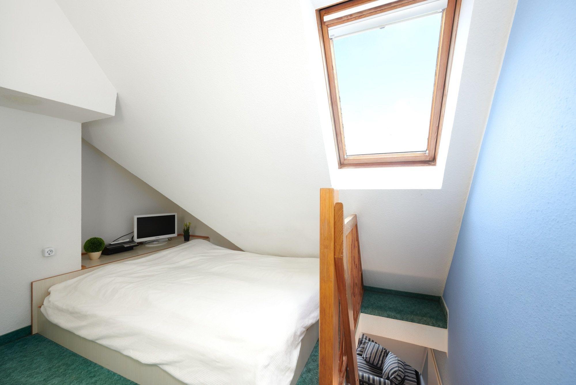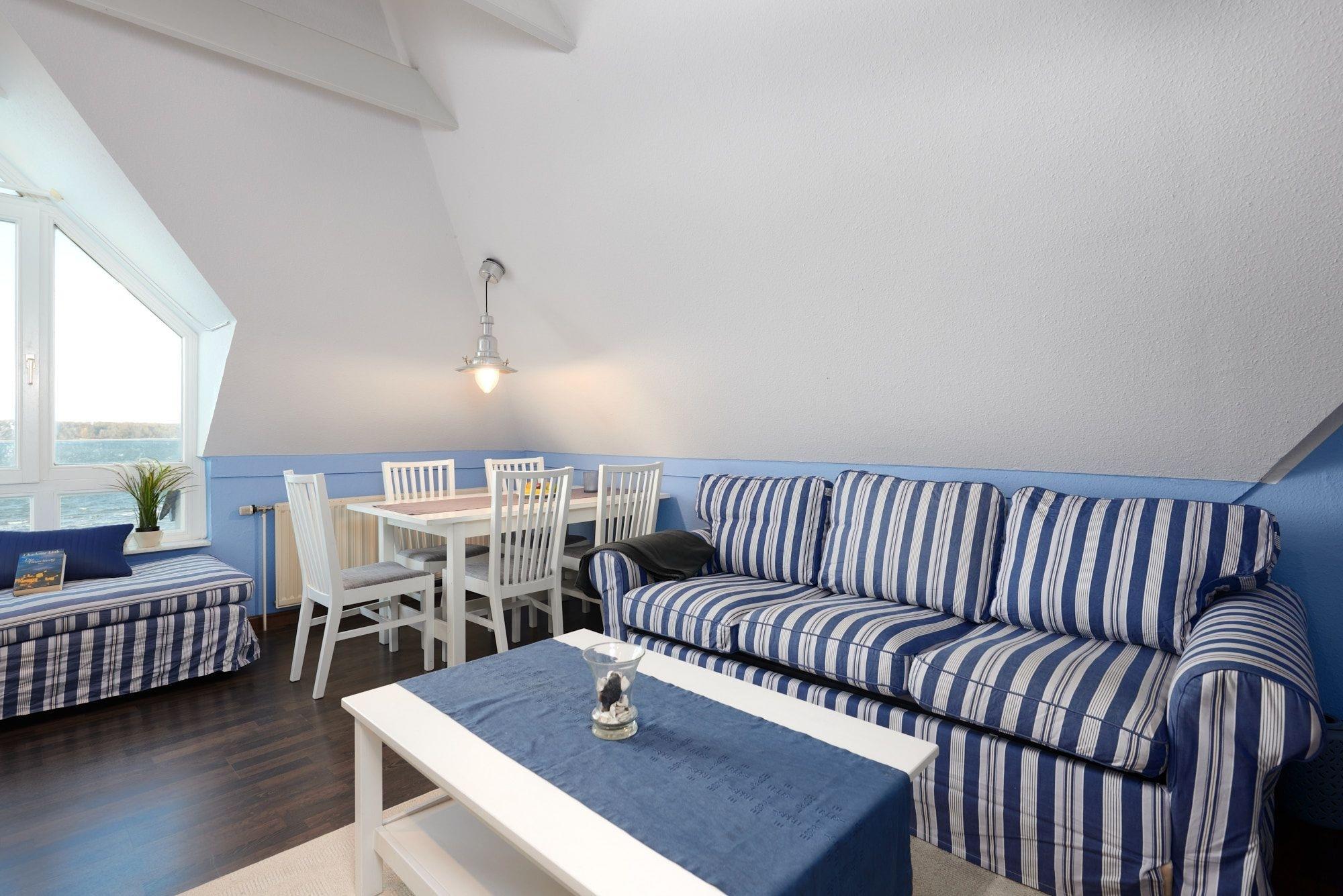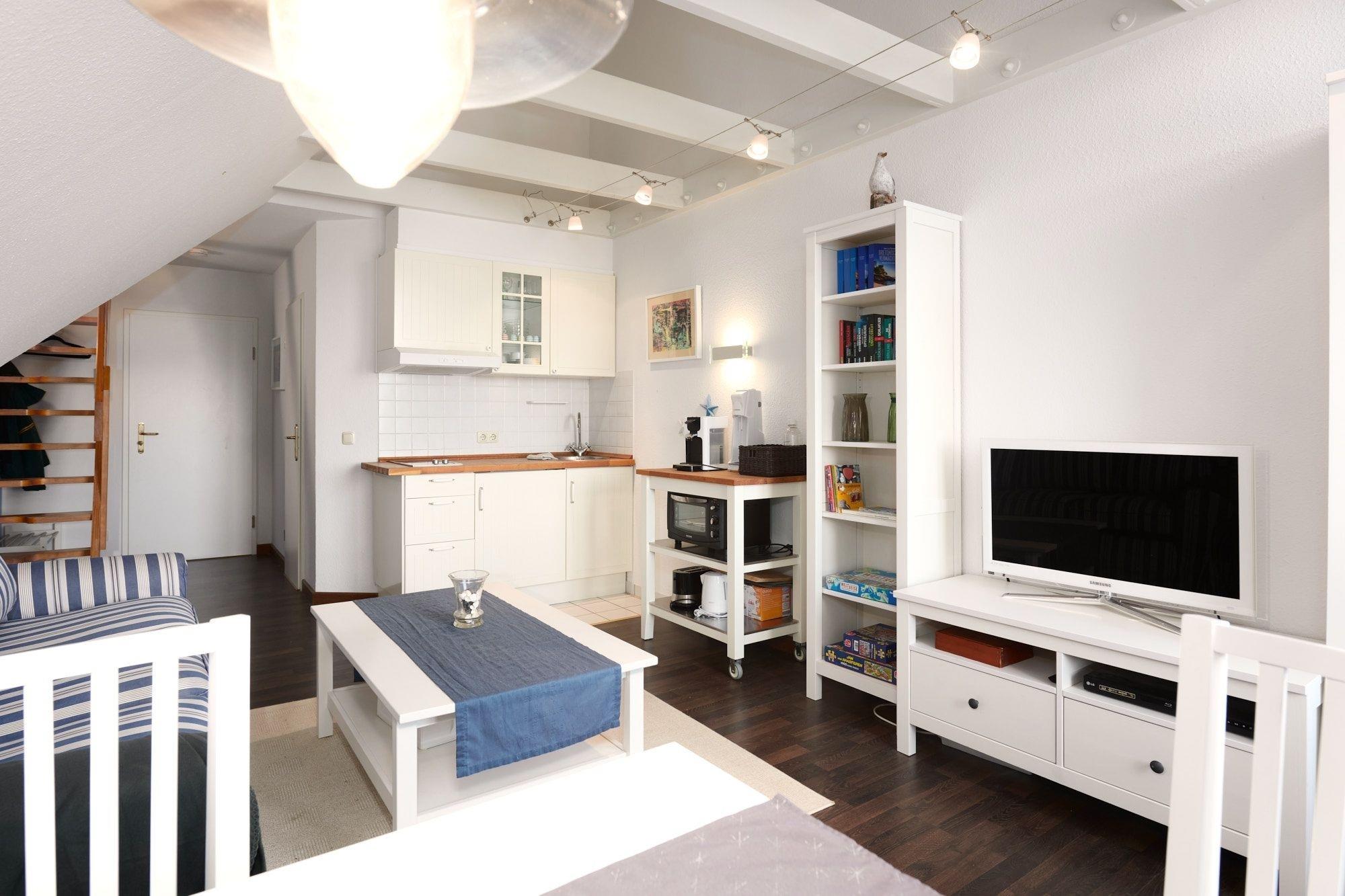 Die Wohnung verfügt über zwei getrennte Schlafzimmer. Bitte beachten Sie, dass der zweite Schlafraum über eine Sambatreppe (Raumspartreppe) zu erreichen ist. Die Wohnung selbst lässt sich bequem mit dem Aufzug erreichen. Es empfängt Sie ein gemütliches Wohnzimmer mit einer Küchenzeile. Ein absolutes Highlight ist die bequeme Récamiere direkt am Fenster, welche zu gemütlichen und ruhigen Momenten einlädt. Von diesem schönen Platz aus haben Sie einen romantischen Blick aufs Meer. Genießen Sie die Aussicht und lassen Sie Ihre Seele bei wunderschönen Sonnenuntergängen baumeln.