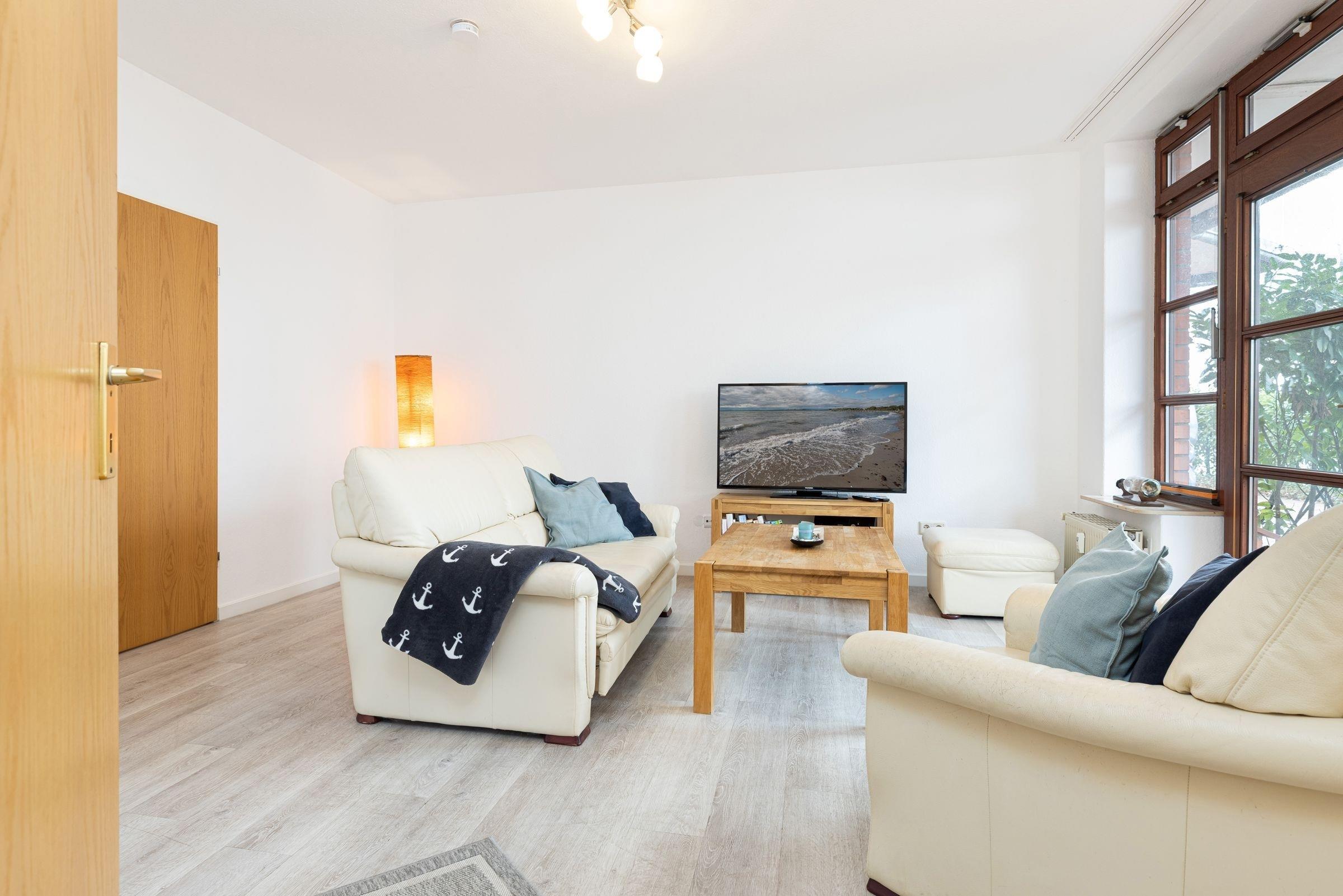 Die modern eingerichtete 3-Zimmer-Ferienwohnung für bis zu 4 Personen befindet sich im Erdgeschoss eines Appartement- und Wohnhauses am Laboeer Hafen mit eingeschränktem Blick auf die Kieler Förde.