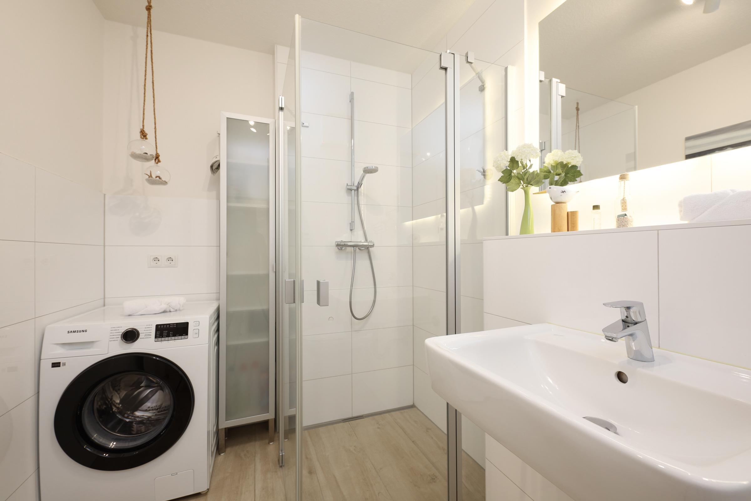 Im Eingangsbereich befindet sich die Garderobe und ein Abstellbereich, in dem Sie sowohl Reinigungsutensilien als auch ein separaten Gefrierschrank finden. Das davon abgehende Badezimmer ist großzügig gestaltet mit einer ebenerdigen Dusche und einem Waschtrockner. Im separaten Schlafzimmer fühlen Sie sich in einem 50 cm hohem, 1,80 m breiten, am Fußende offenen Doppelbett wohl, ein großer Schiebetür-Schrank bietet Ihrer Urlaubskleidung mehr als ausreichend Platz. Ablagemöglichkeiten, dimmbare Leselampen und ein kleiner Flatscreen-TV mit integriertem DVD-Player runden die Gemütlichkeit ab. Der offene Wohnbereich verfügt über eine hochwertige Hochglanz-Küche, die mit Markengeräten (Backofen, Mikrowelle, Wasserkocher, Kaffeemaschine, Senseo-Pad-Maschine, Eierkocher) ausgestattet ist. Es schließt ein Essbereich mit Leder bezogener Bank und Stühlen an. An der Fensterfront entspannen Sie auf einem bequemen Leder-Schlafsofa, auf dem Wohlfühl-Sessel lesen Sie ein gutes Buch, hören Musik oder lassen sich vom Fernsehprogramm berieseln. Vom Wohnbereich gelangen Sie auf die Terrasse. Dort genießen Sie die Sommerstrahlen auf den Gartenmöbeln oder im eigenen Strandkorb.