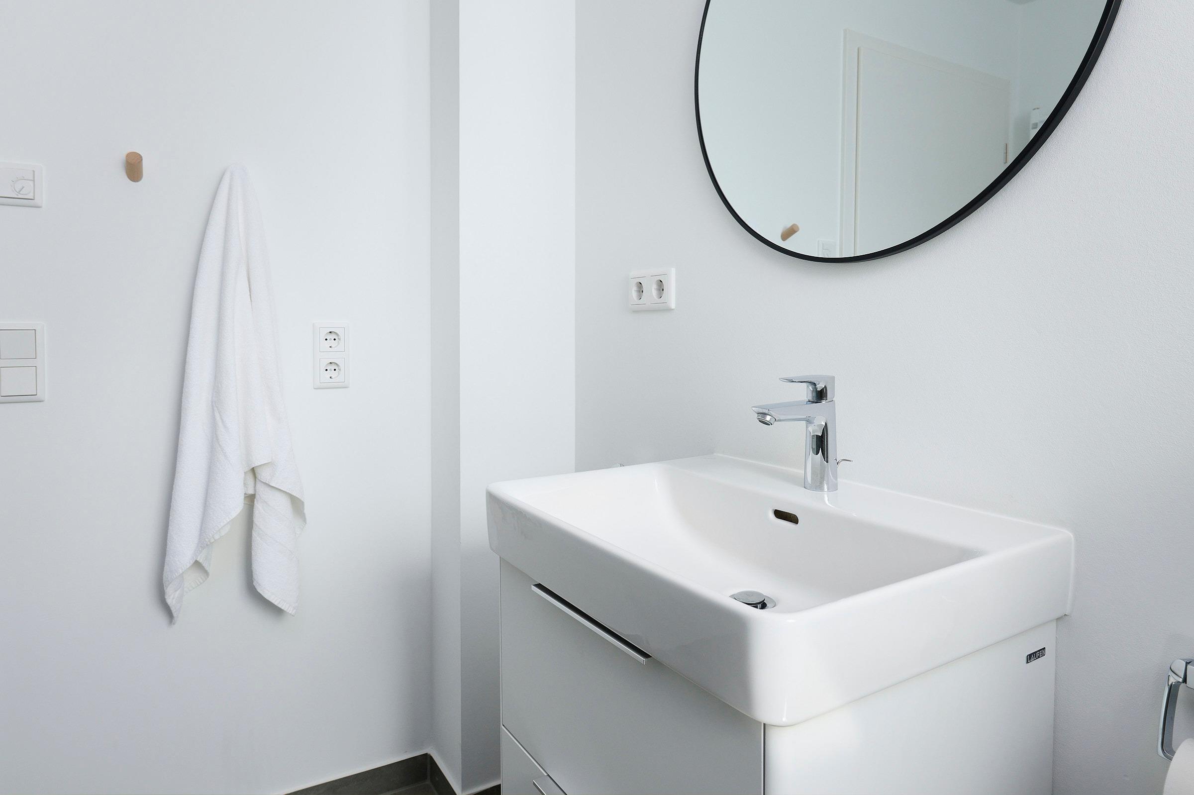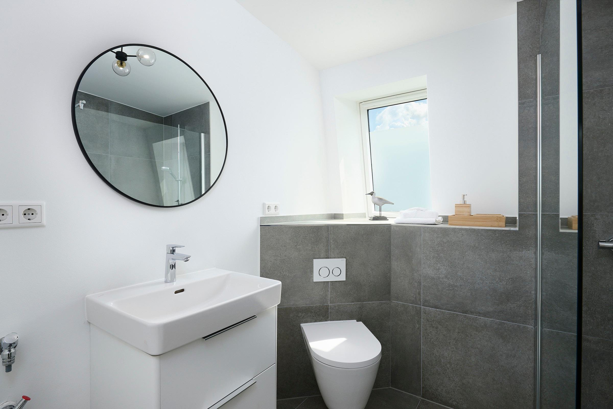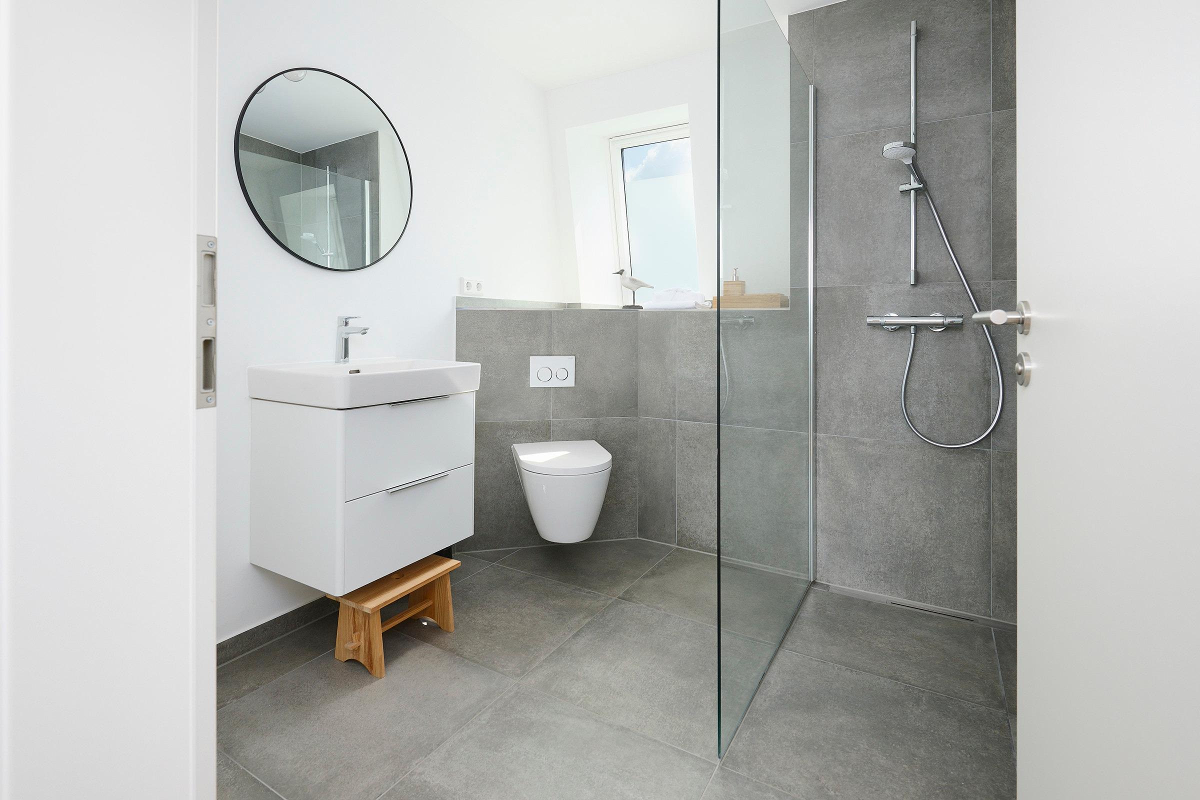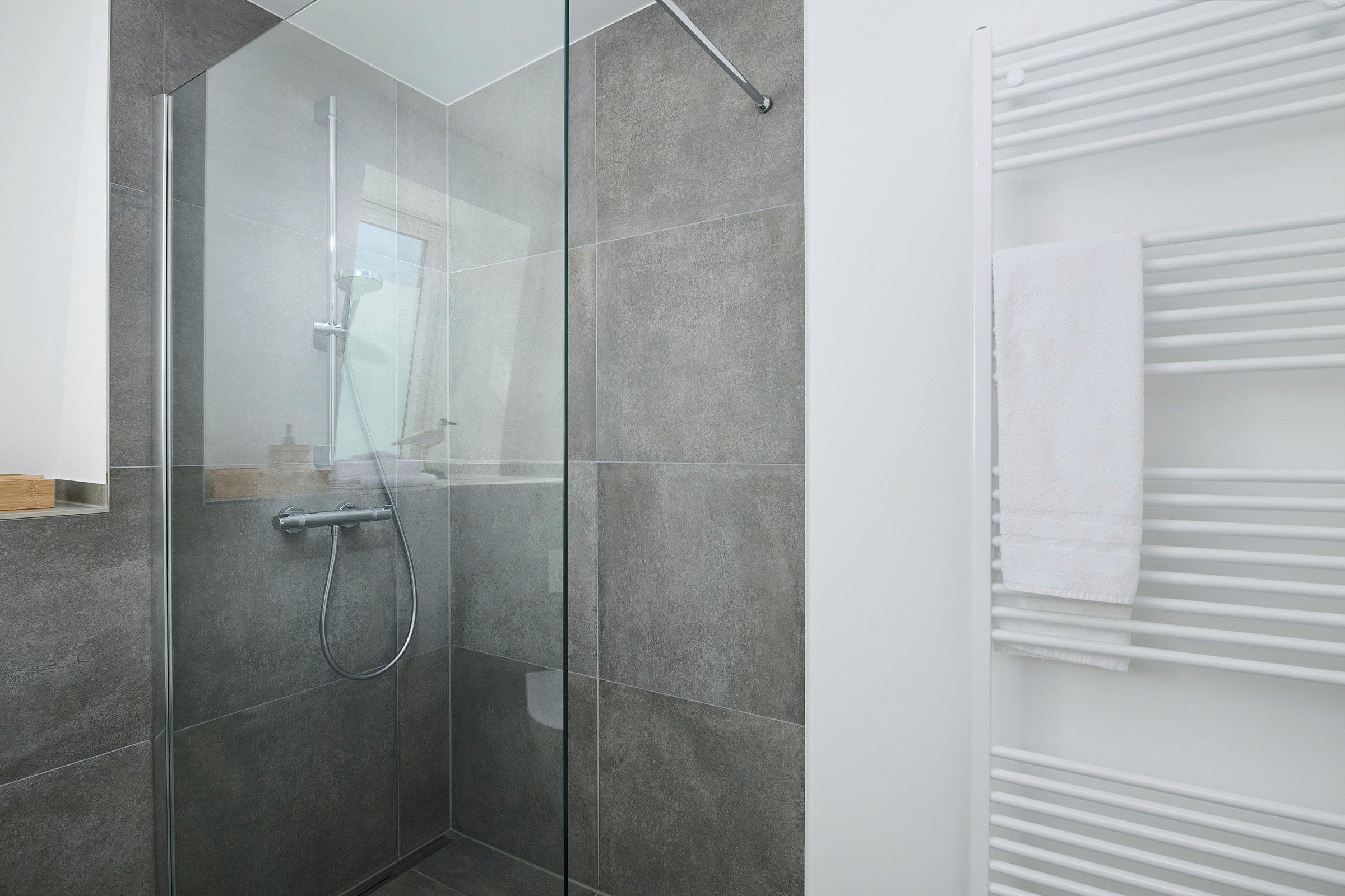 Das Bad verfügt über eine barrierearme, ebenerdige Dusche und Ablagemöglichkeiten für Ihre Kosmetikartikel. Im gesamten Apartment befindet sich eine Fußbodenheizung für angenehme Wärme. Über eine von innen zu bedienende Außenjalousie können Sie alle Räume verdunkeln. Für besonders heiße Tage steht Ihnen in der Wohnung noch ein großer Standventilator zur Verfügung.